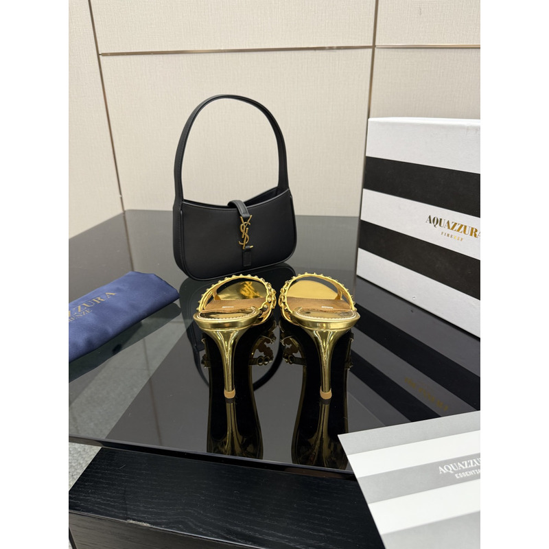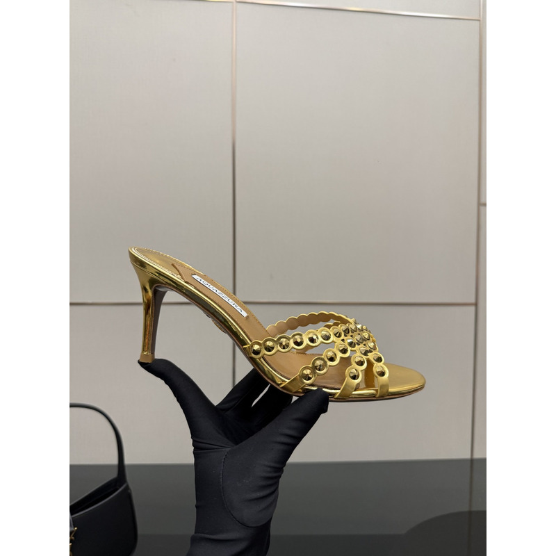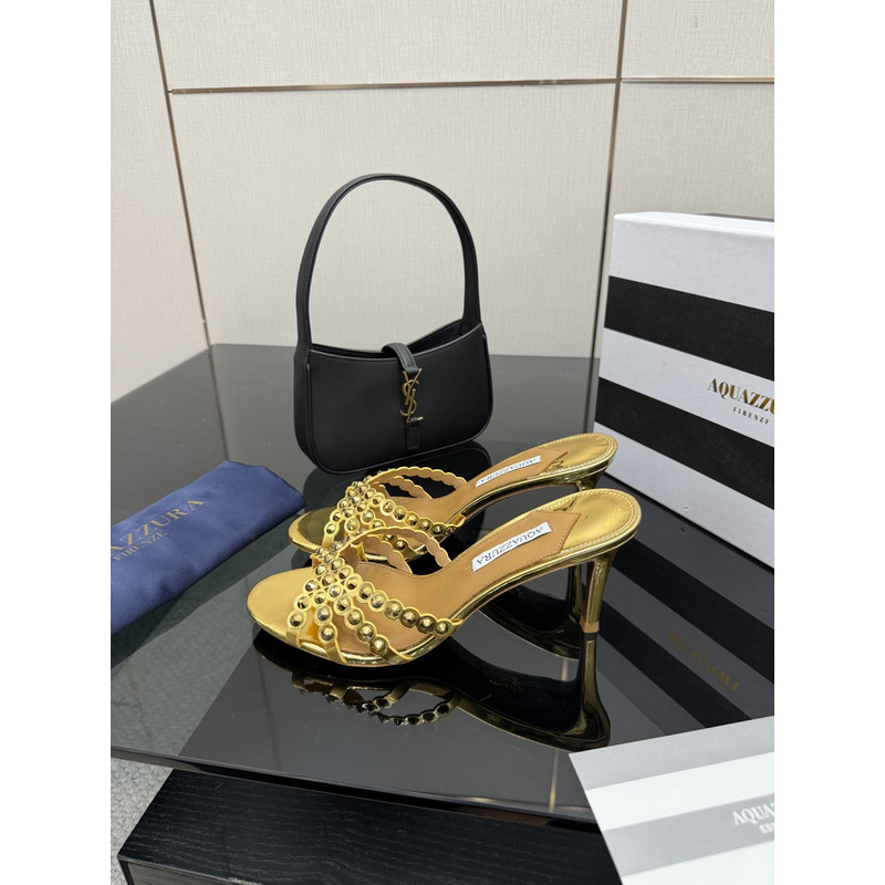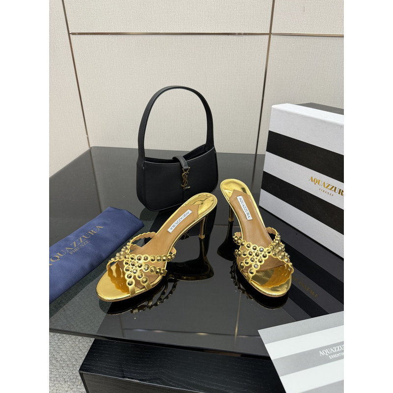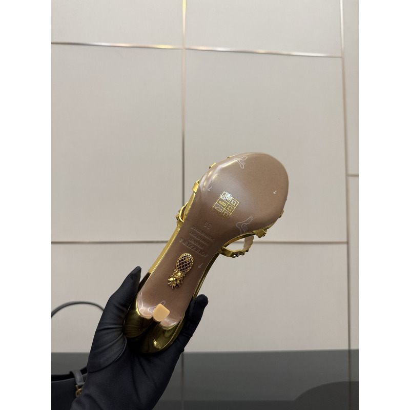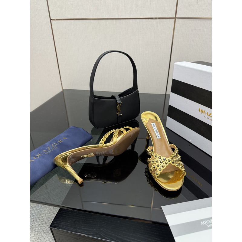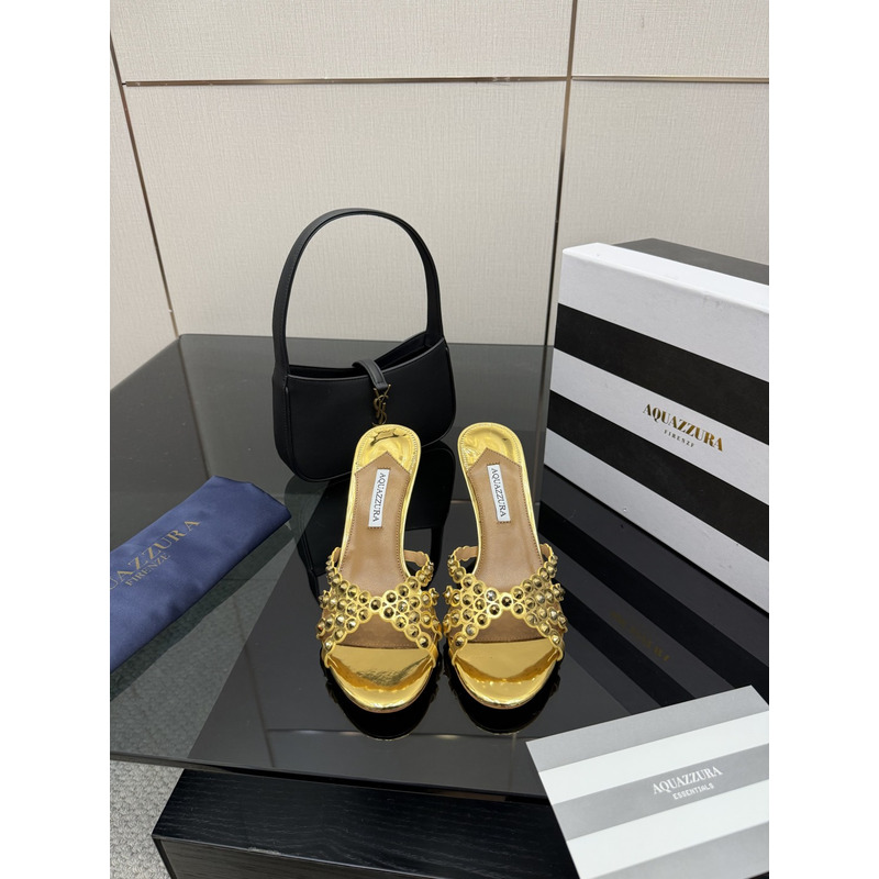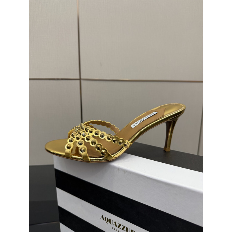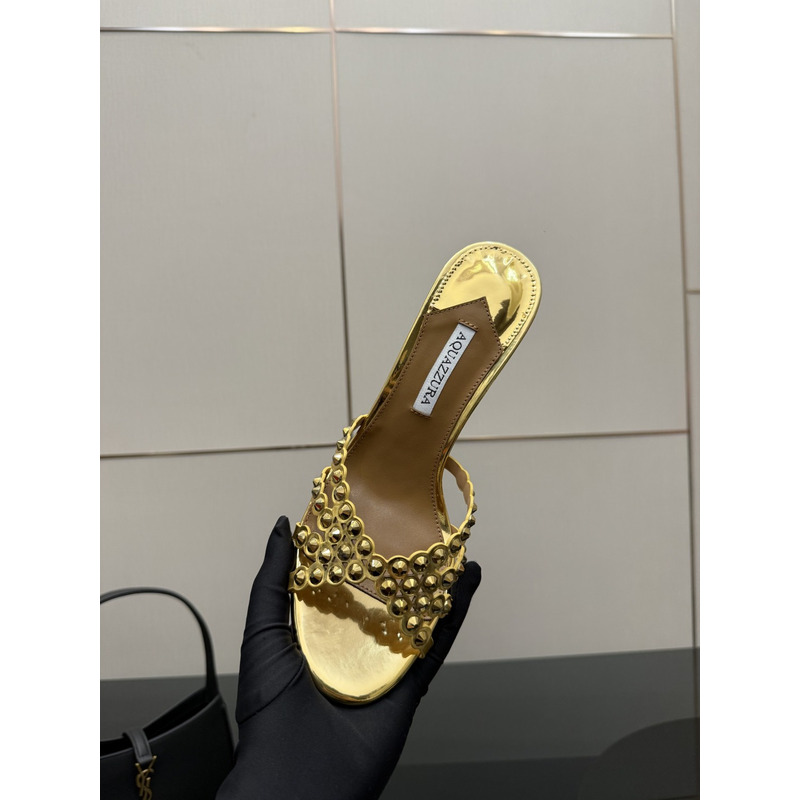Aquazzura Crystal-Embellished Metallic Gold Laminated Mules