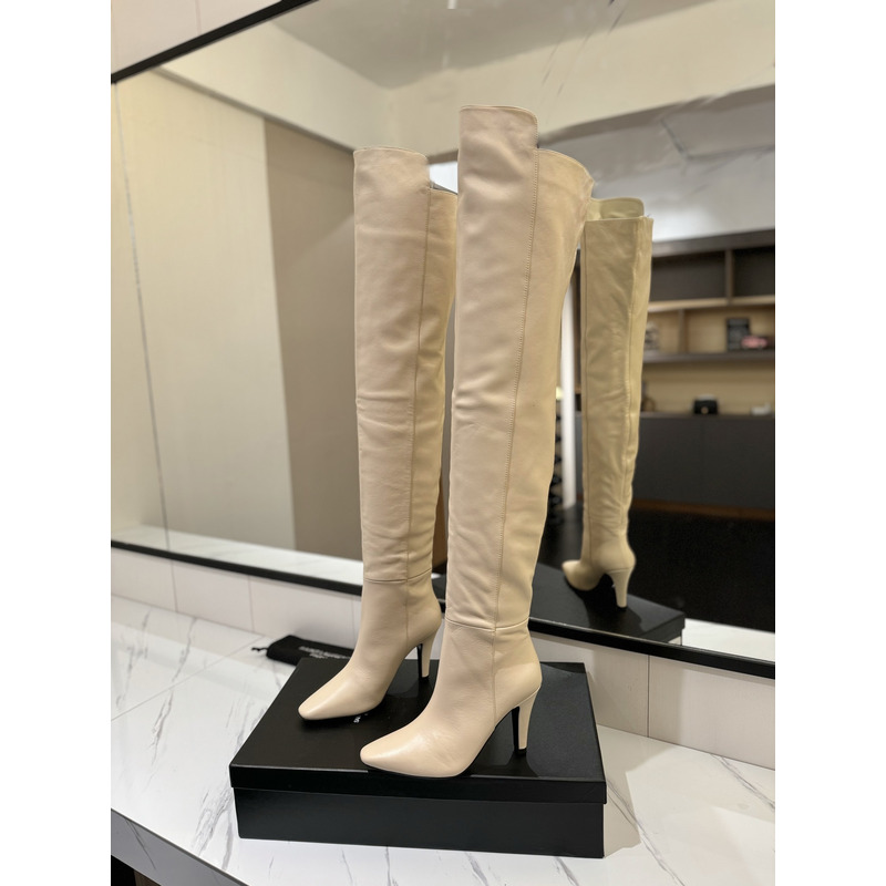 Saint Laurent Over-the-Knee Heeled Boots In Ivory Leather