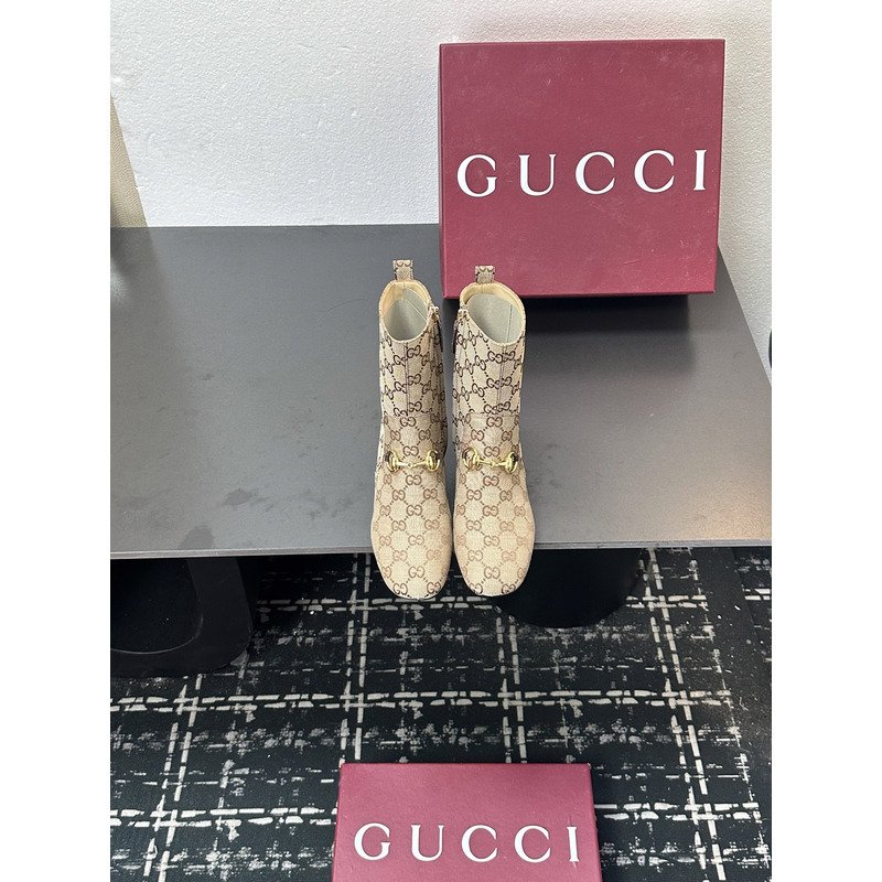 Gucci GG Pattern Horsebit Ankle Boots Beige