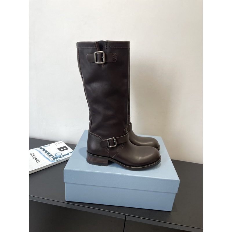 Prada Calf Leather Knee-High Boots With Buckle In Brown