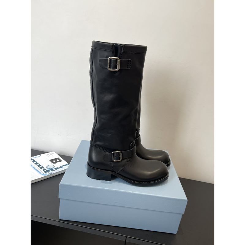 Prada Calf Leather Knee-High Boots With Buckle In Black