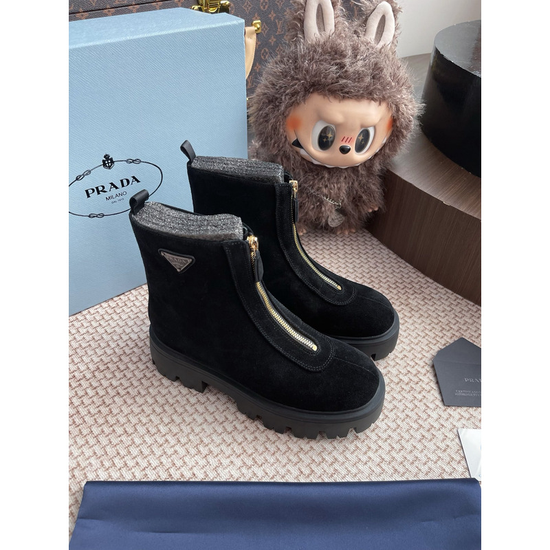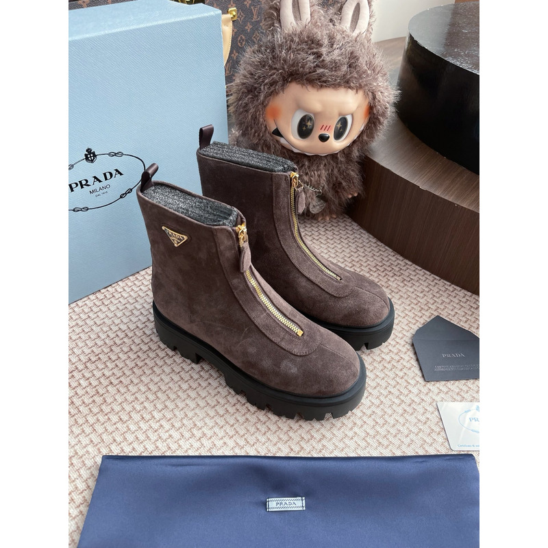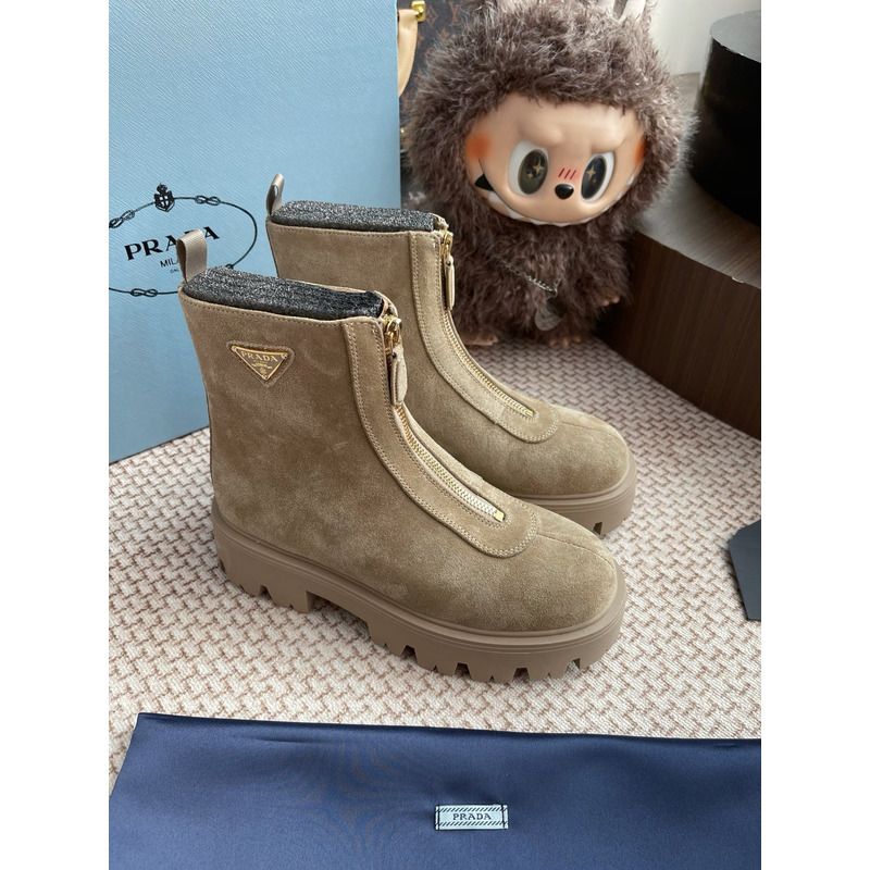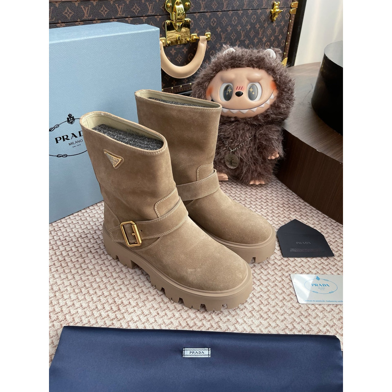 Prada Suede Buckle-Strap Lug-Sole Boots In Beige
