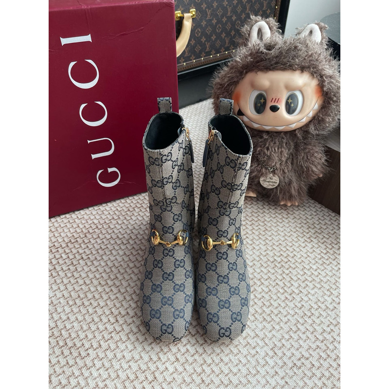 Gucci Horsebit GG Supreme Canvas Ankle Boots In Grey/Navy