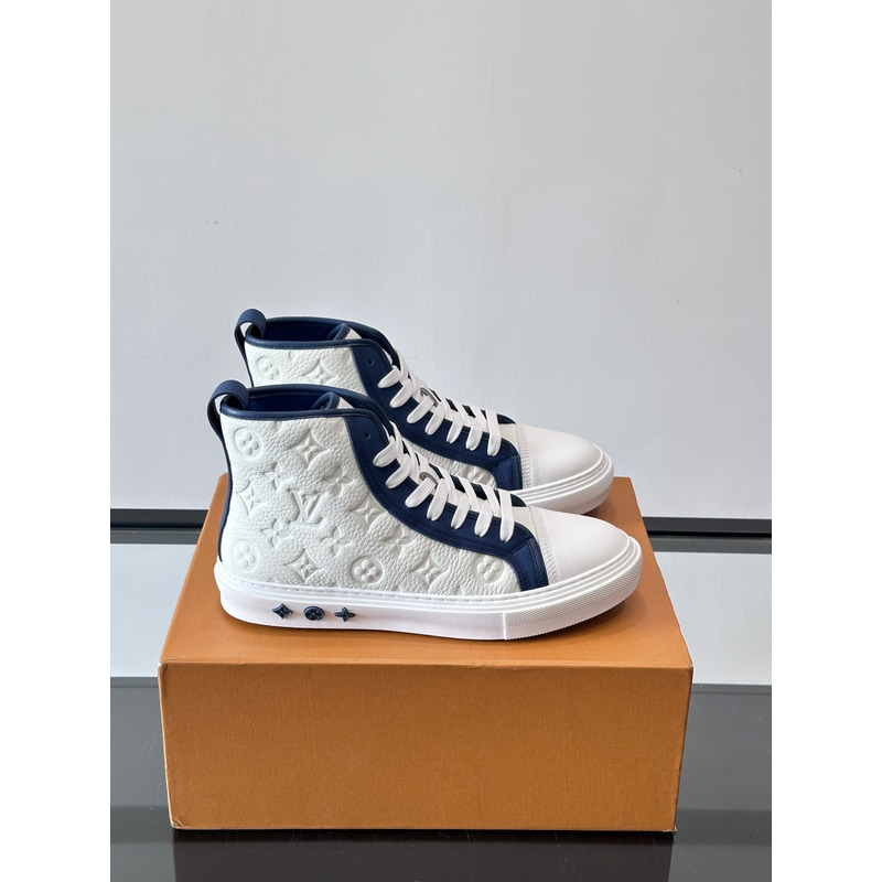 Louis Vuitton White And Navy Monogram Embossed High-Top Sneakers