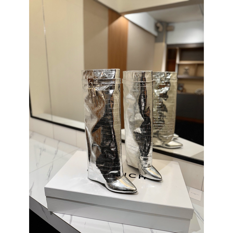 Givenchy Silver Crocodile-Embossed Leather Shark Lock Knee-Length Boots