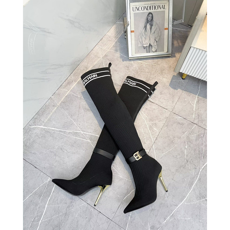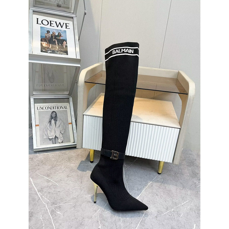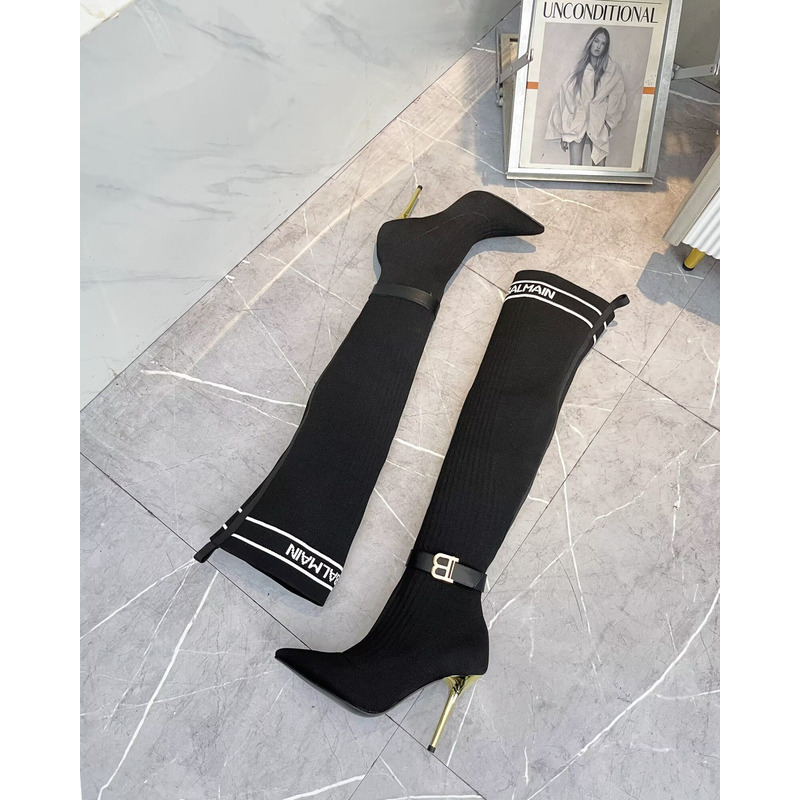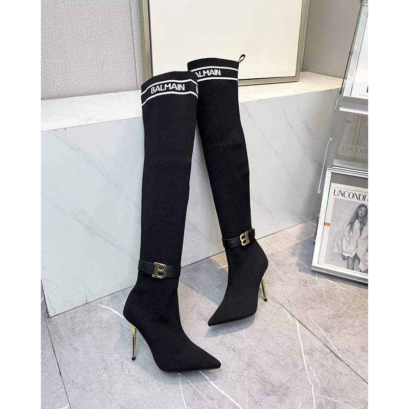 Balmain Logo-Trimmed Rib-Knit Over-The-Knee Stiletto Boots Black