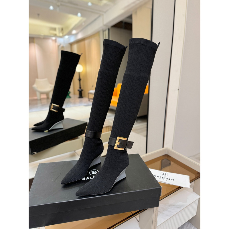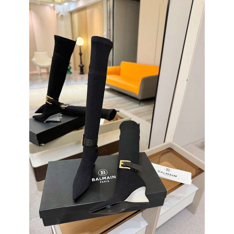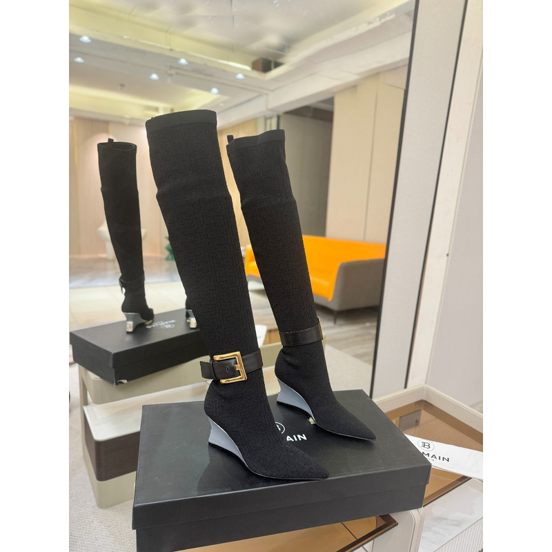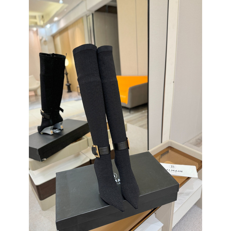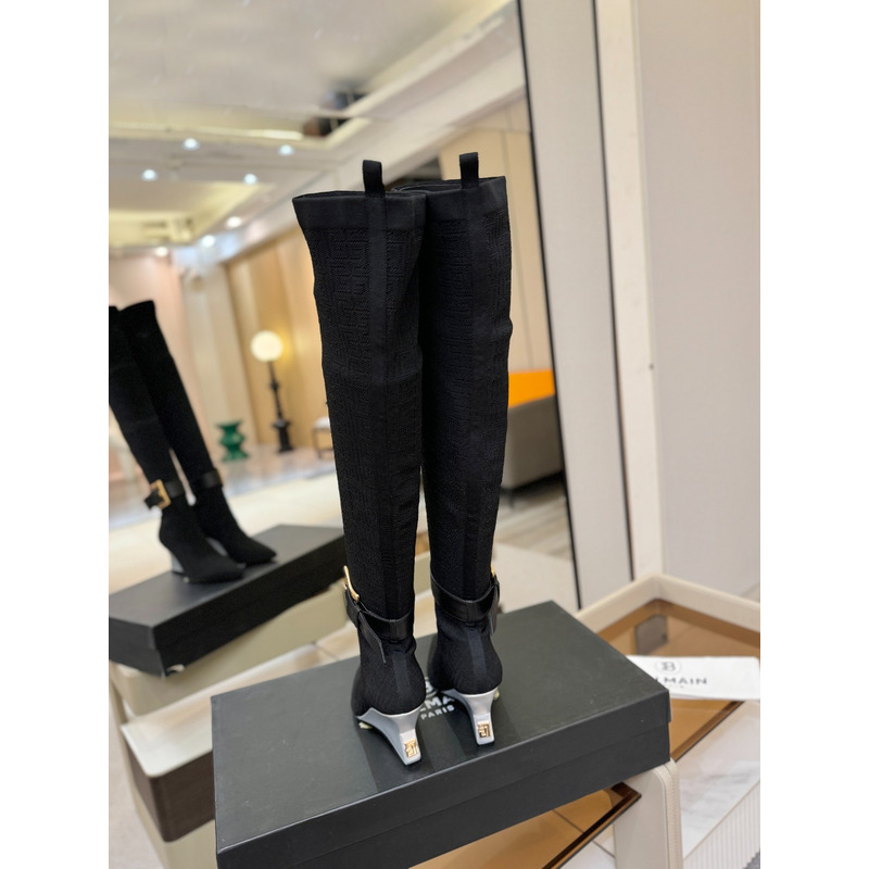 Balmain Monogram-Jacquard Knee-High Boots In Black