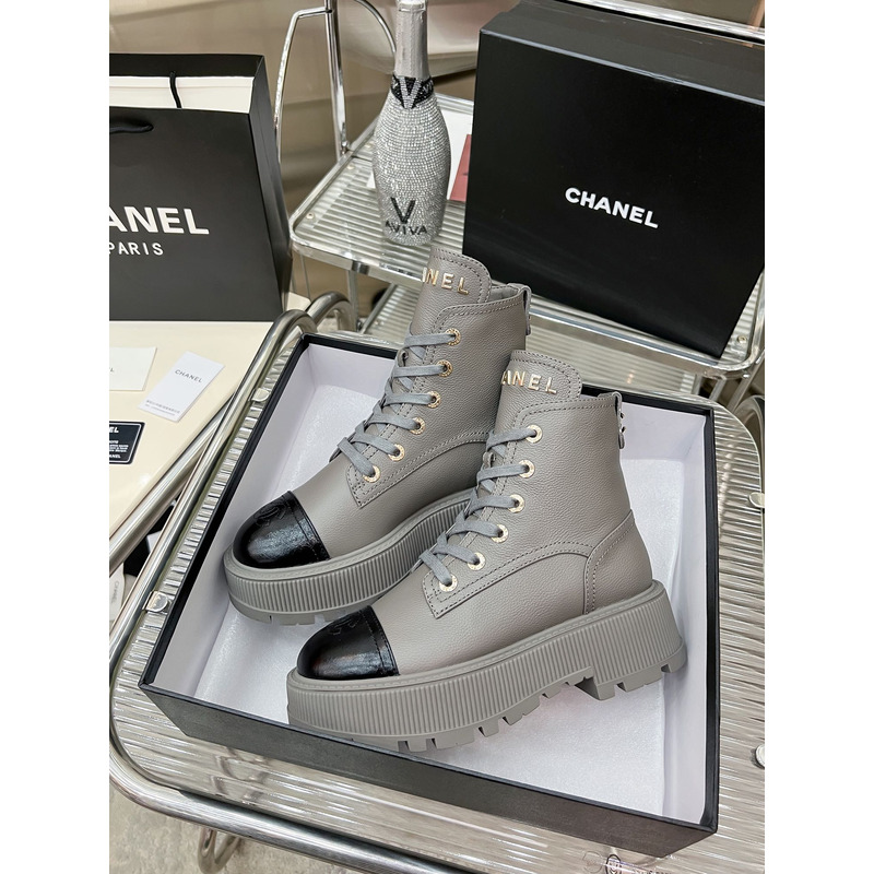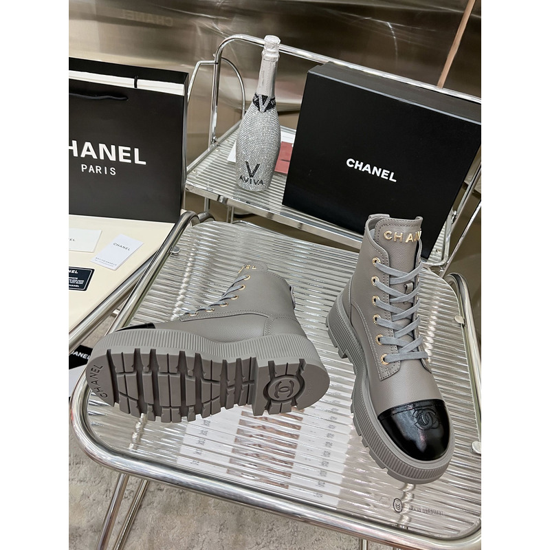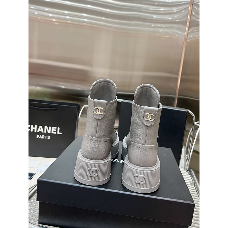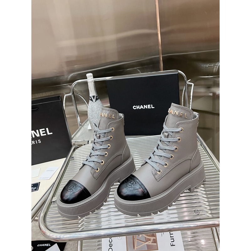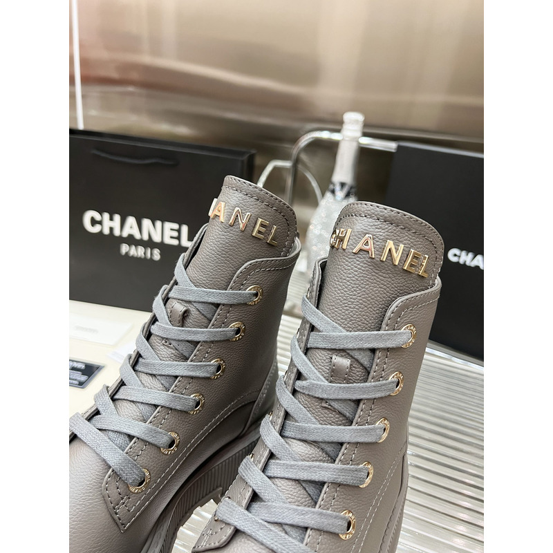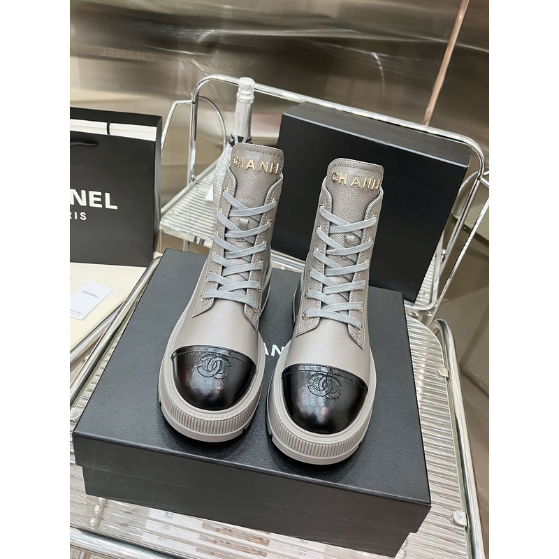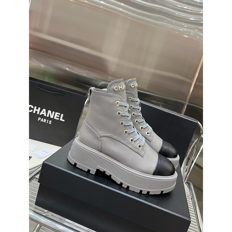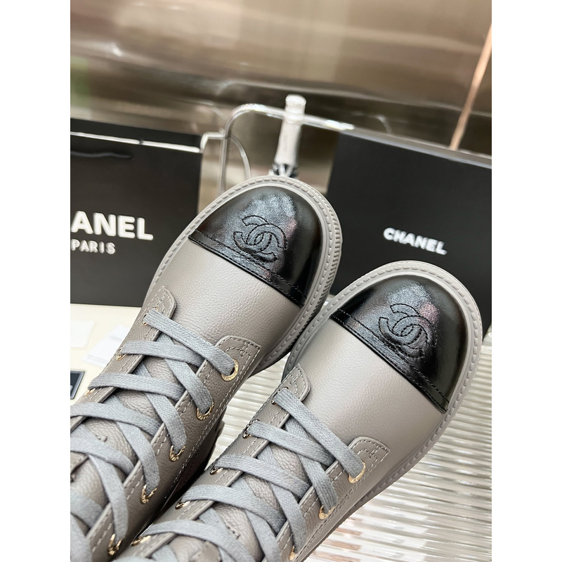 Chanel Grey Leather Lace-Up Ankle Boots With Black Toe Cap