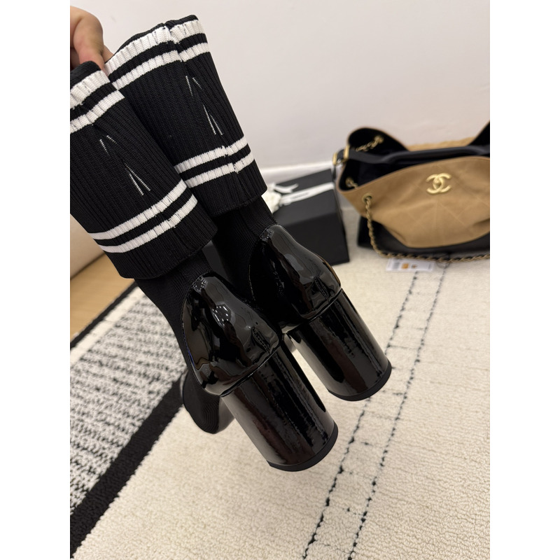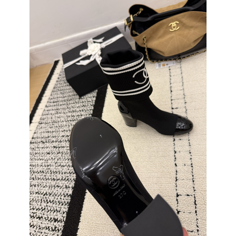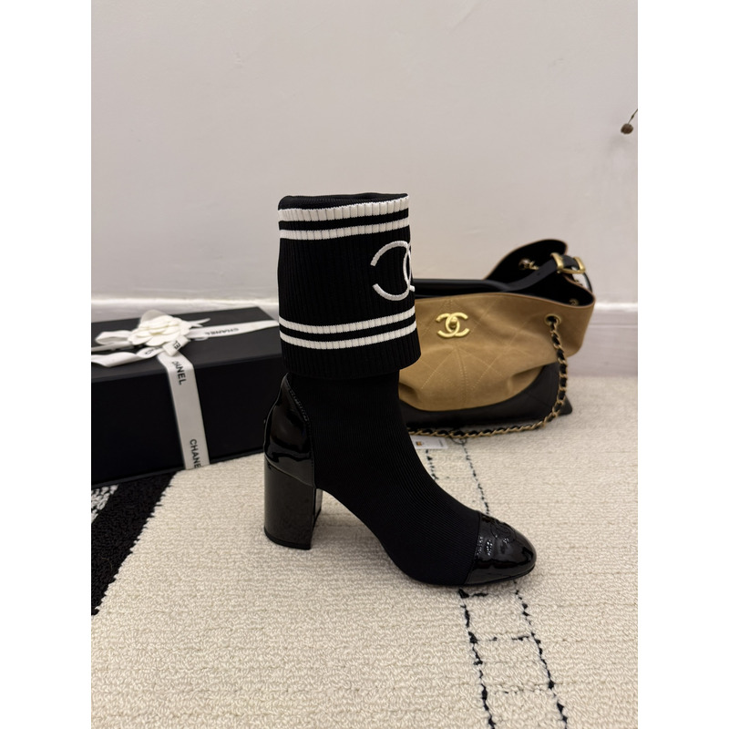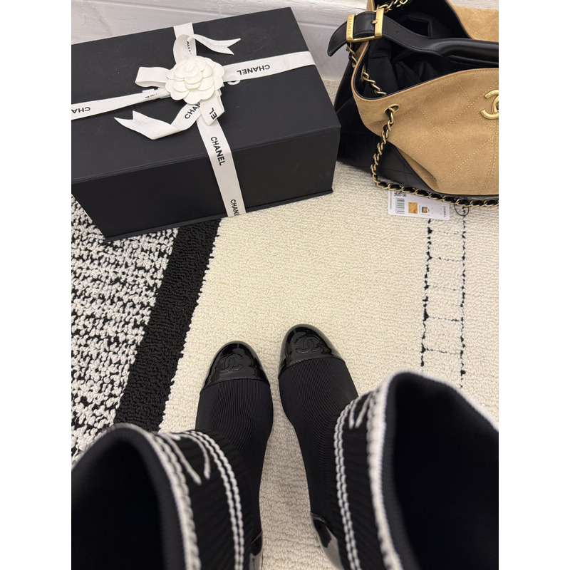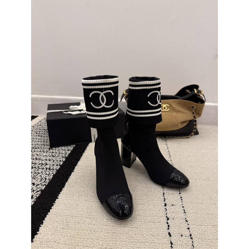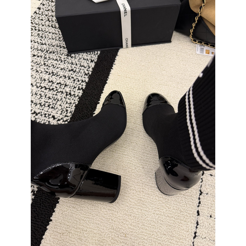 Chanel Interlocking CC Logo Knit & Patent Leather Ankle Boots In Black