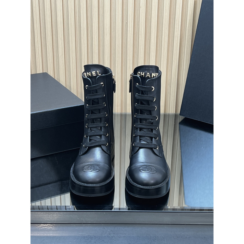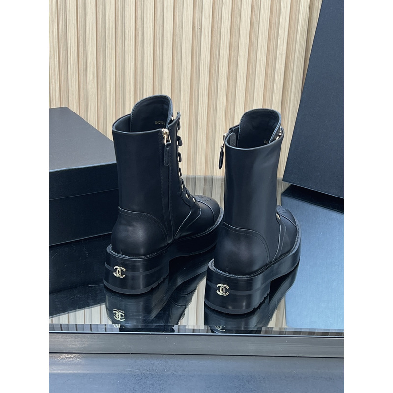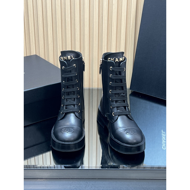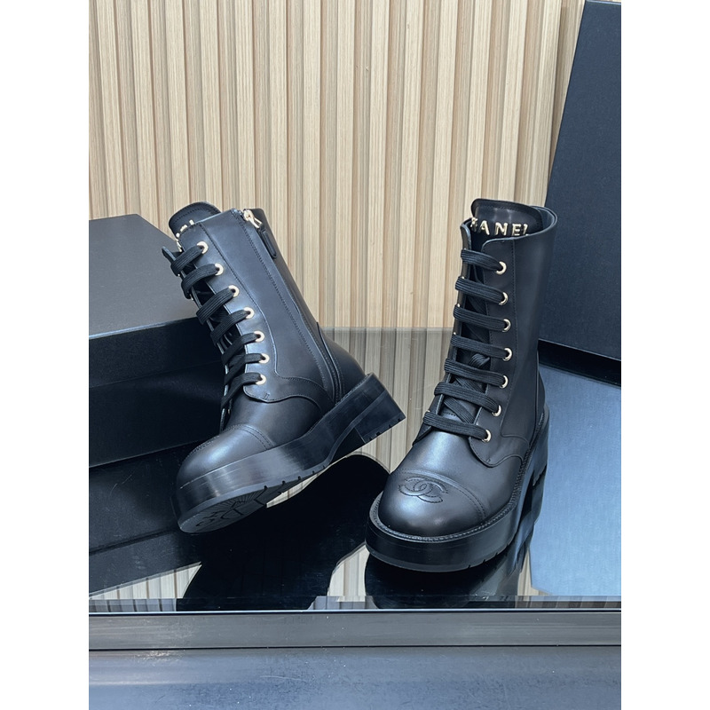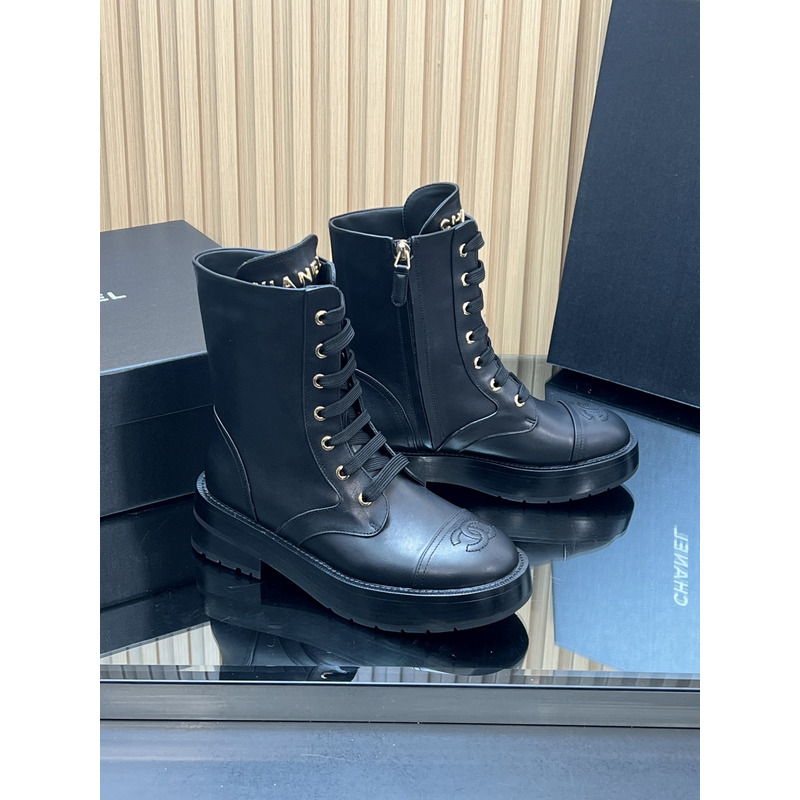 Chanel Leather Combat Boots With CC Logo & Gold-Tone Hardware