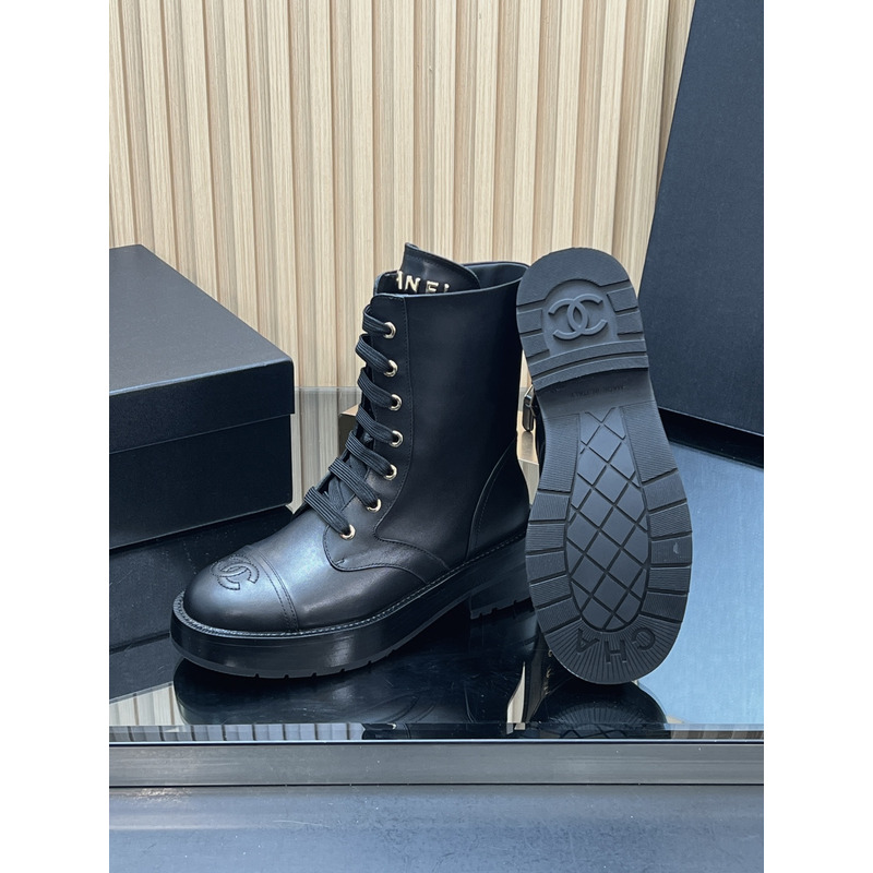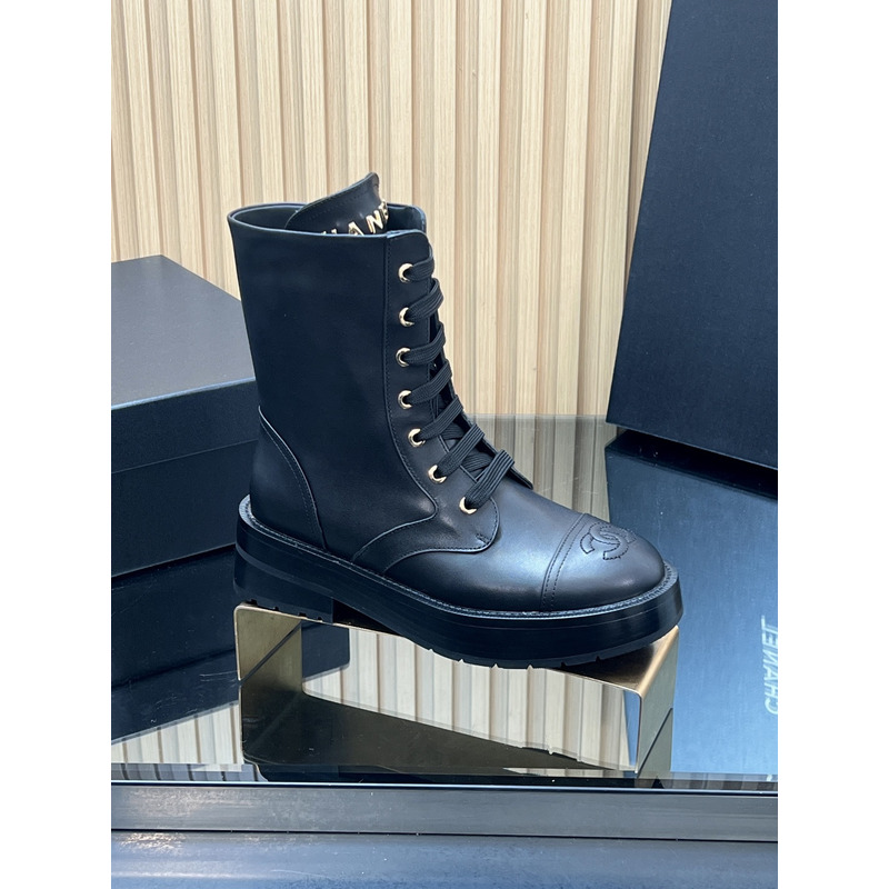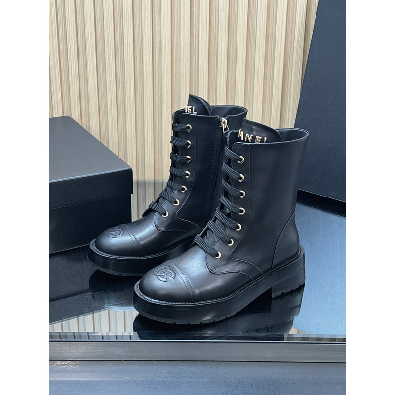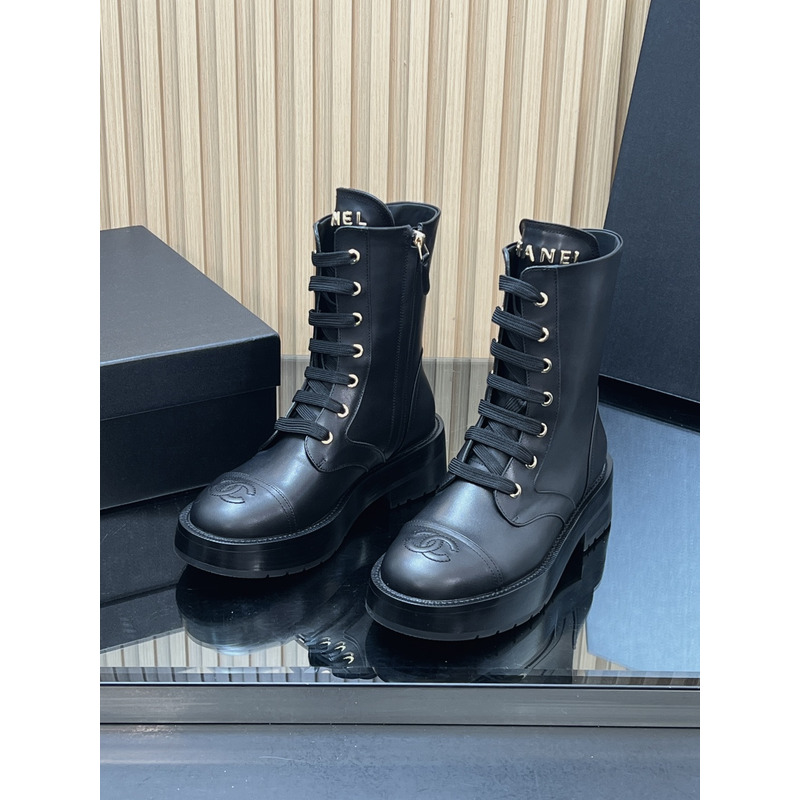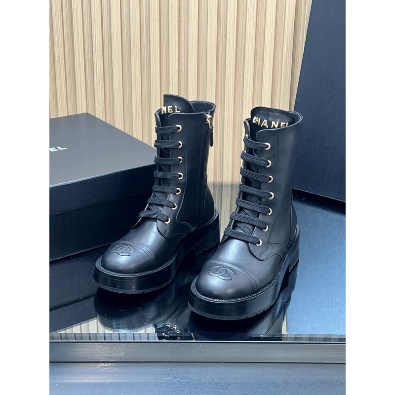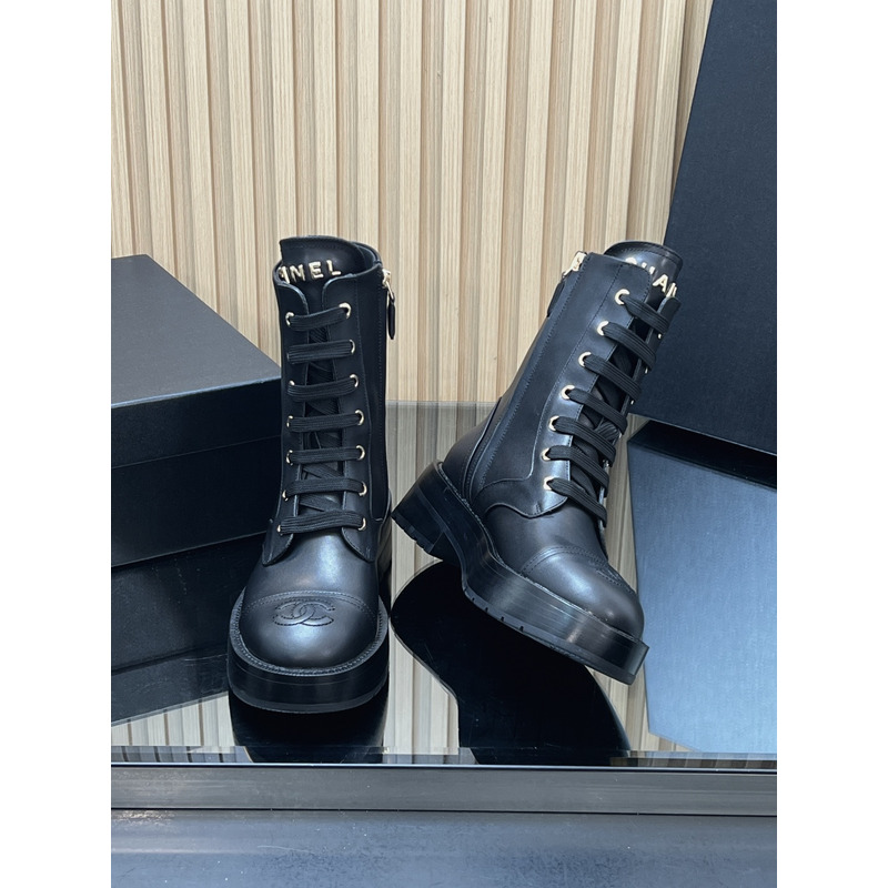 Chanel Leather Combat Boots With CC Logo & Gold-Tone Hardware