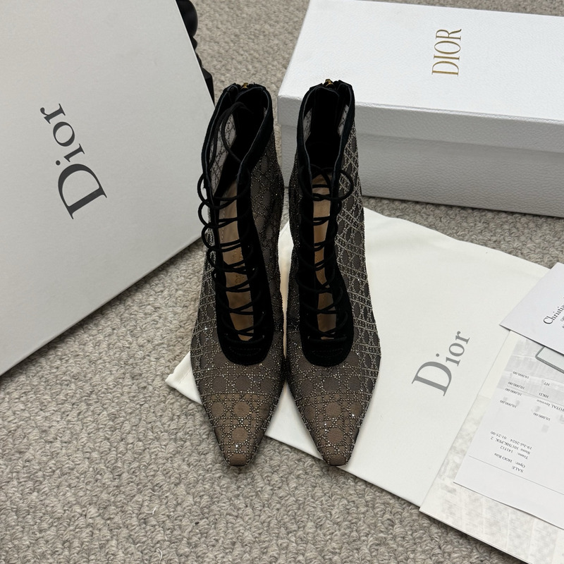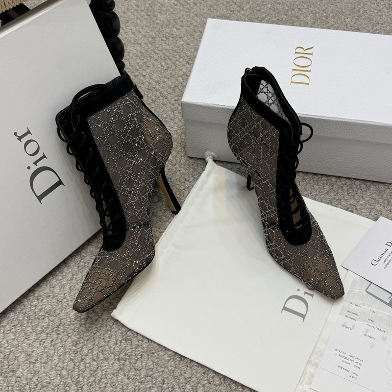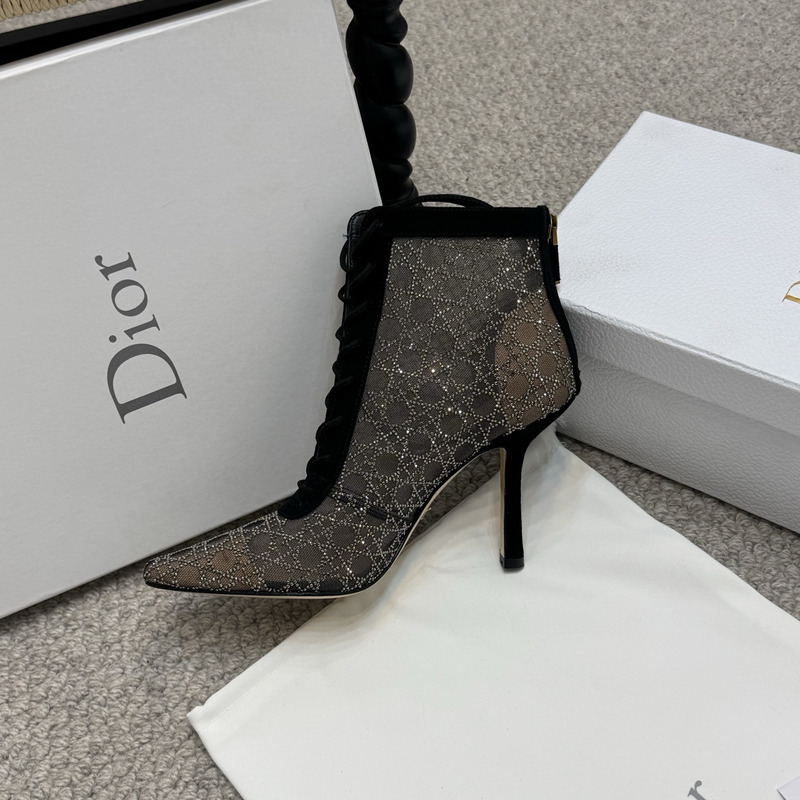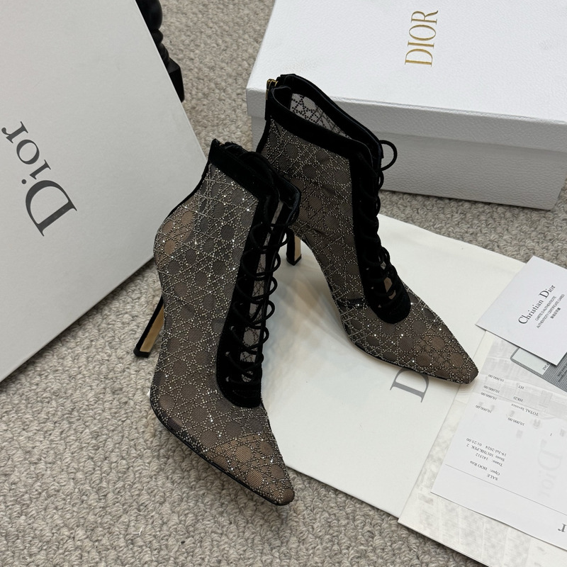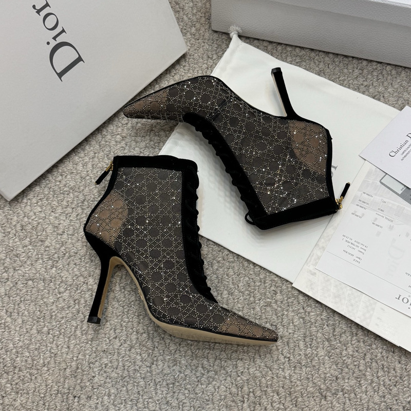 Dior Capture Heeled Ankle Boot Transparent Mesh with Black-Tone Strass Cannage Motif and Black Suede Goatskin