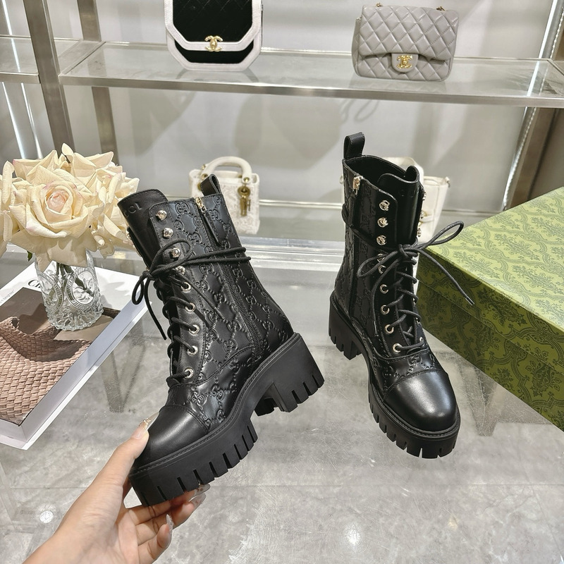 Gucci Women\'s Lace-Up Ankle Boot With GG Black Leather