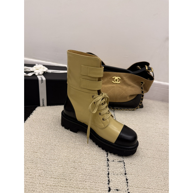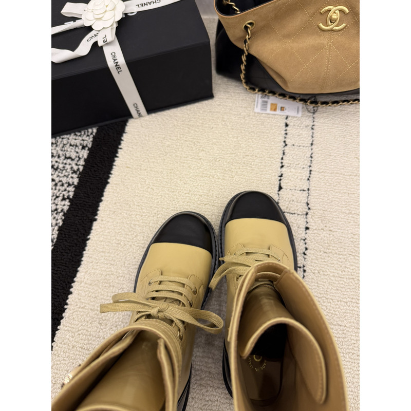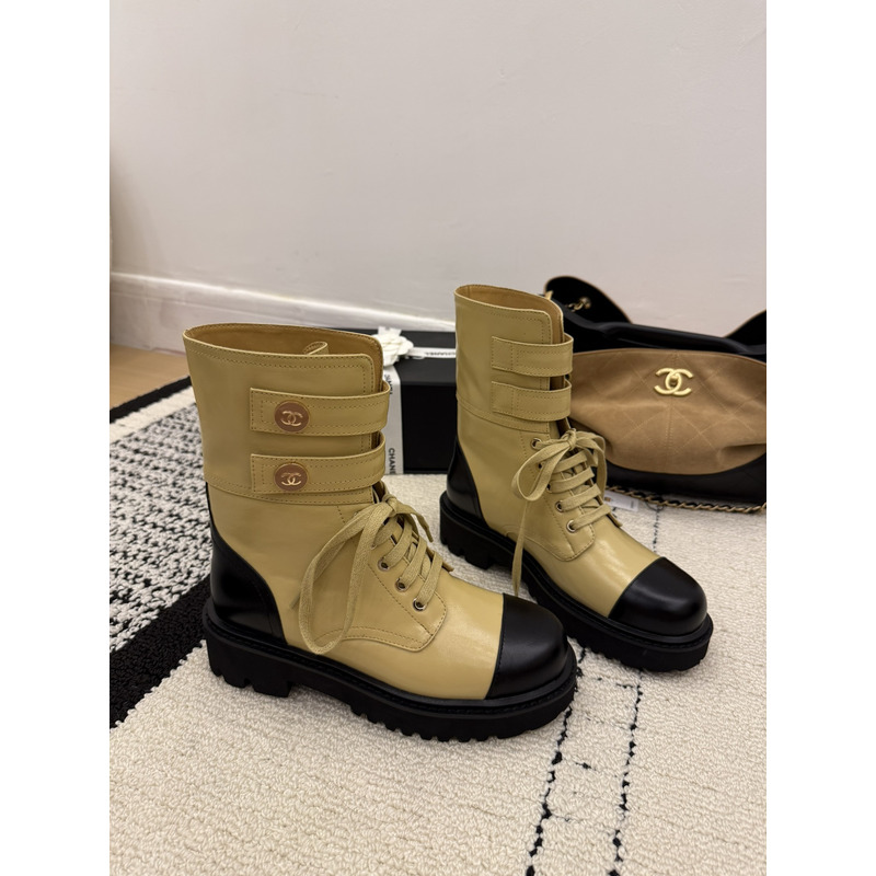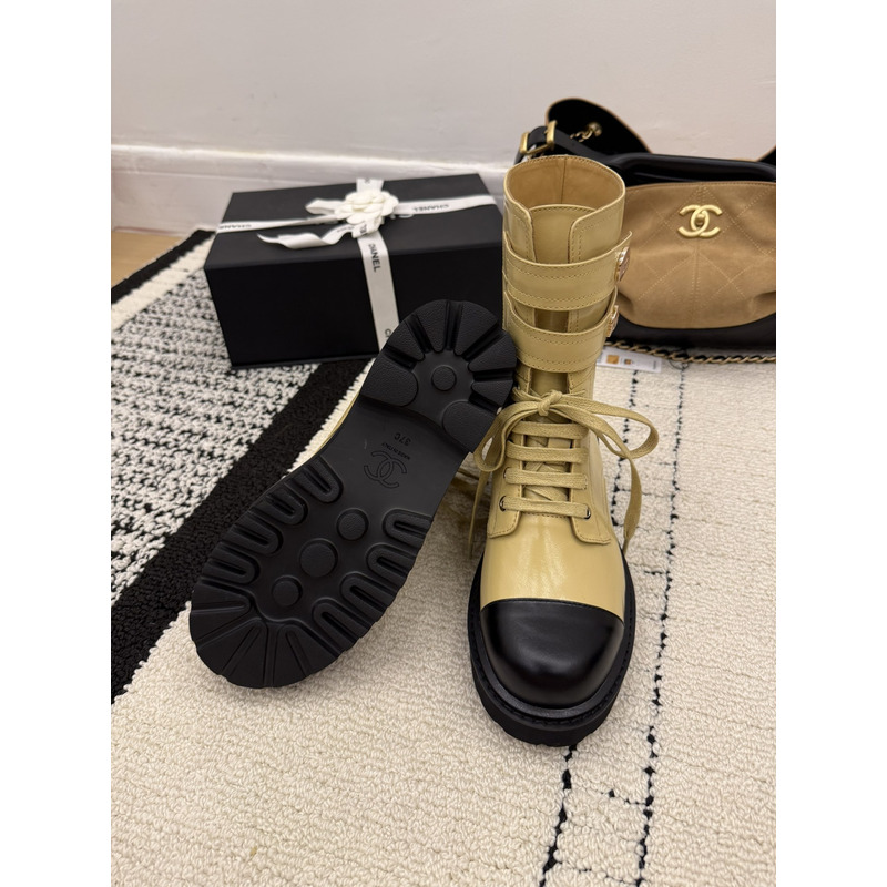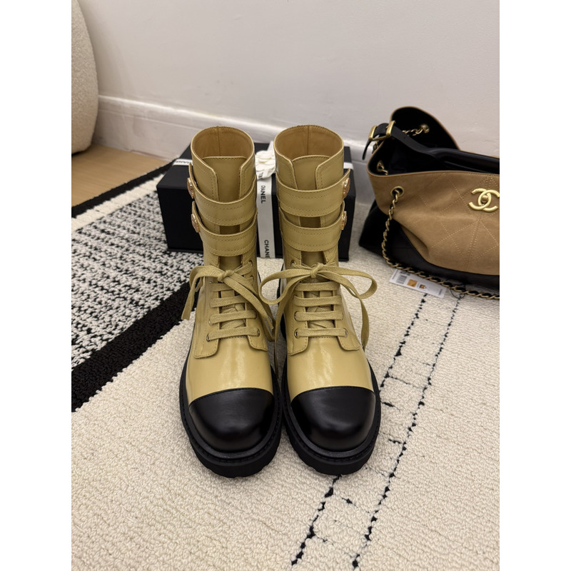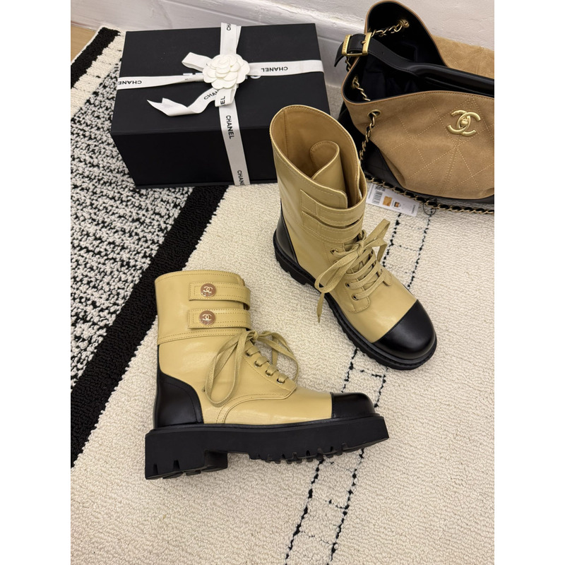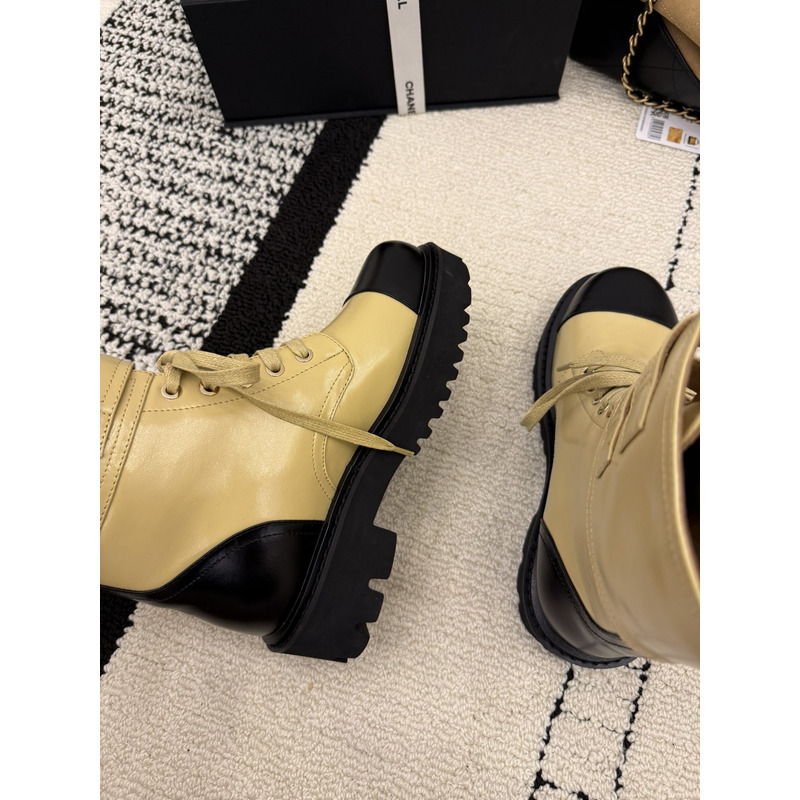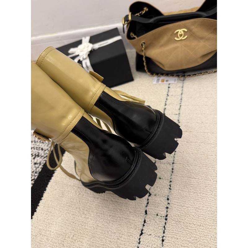 Interlocking CC Logo Combat Boots In Beige & Black Leather