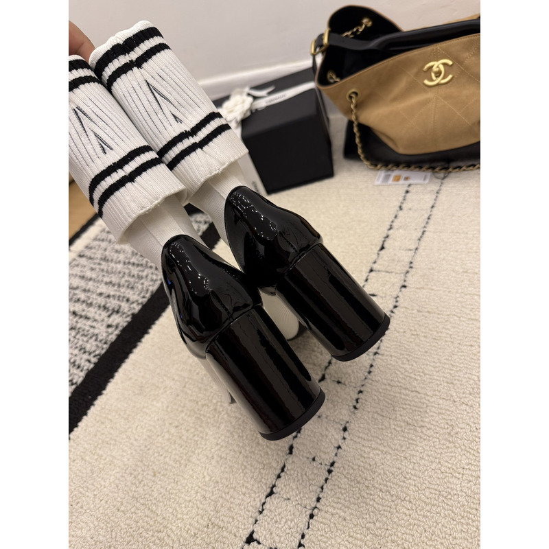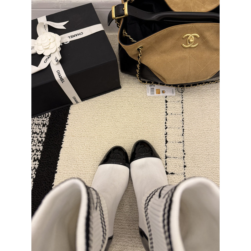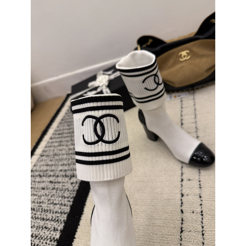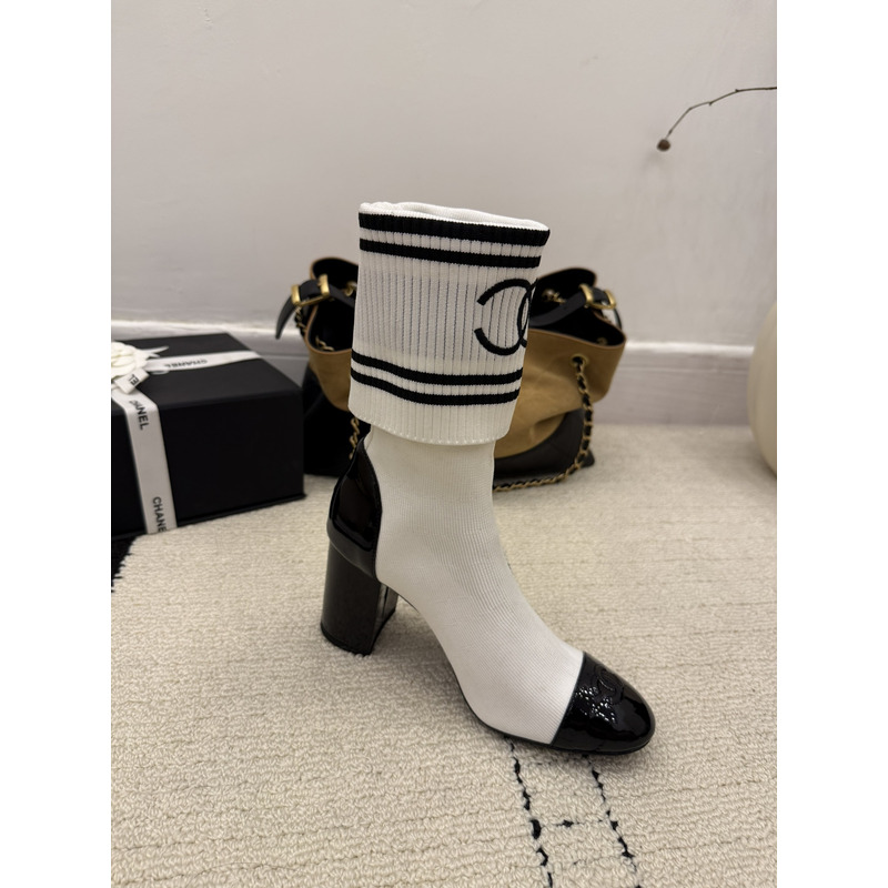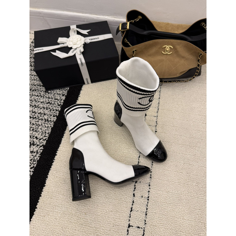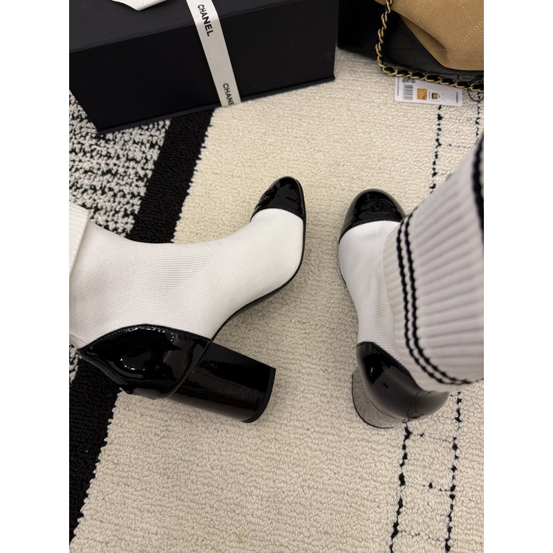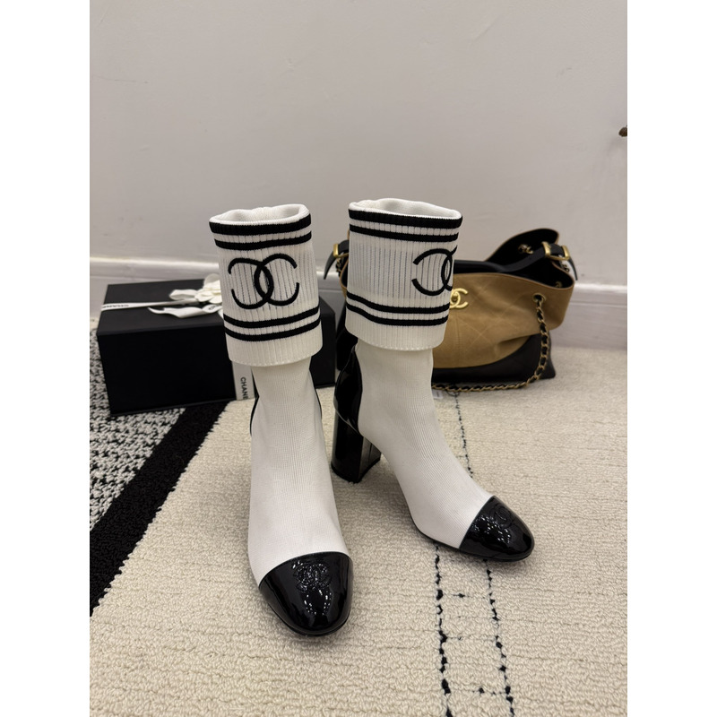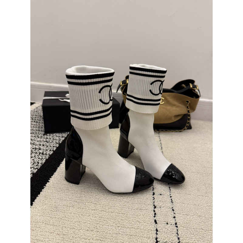 Interlocking CC Logo Knit & Patent Leather Ankle Boots In White