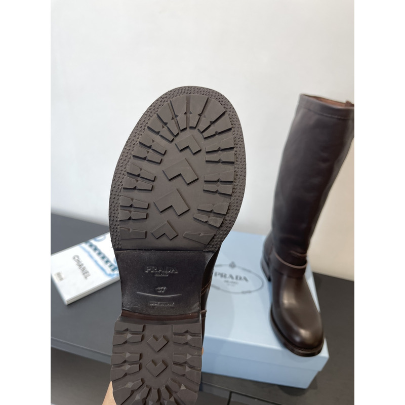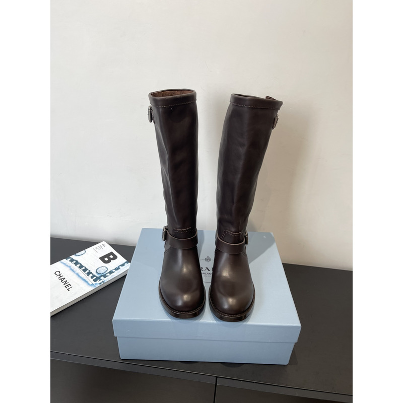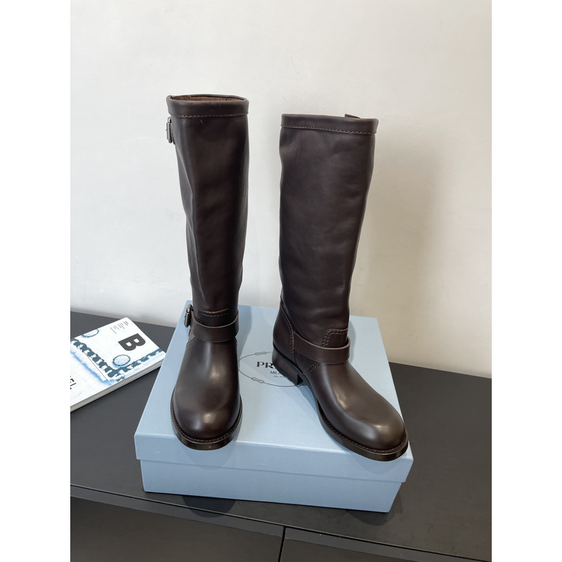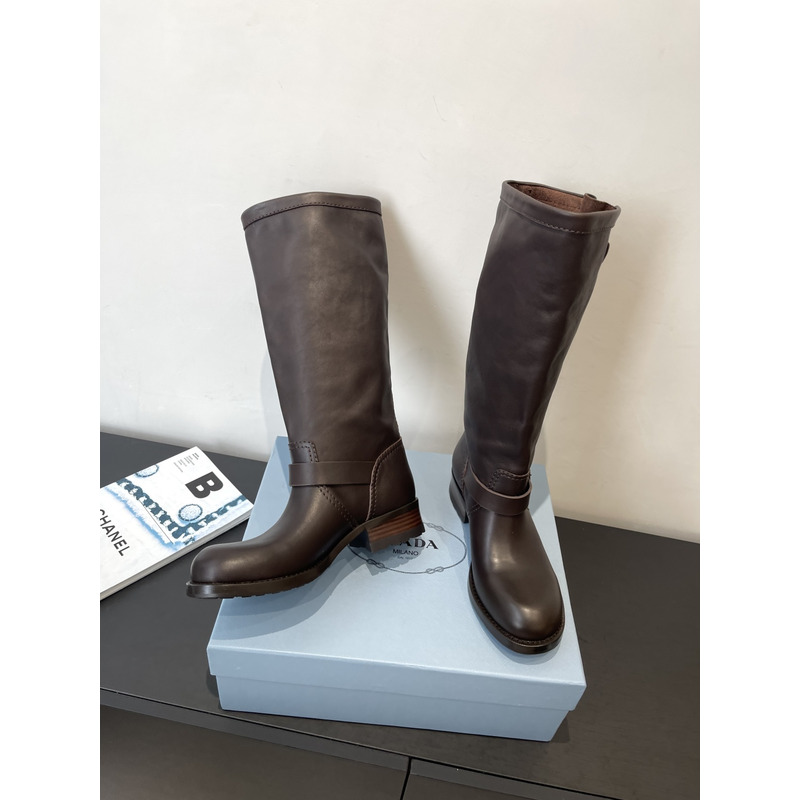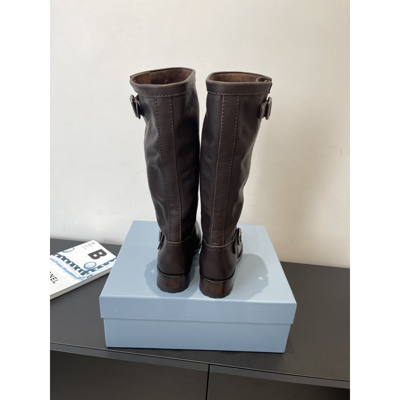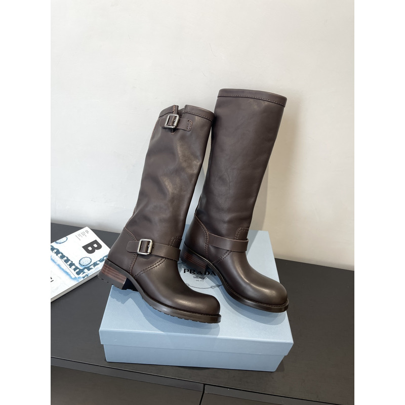 Prada Calf Leather Knee-High Boots With Buckle In Brown
