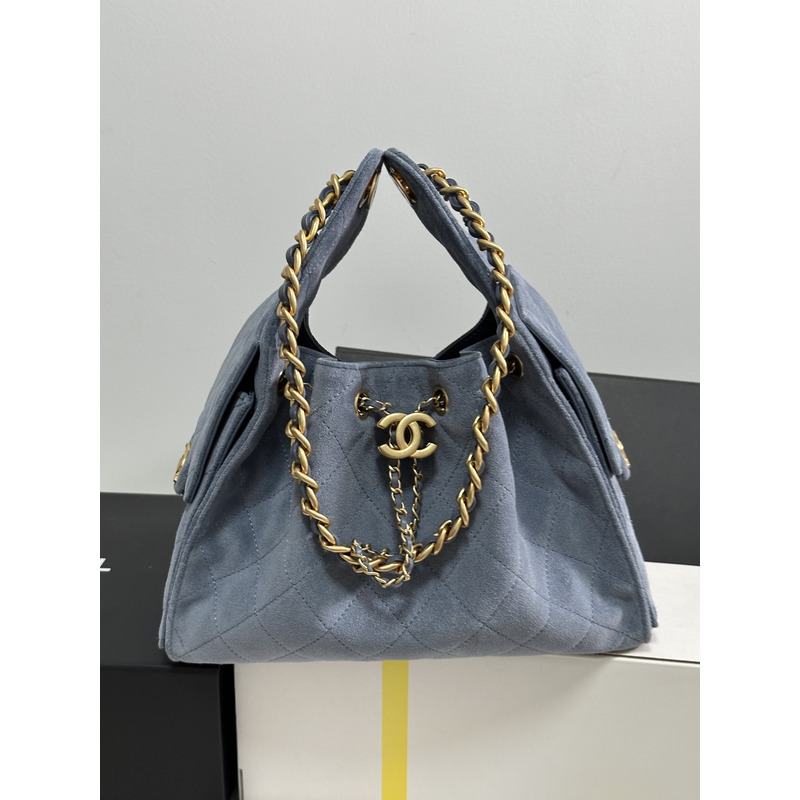Chanel Quilted Suede Tote Bag Light Blue Gold Tone CC Hardware