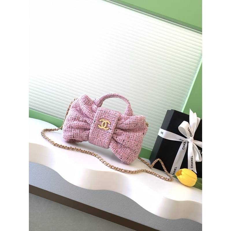 Chanel Mini Bow Bag Tweed And Gold Tone Metal Pink