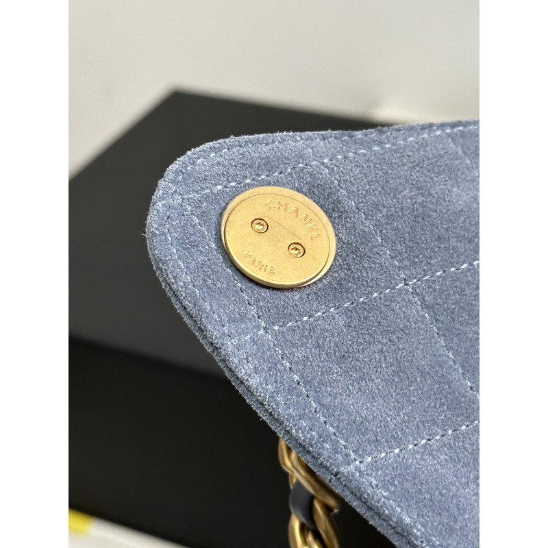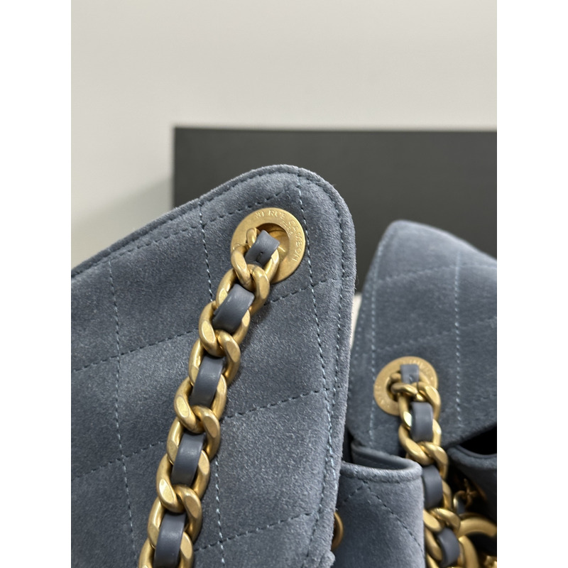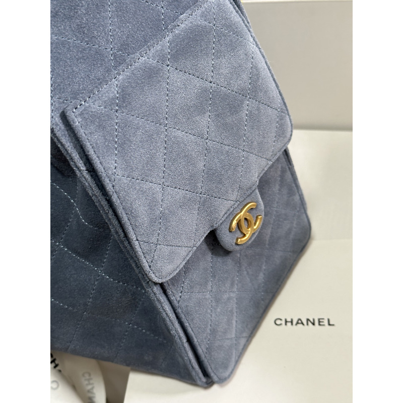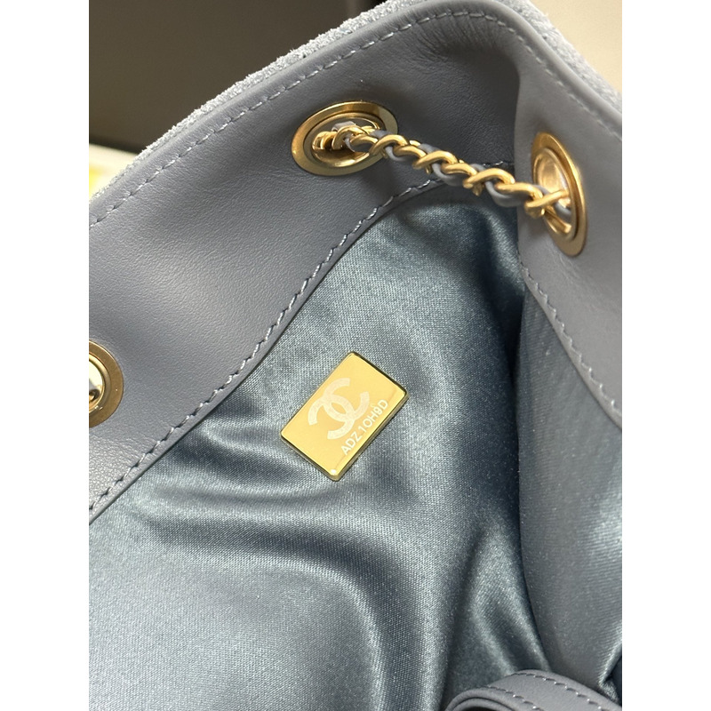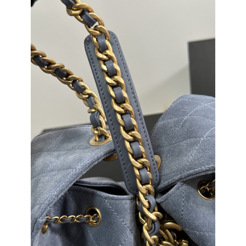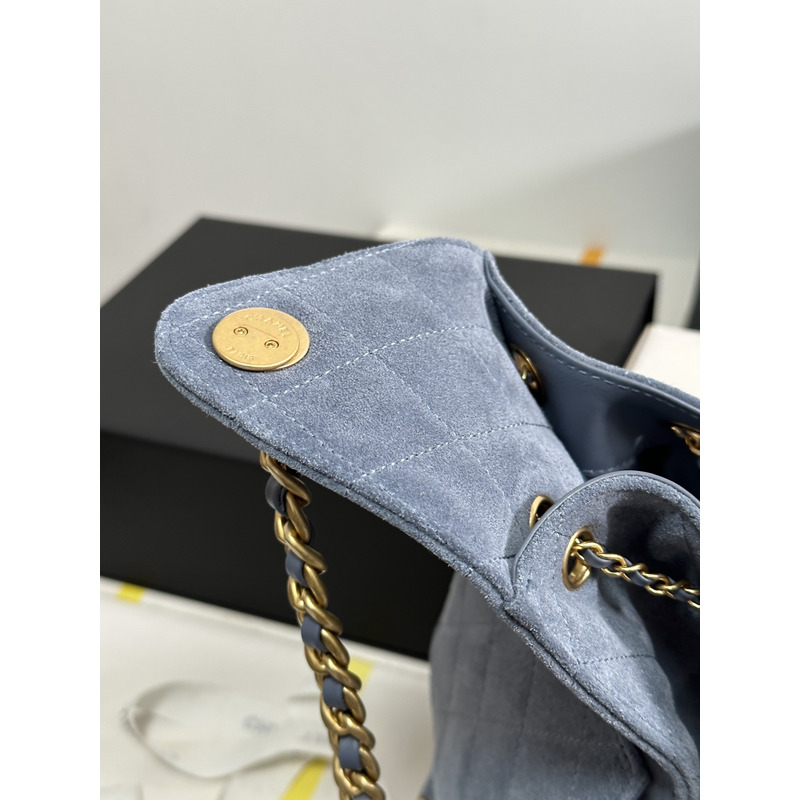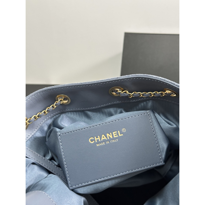 Chanel Quilted Suede Bucket Bag Light Blue Gold Tone CC Hardware