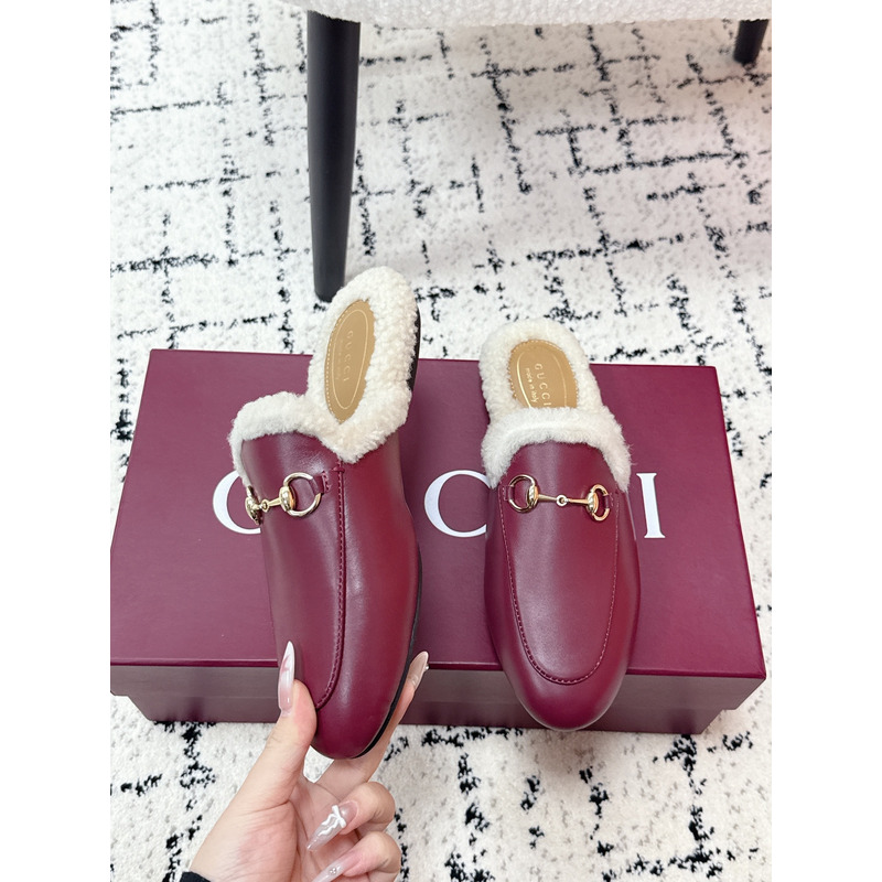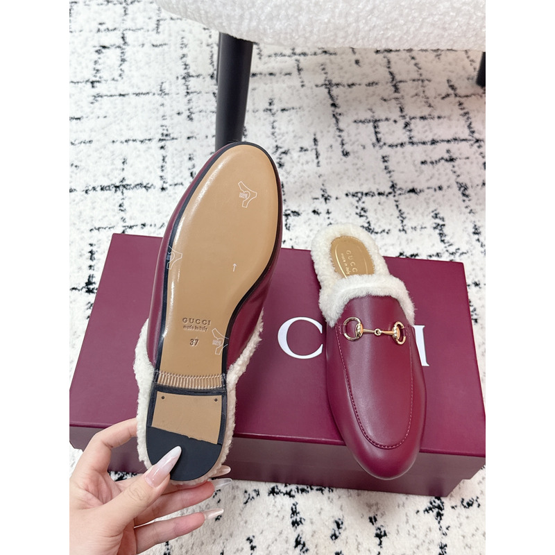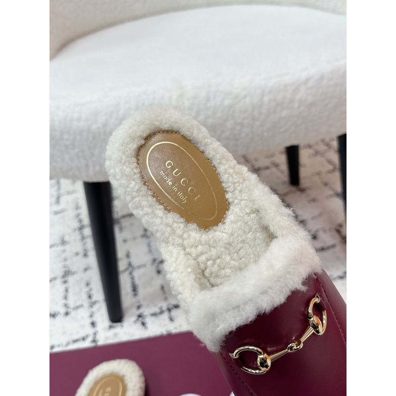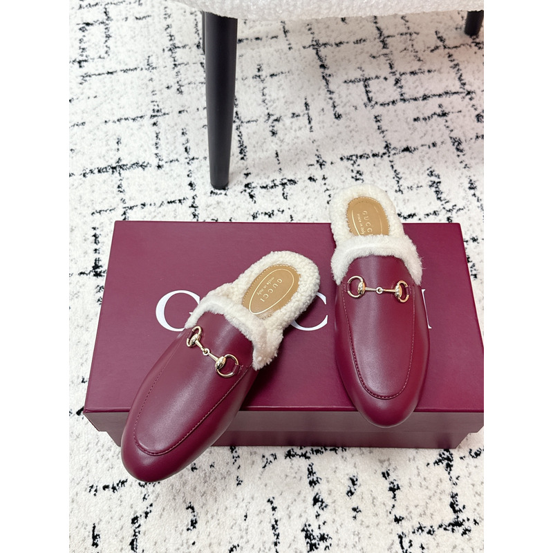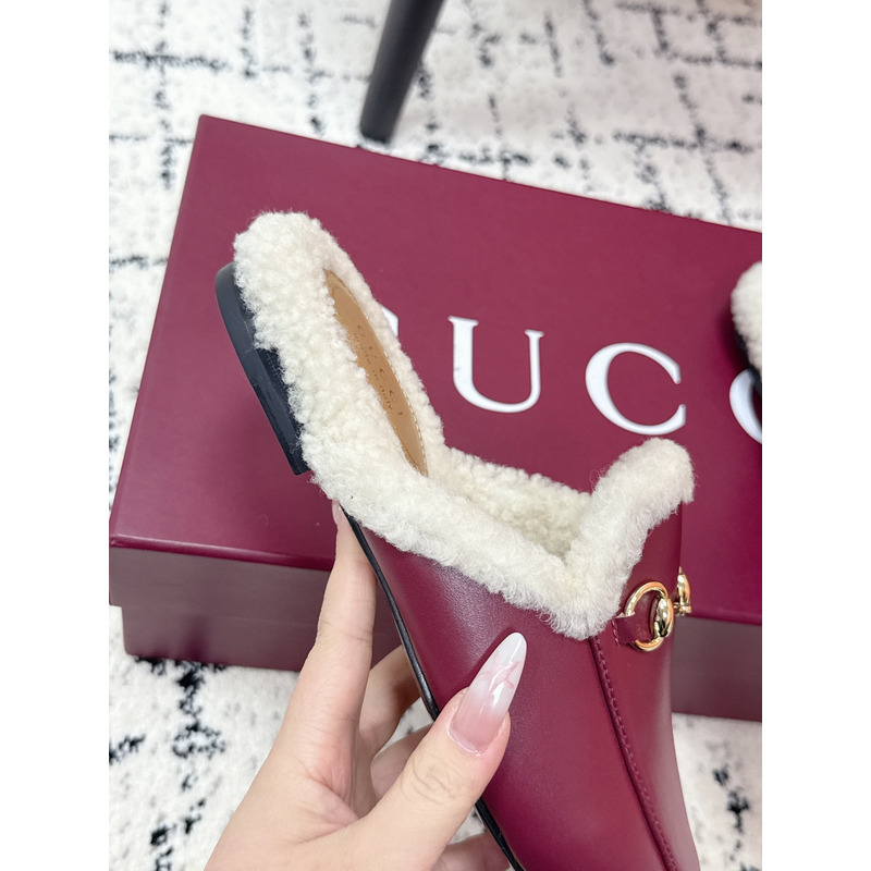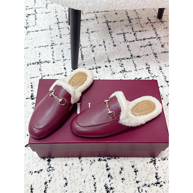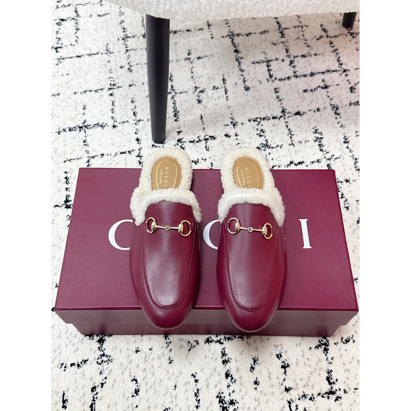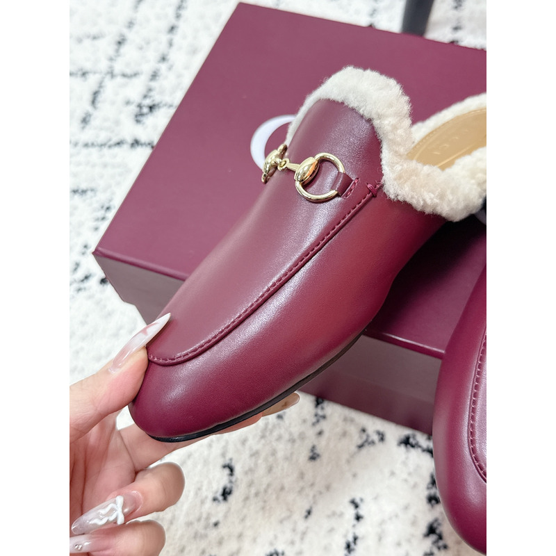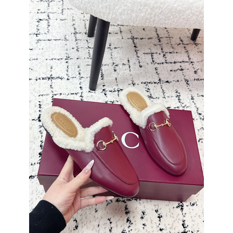 Gucci Princetown Fur-Lined Leather Mules With Horsebit In Red