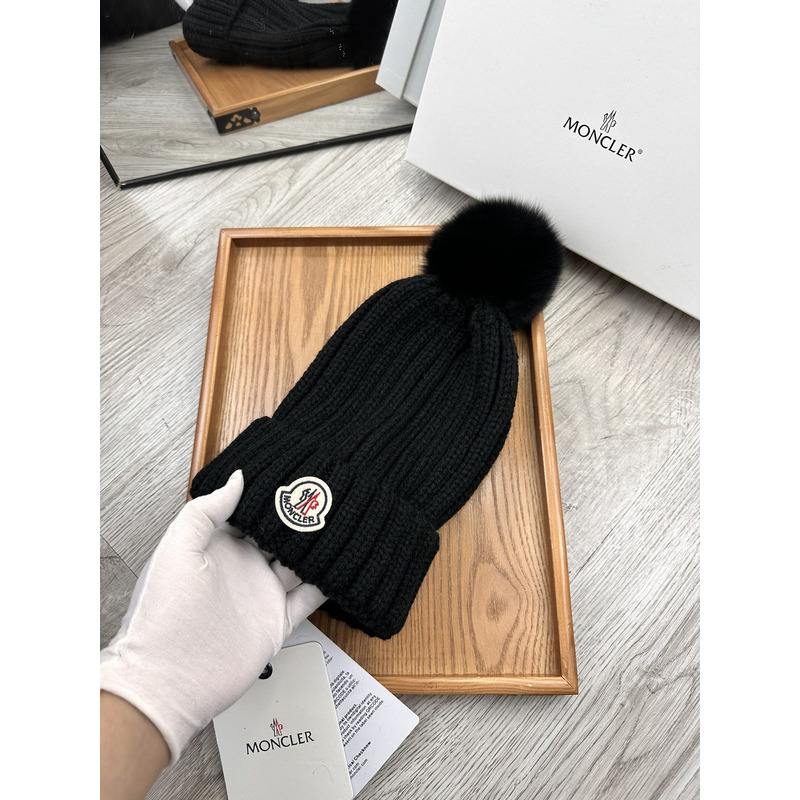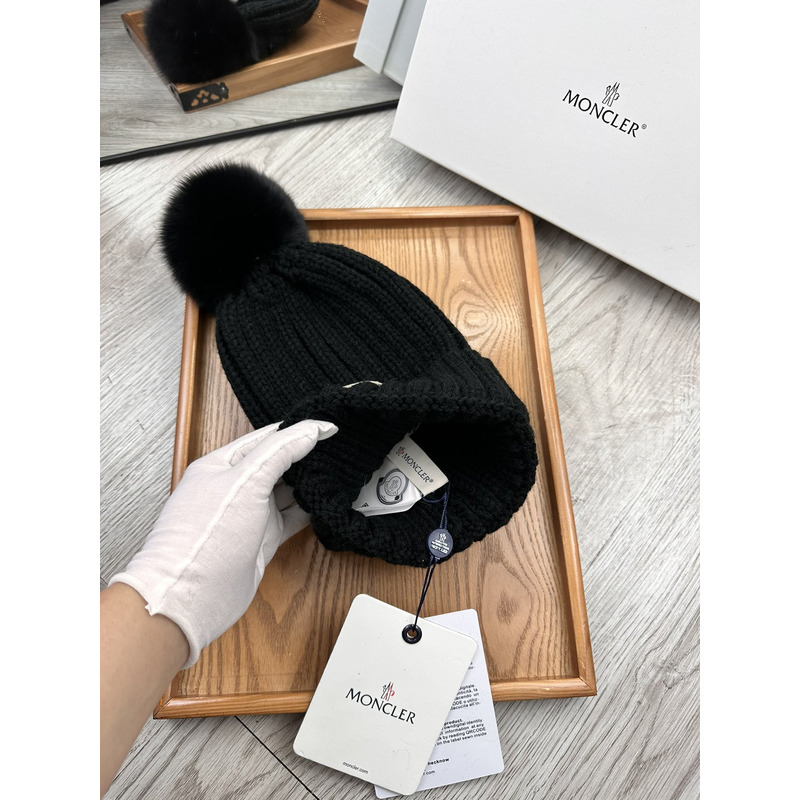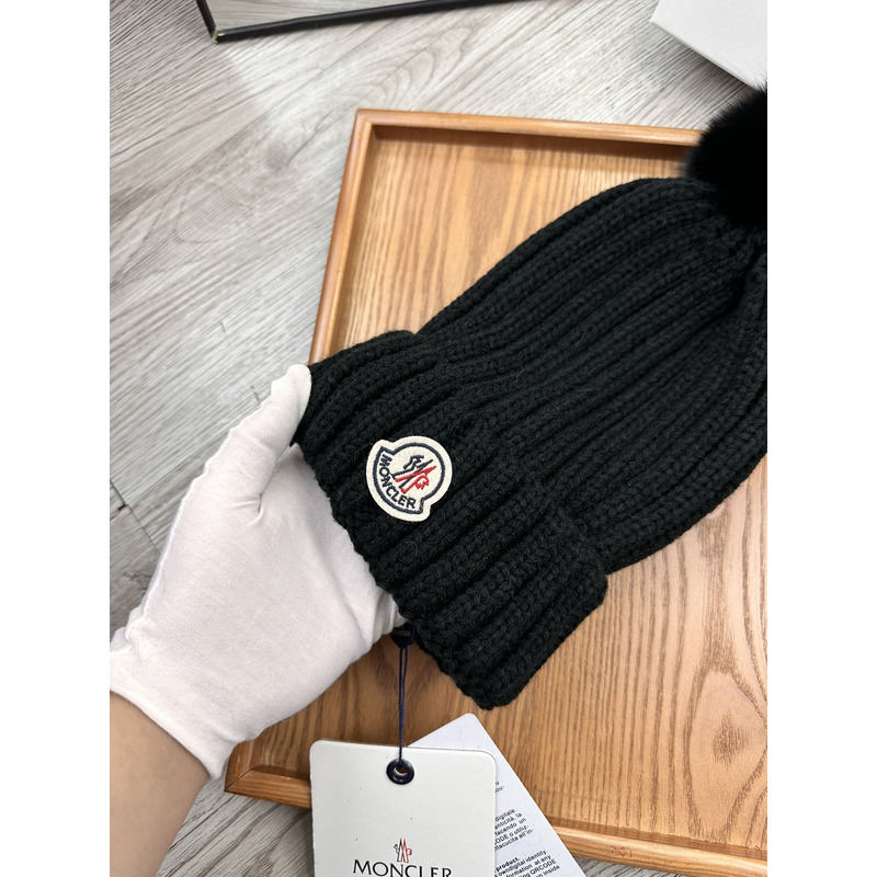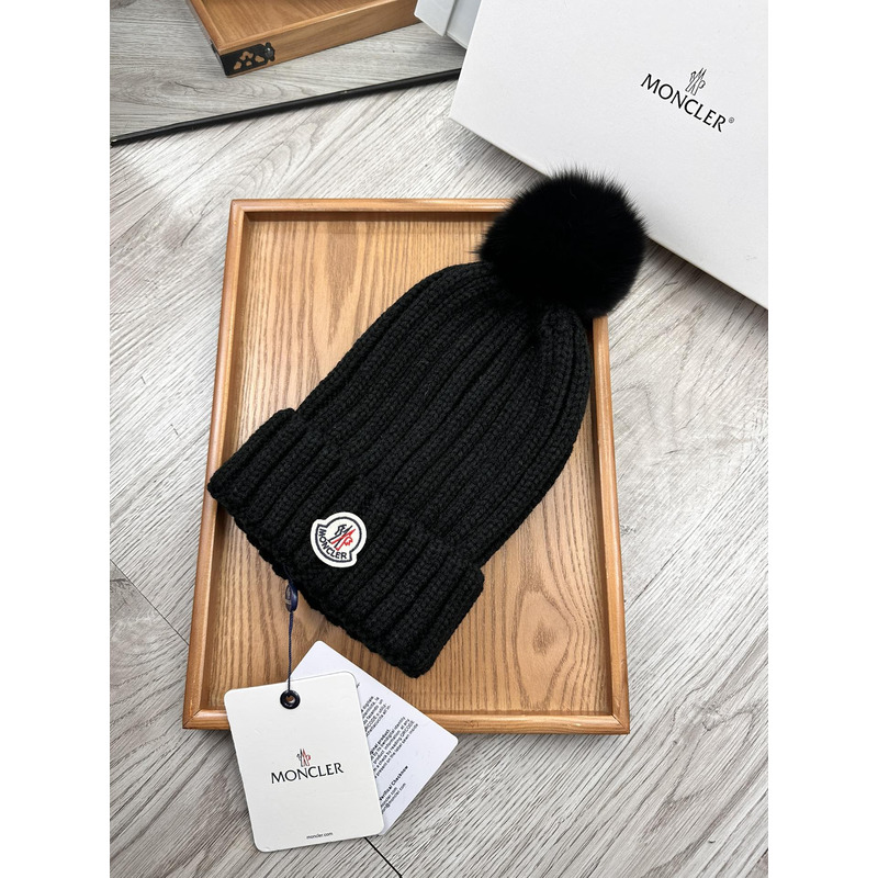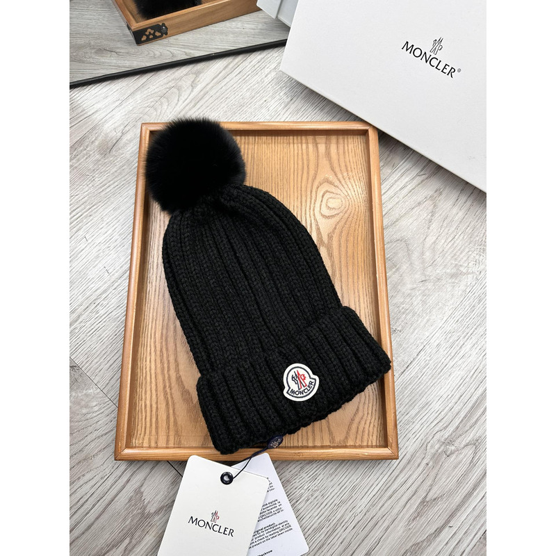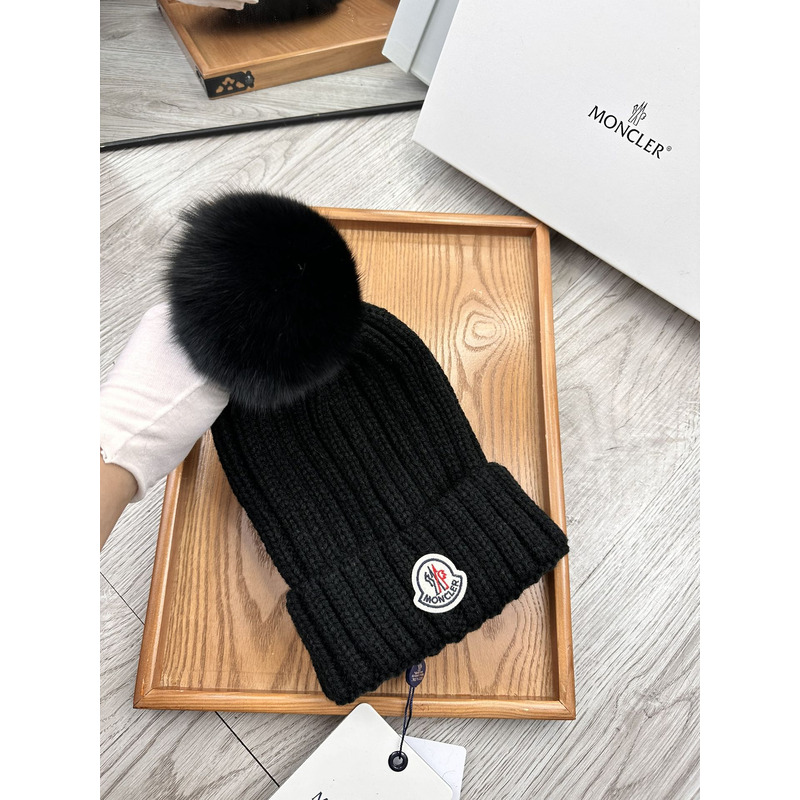 Moncler Black Wool Beanie with Faux Fur Pom Pom - Hats & Beanies