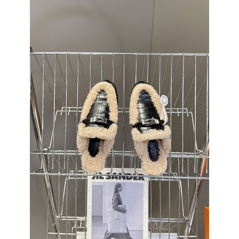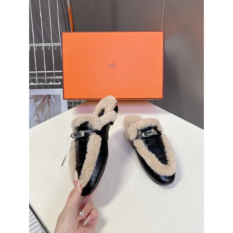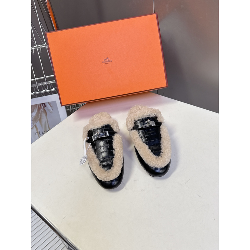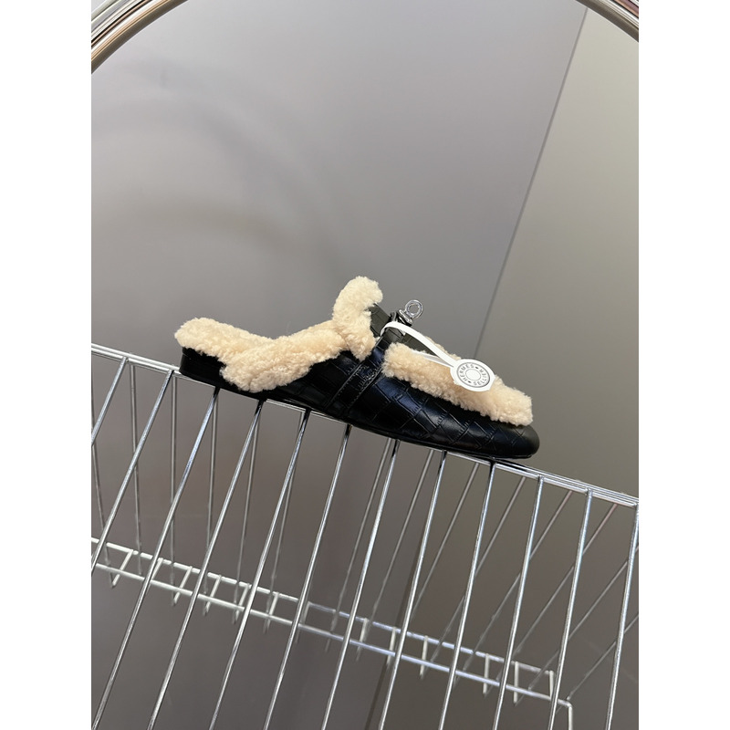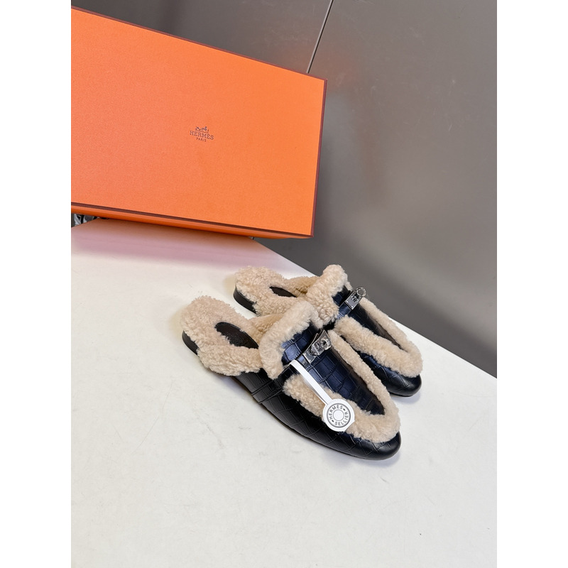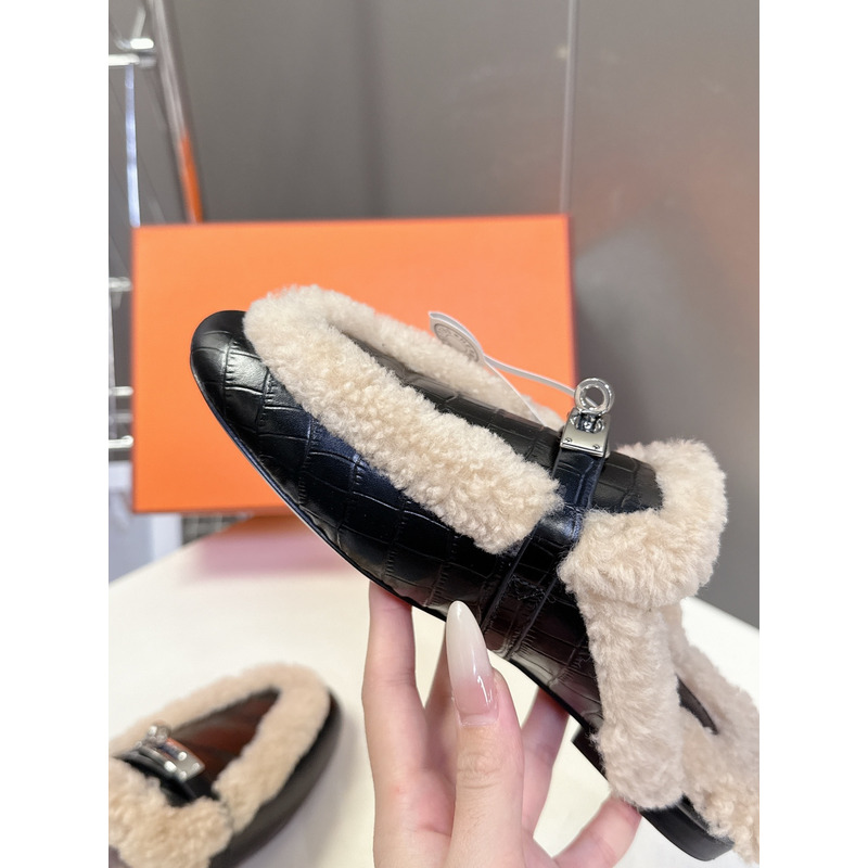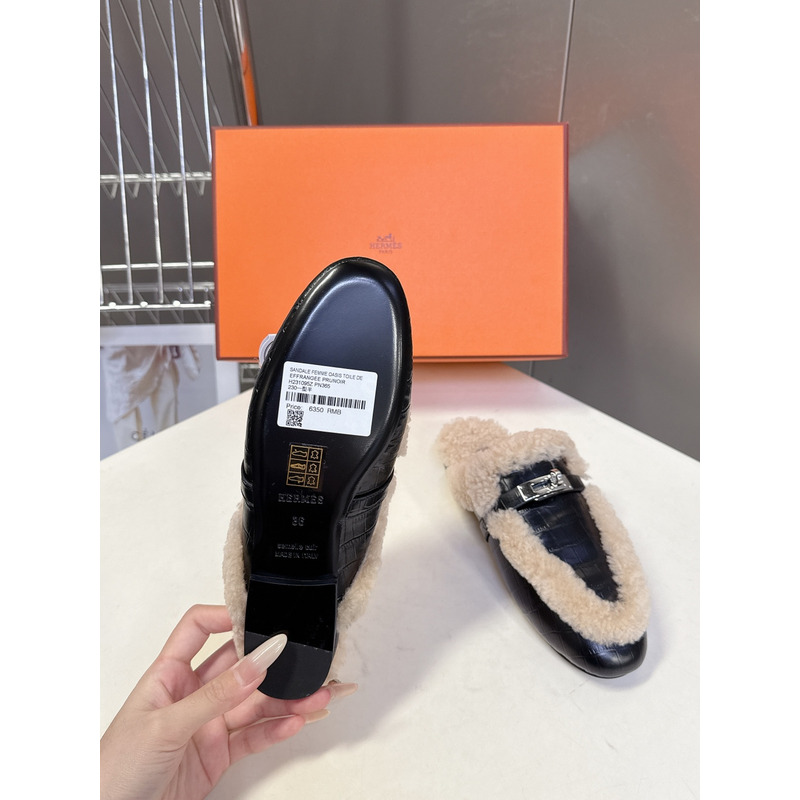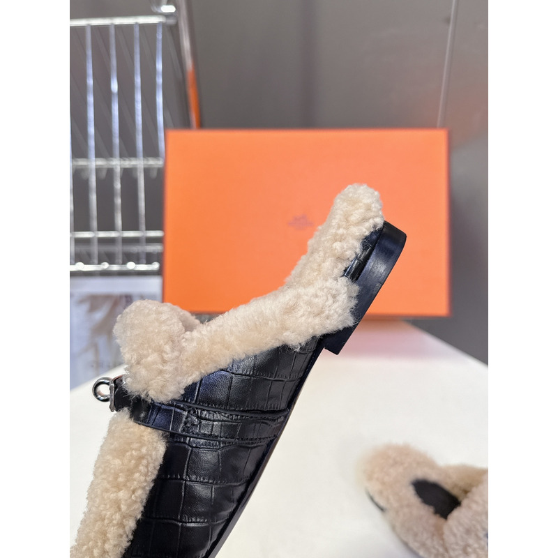 Hermes Calya Shearling & Croc-Stamped Mules In Black