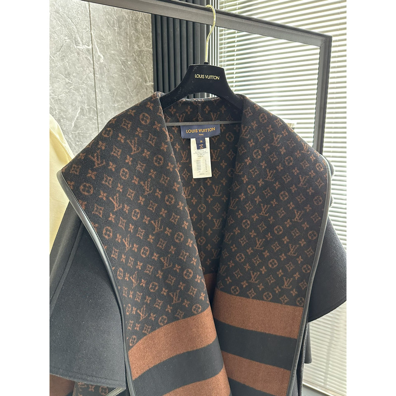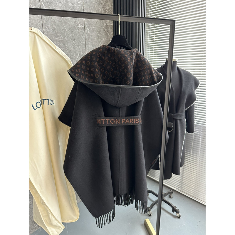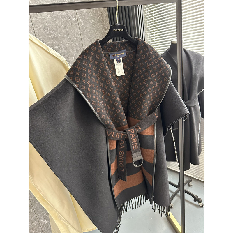 Louis Vuitton LV Monogram Hooded Wrap Shawl Coat with Striped Detail and Fringe Trim