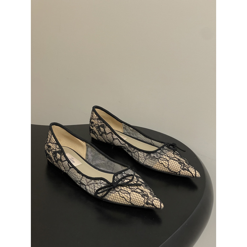 Valentino Garavani Lace Bow Pointed-Toe Ballet Flats In Black/Beige
