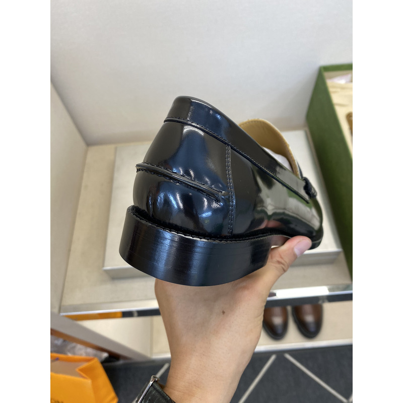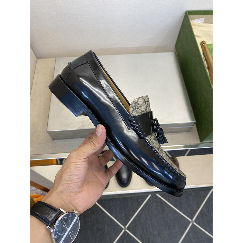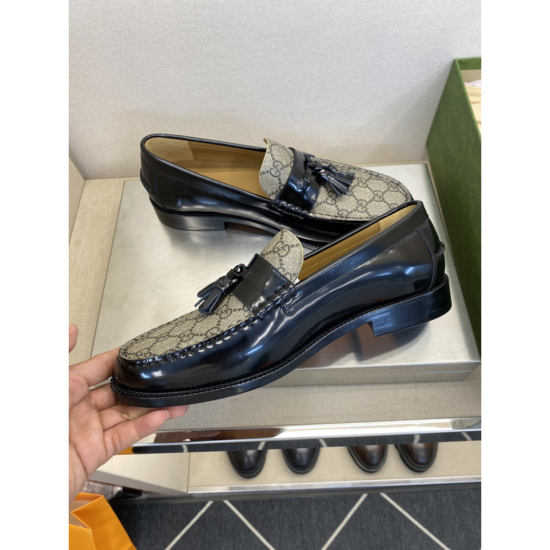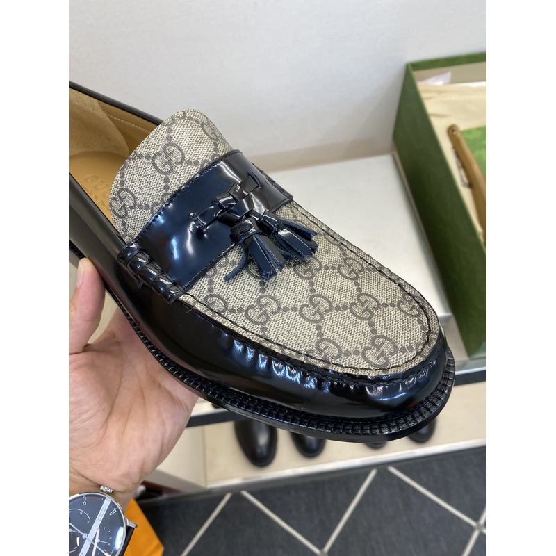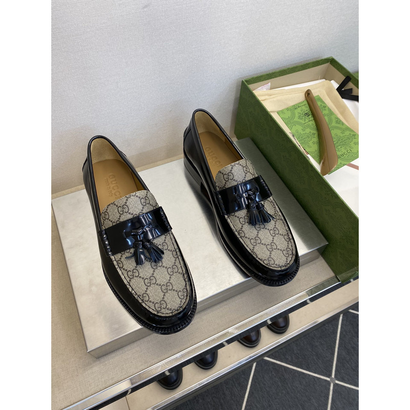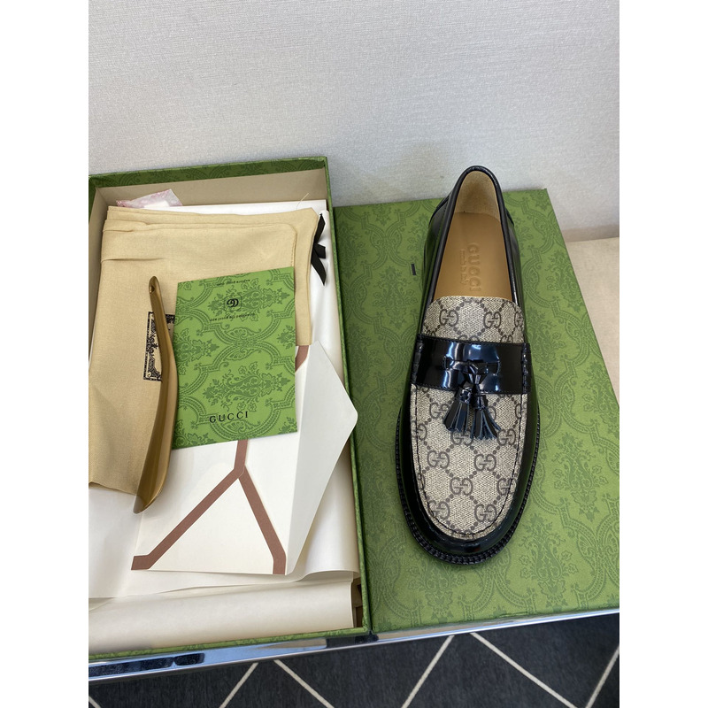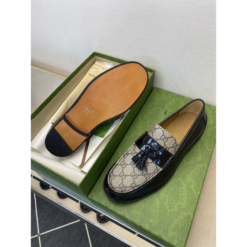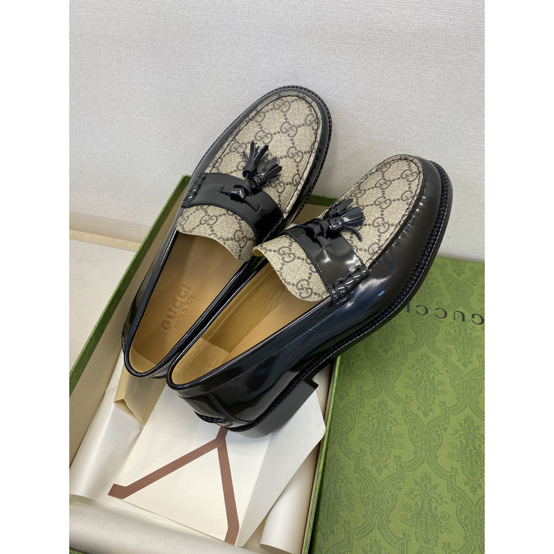 Gucci Mens GG Logo Leather Loafers Shoes Black/Beige