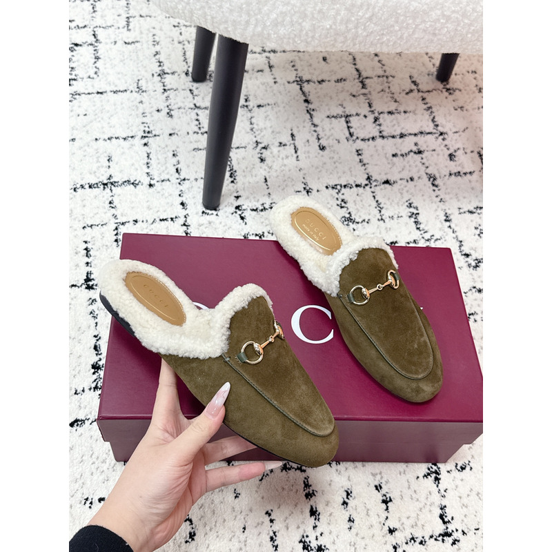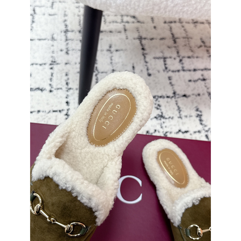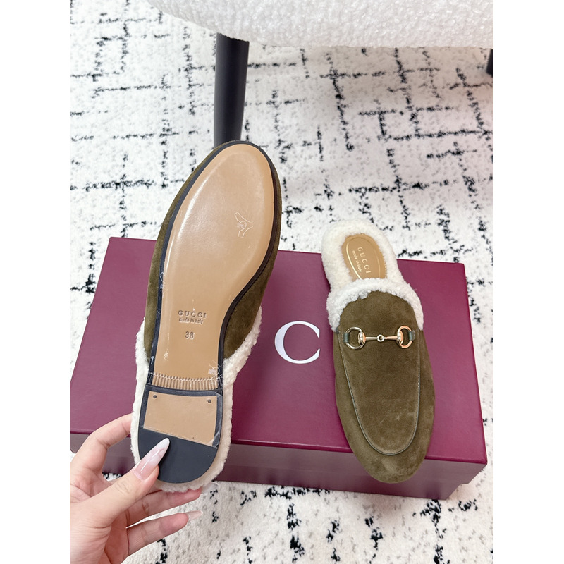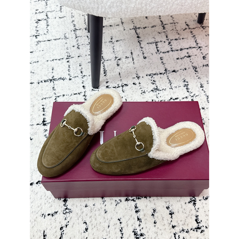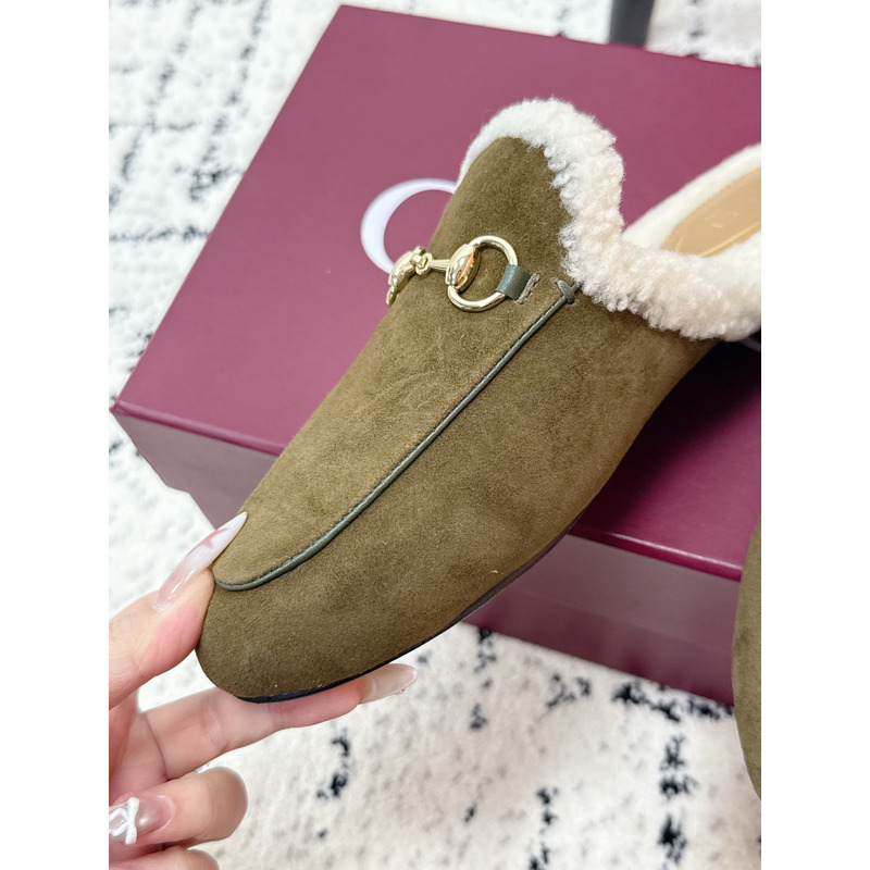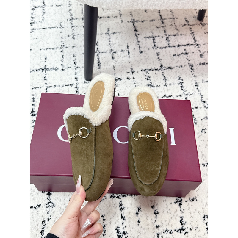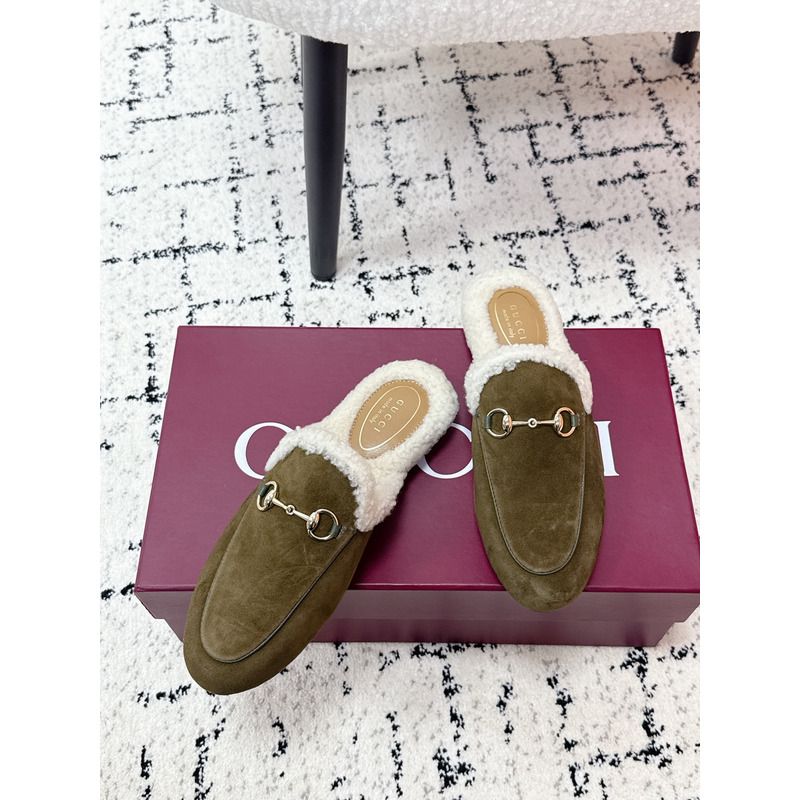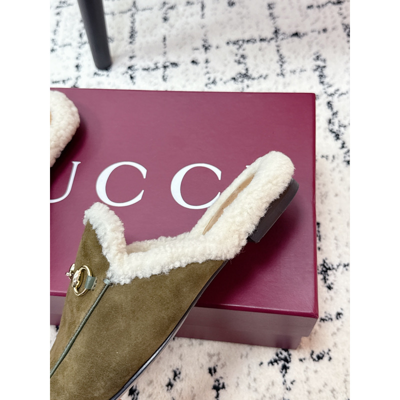 Gucci Princetown Fur-Lined Suede Mules With Horsebit In Green