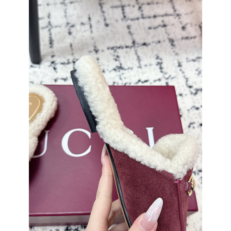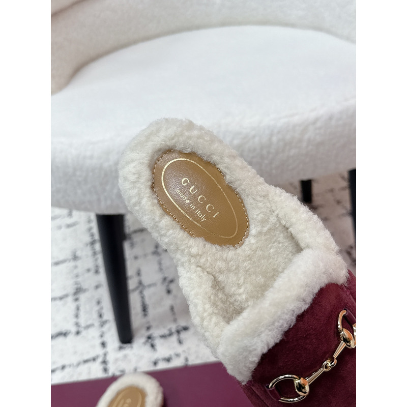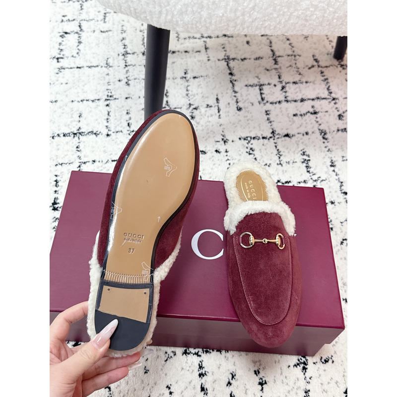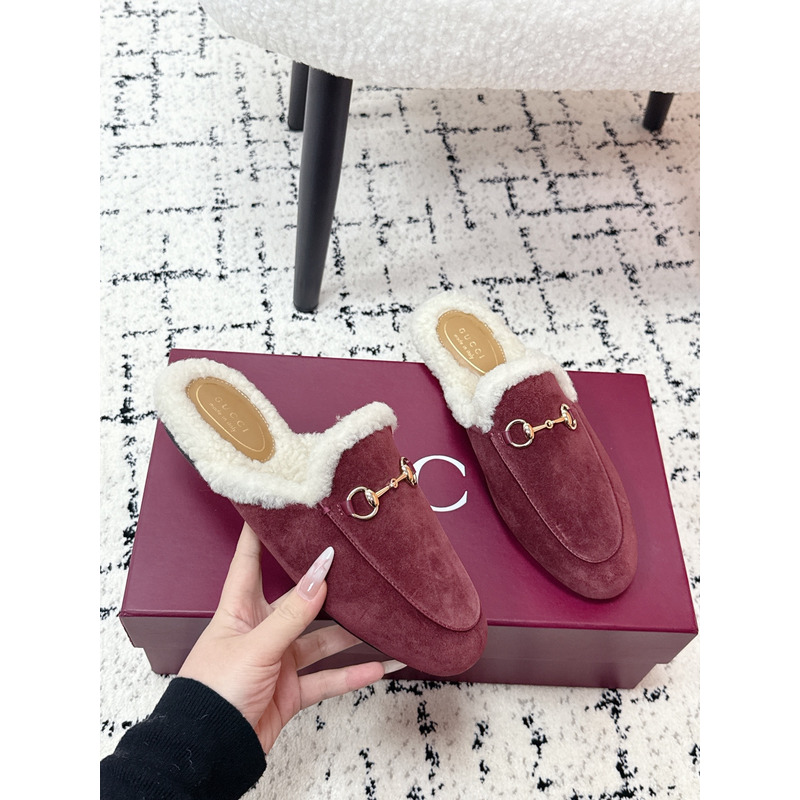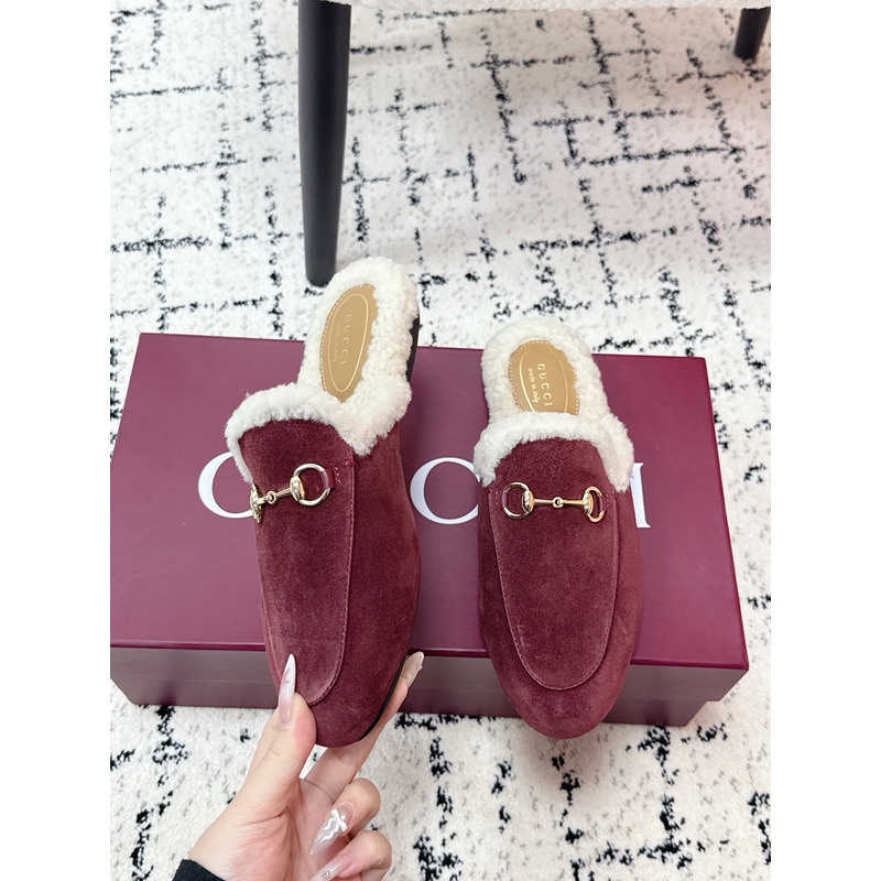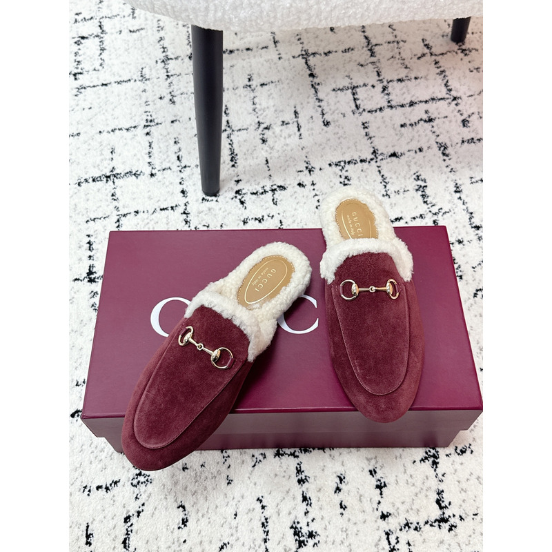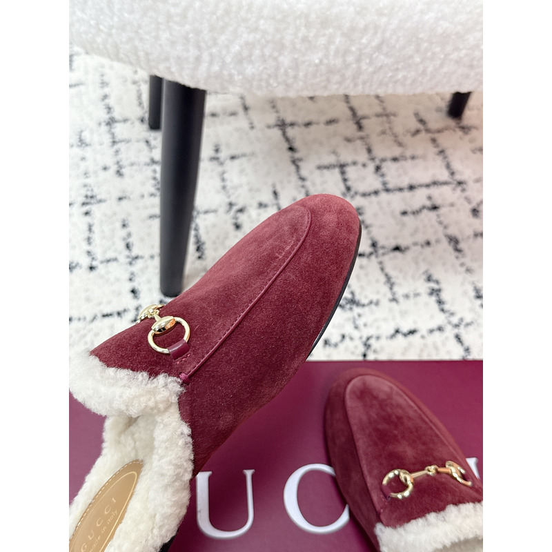 Gucci Princetown Fur-Lined Suede Mules With Horsebit In Red
