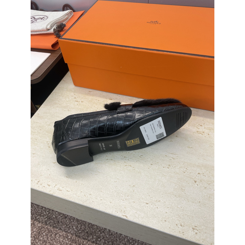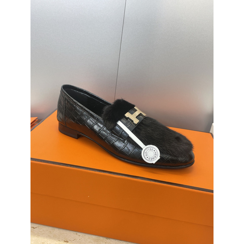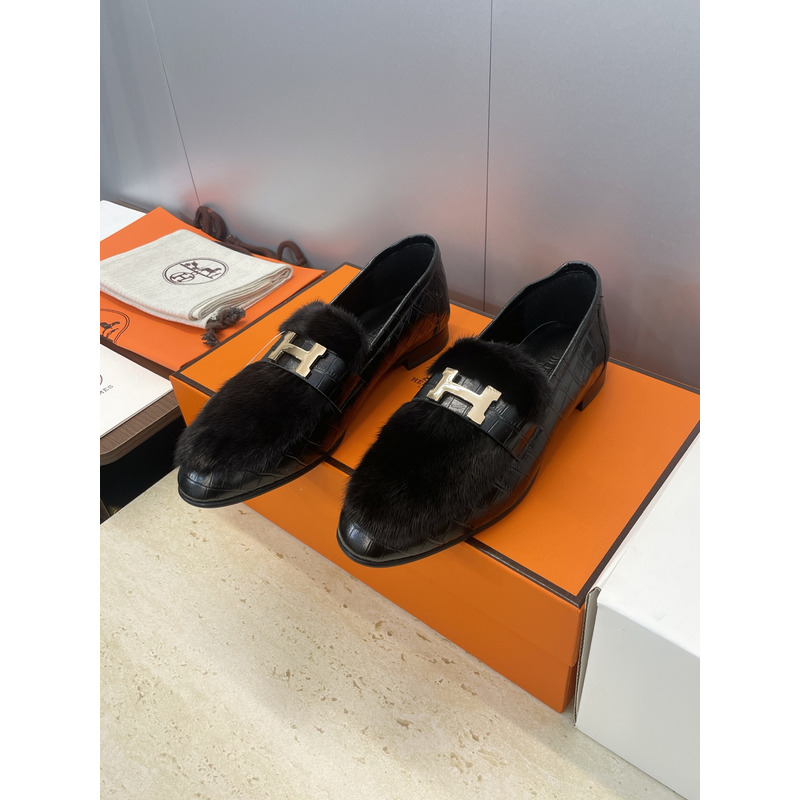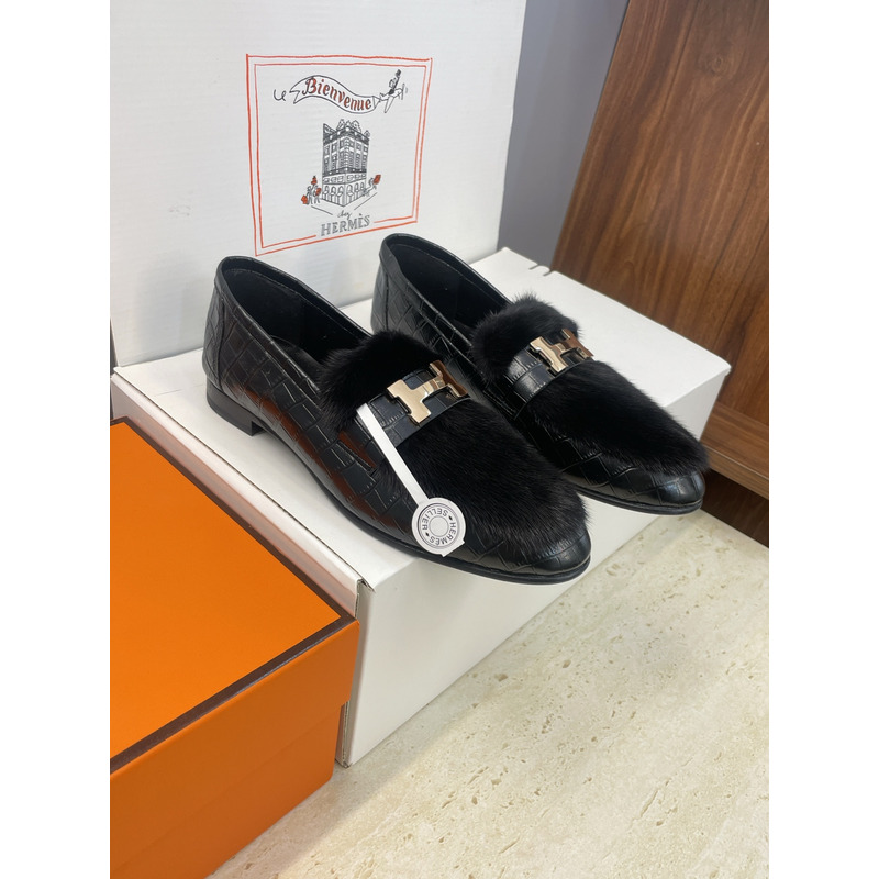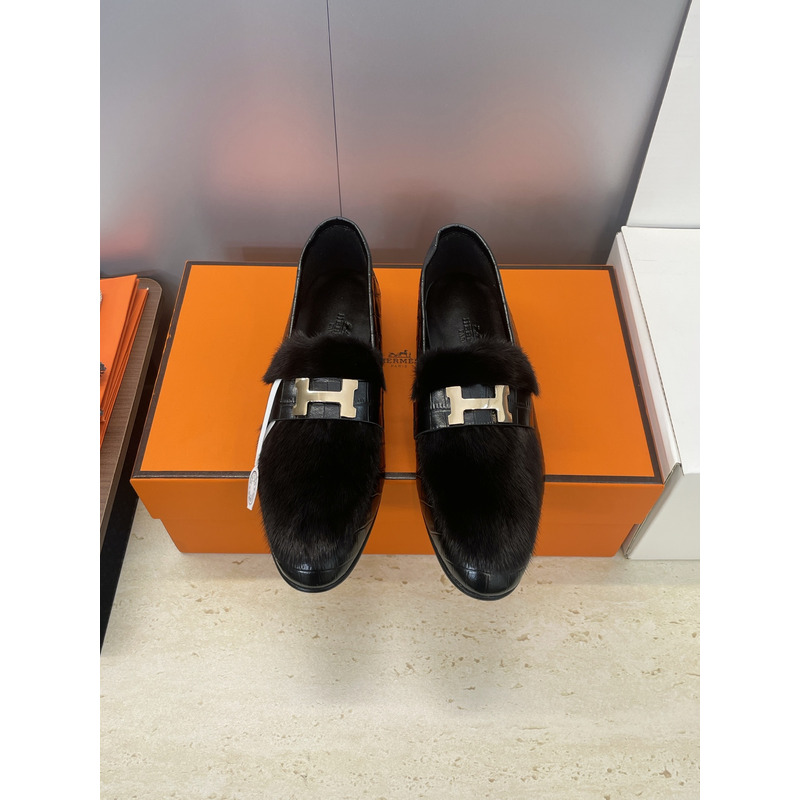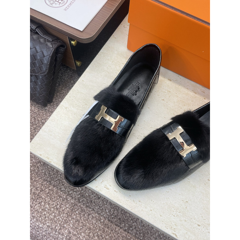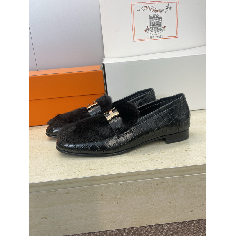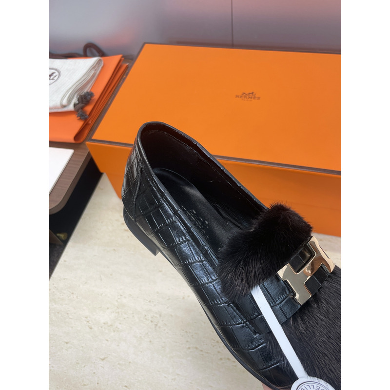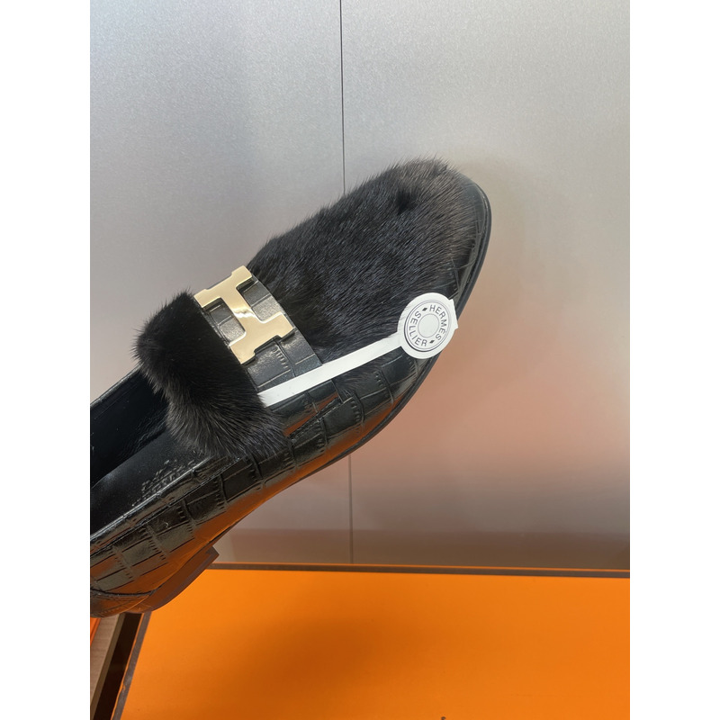 Hermes Paris Loafer In Black Leather With Fur And H Buckle