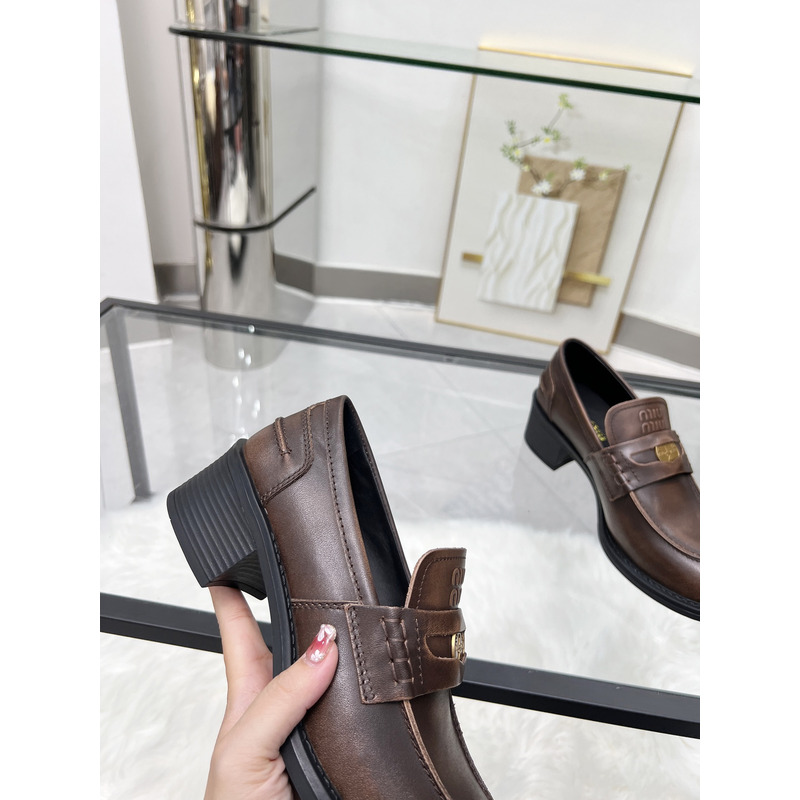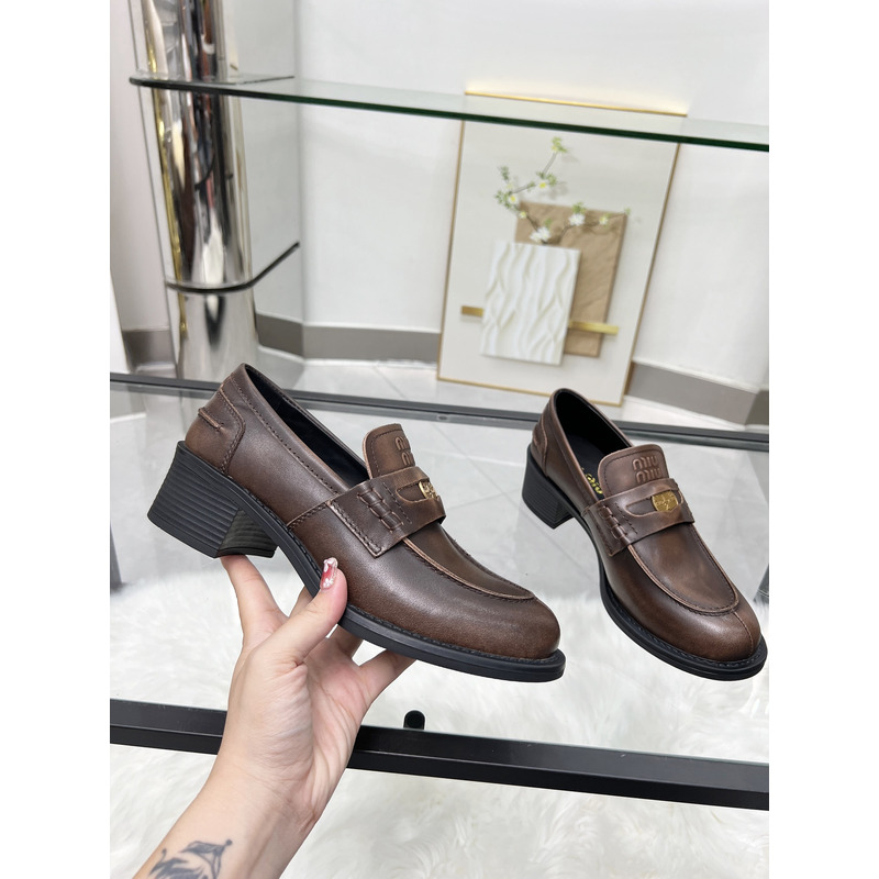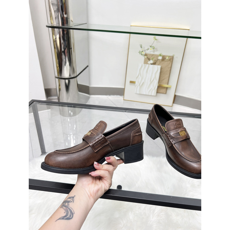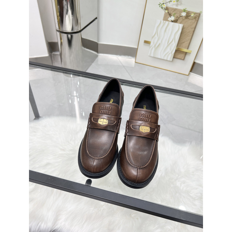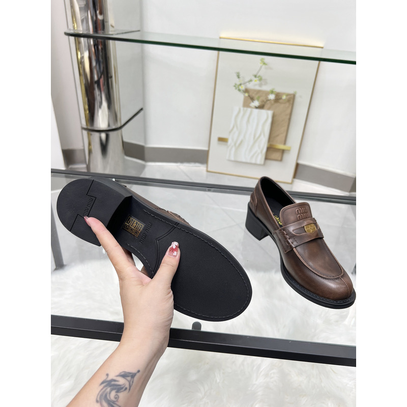 MIU MIU Brown Distressed Leather Penny Loafers With Gold-Tone Coin Detail