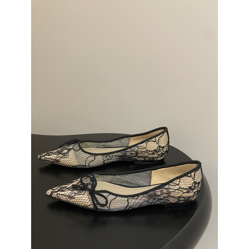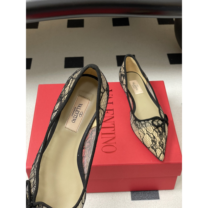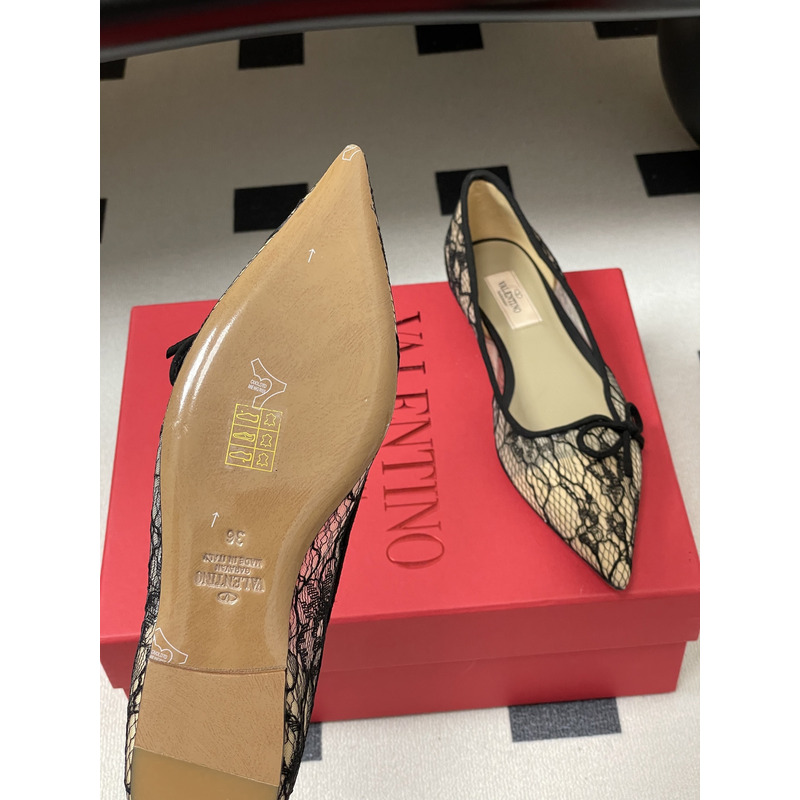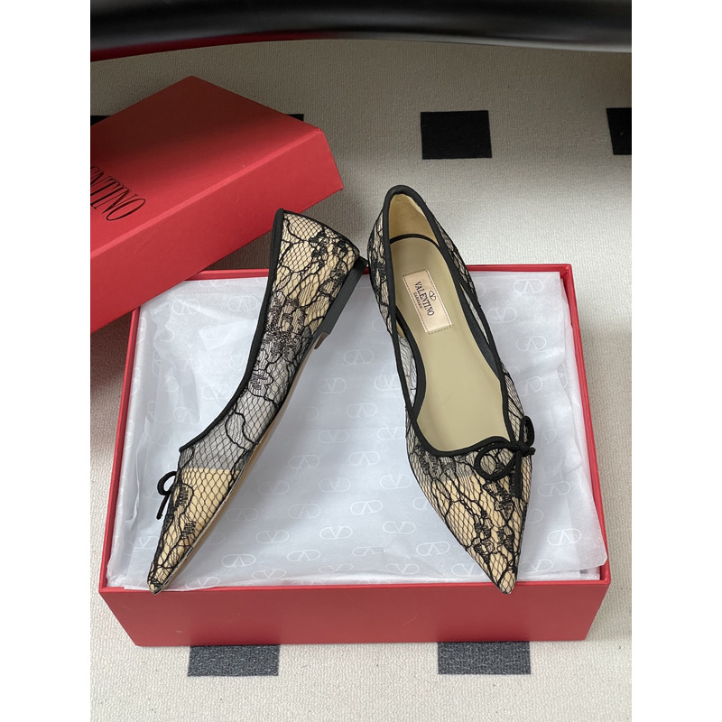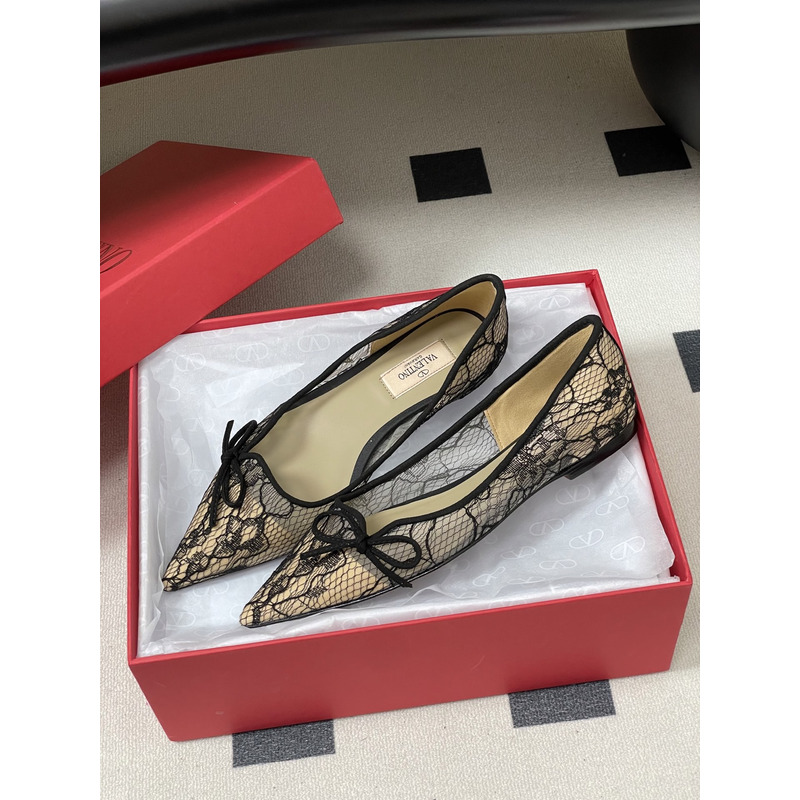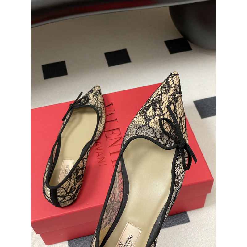 Valentino Garavani Lace Bow Pointed-Toe Ballet Flats In Black/Beige