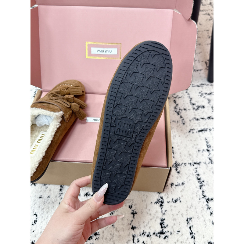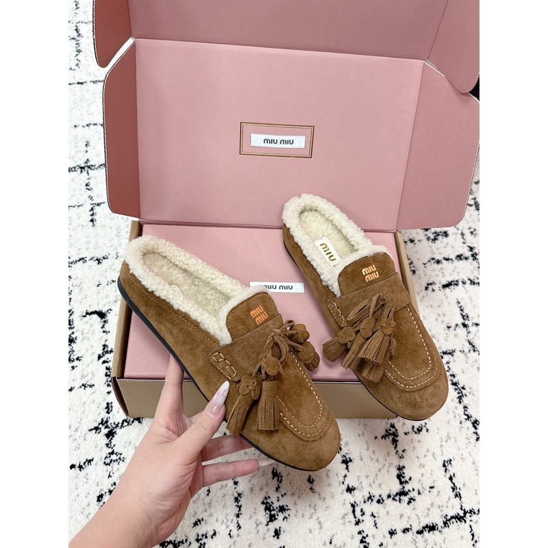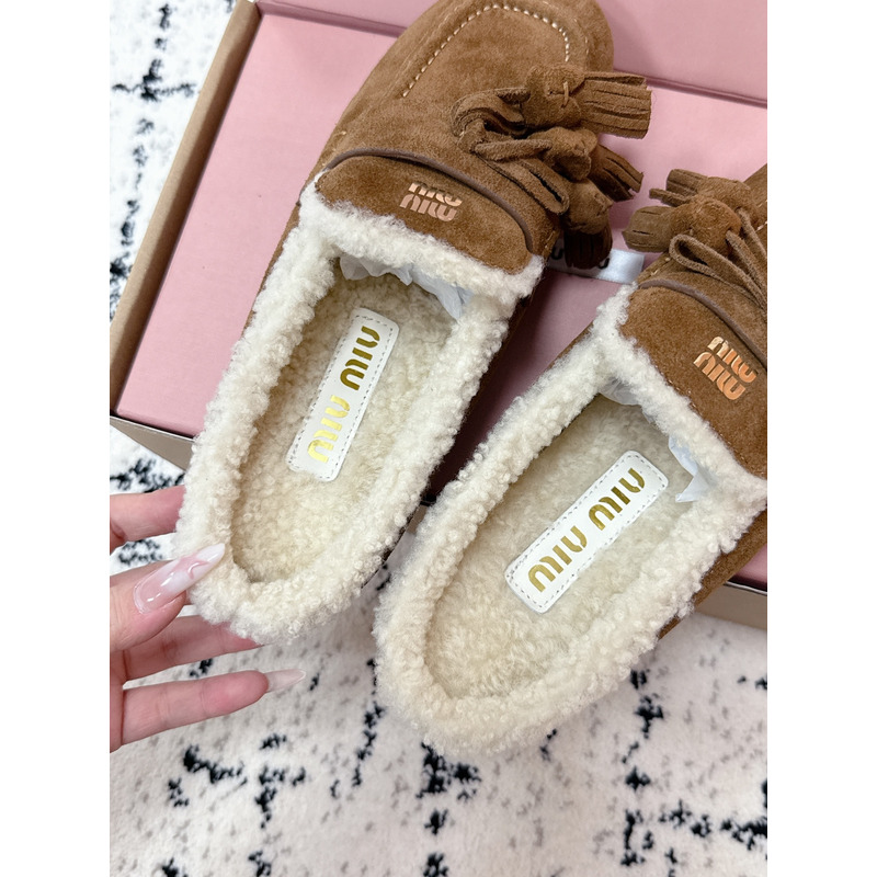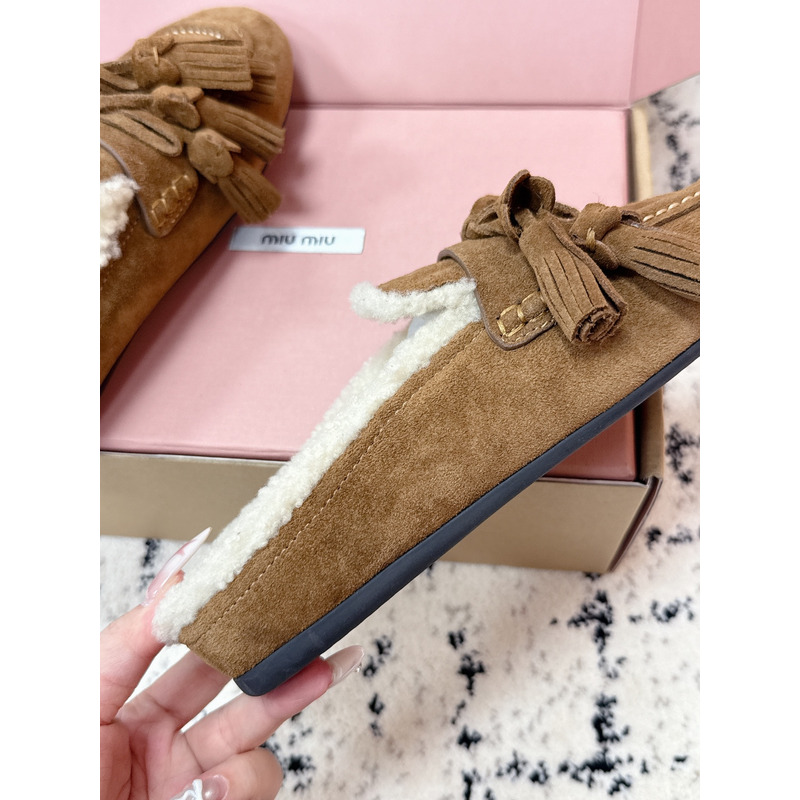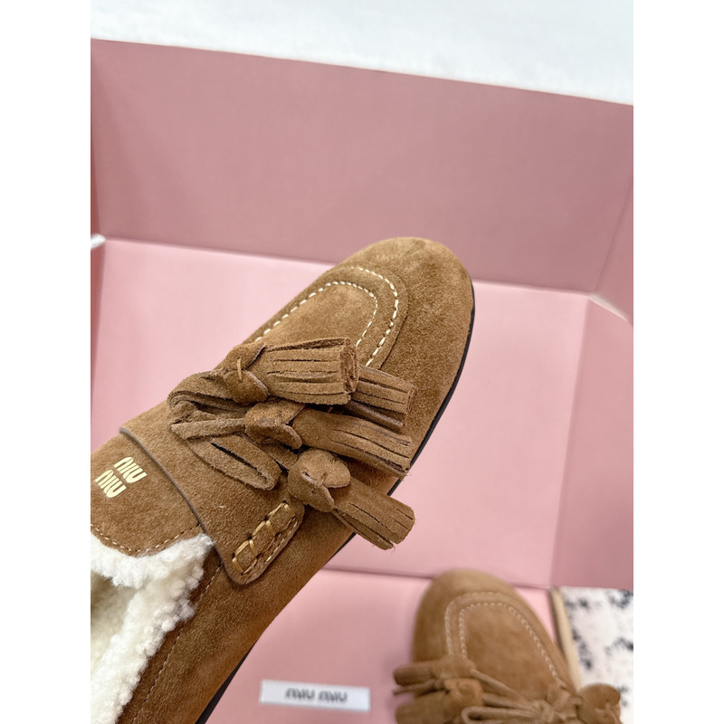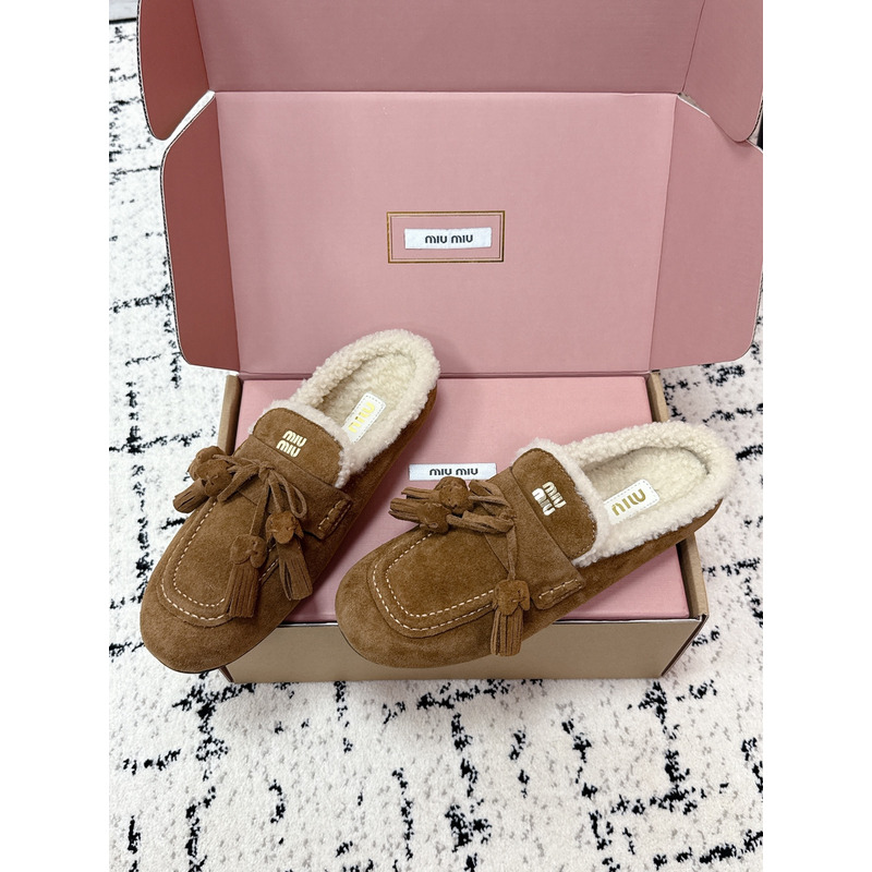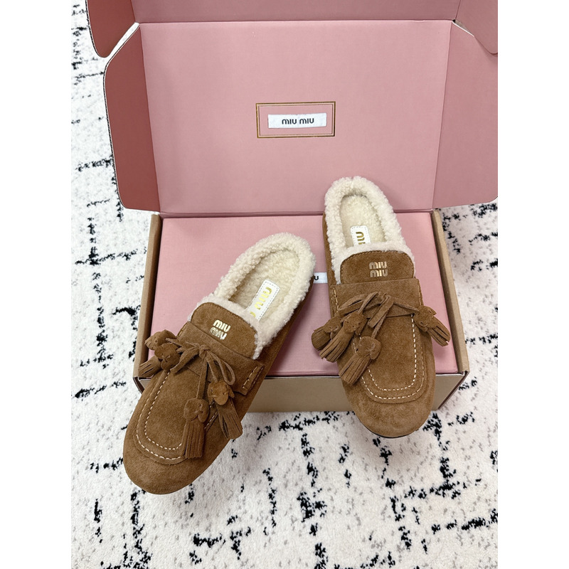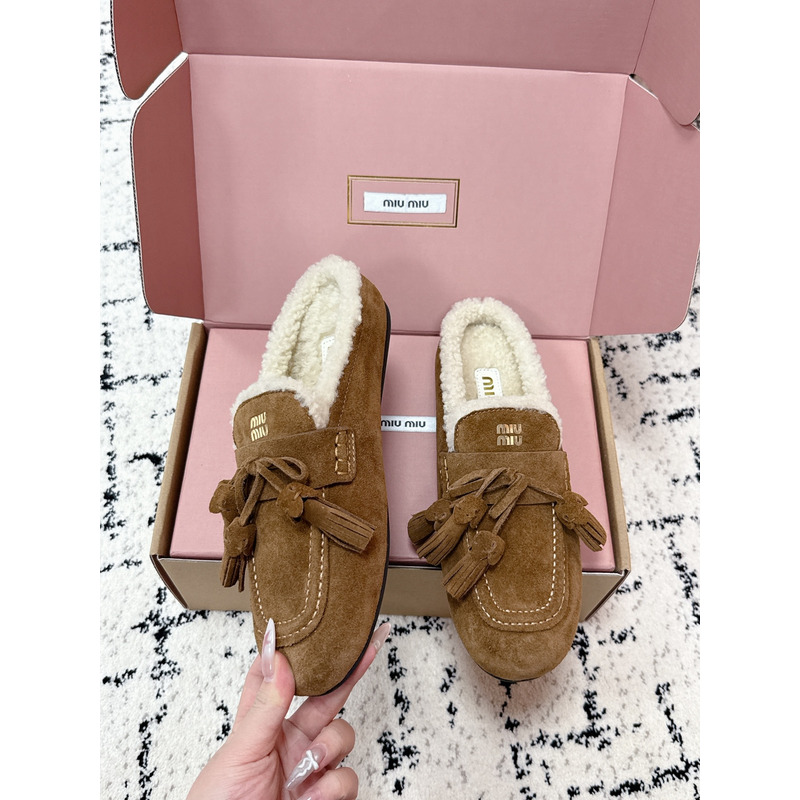 Miu Miu Fringe Bow Shearling Lined Mule In Brown