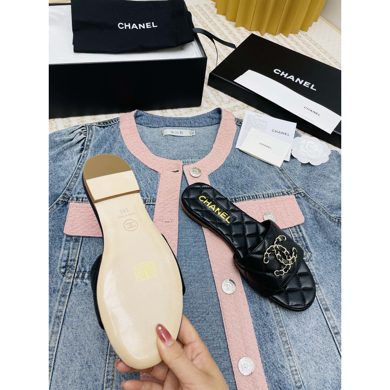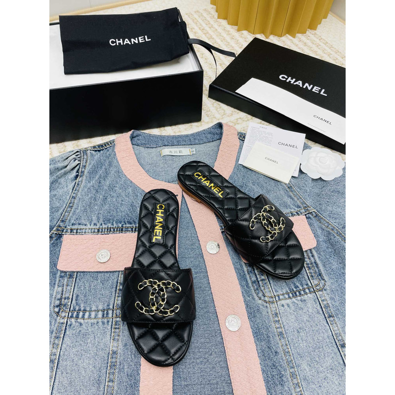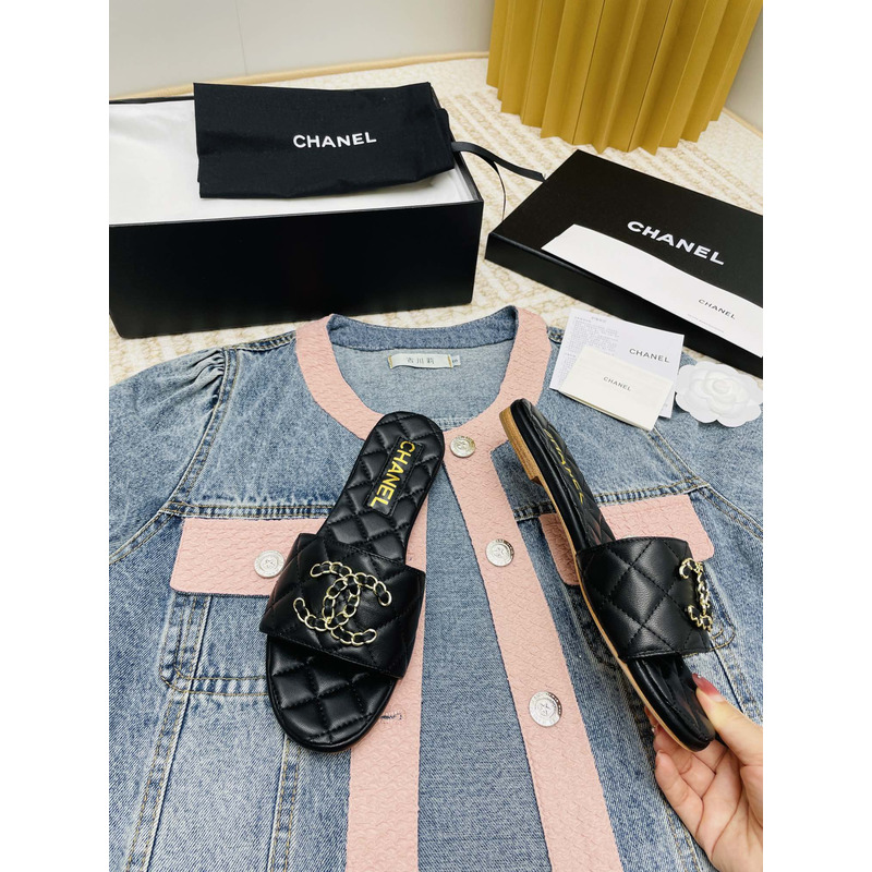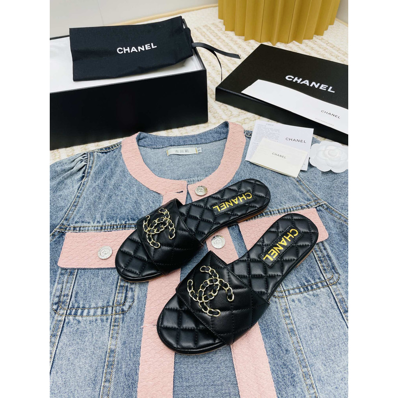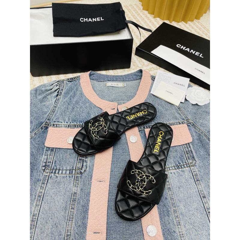 Chanel CC Logo Black Quilted Leather Mules With Gold Chain