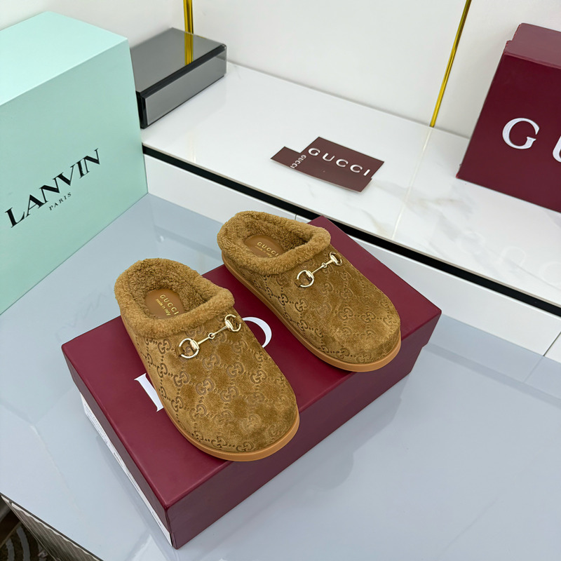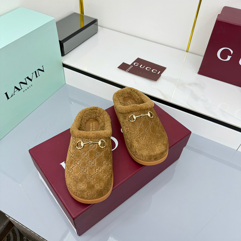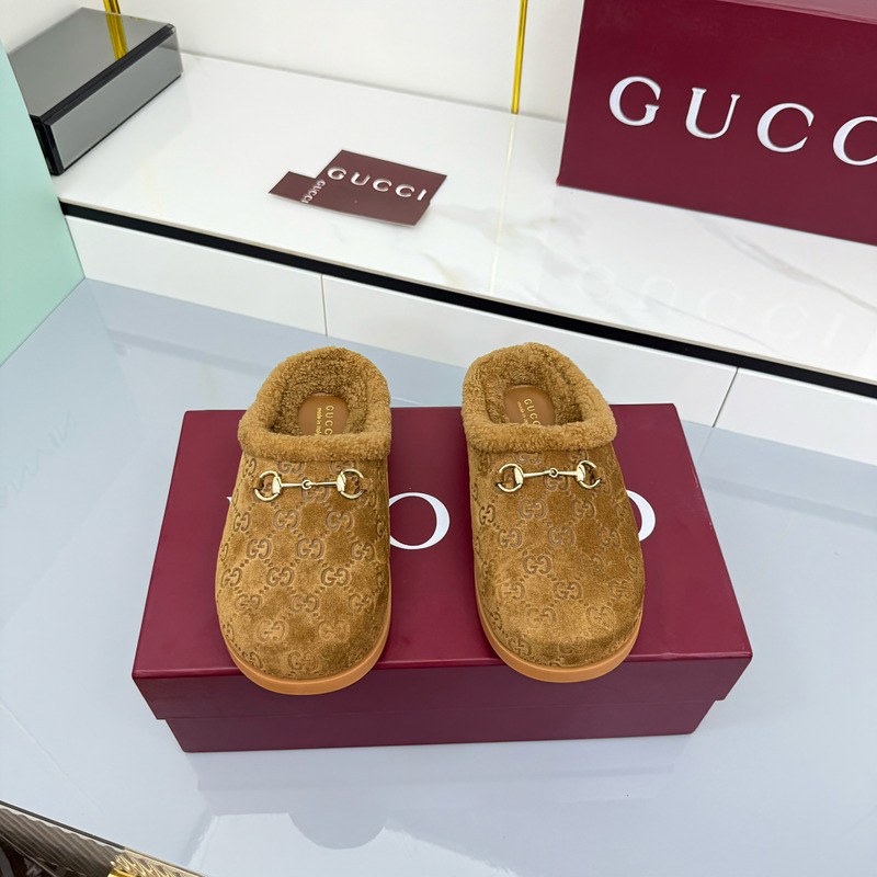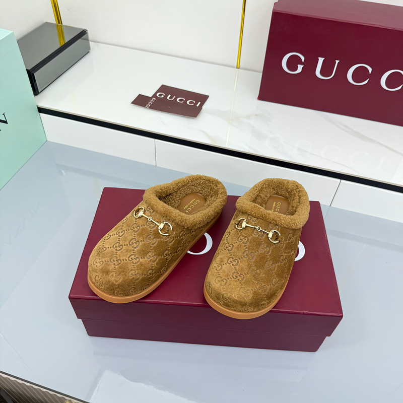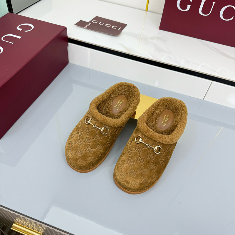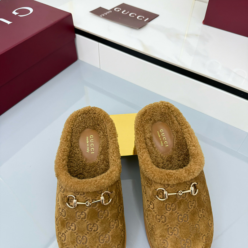 Gucci Mule With Horsebit Brown GG Suede And Wool Lining