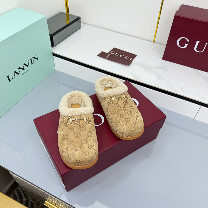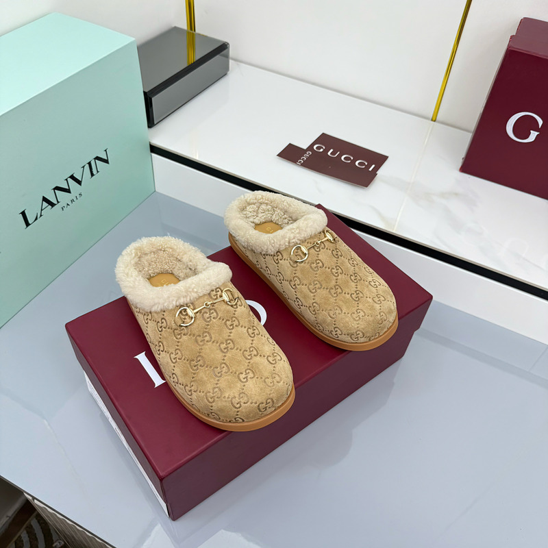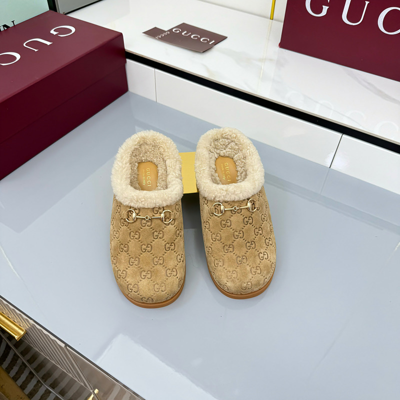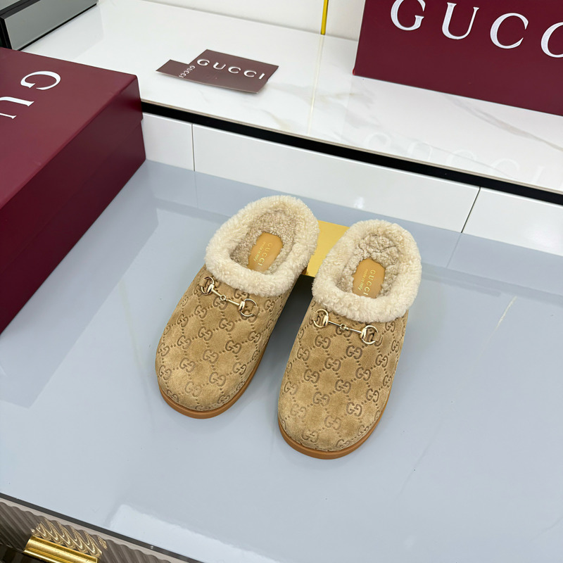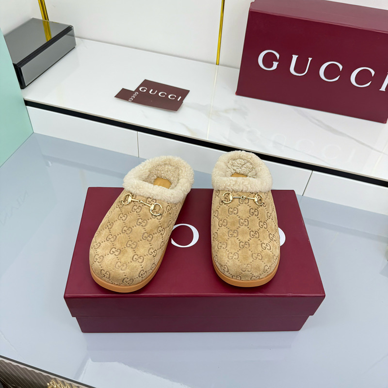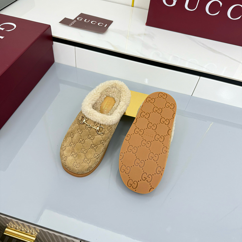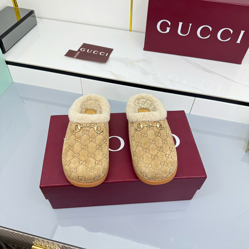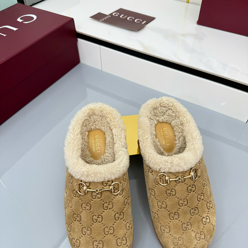 Gucci Mule With Horsebit Light Brown GG Suede And Wool Lining
