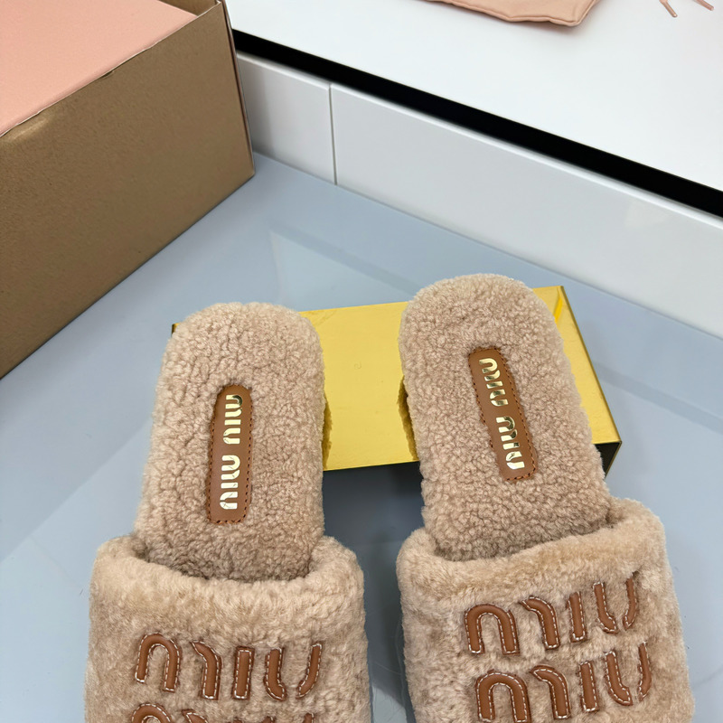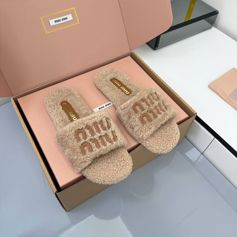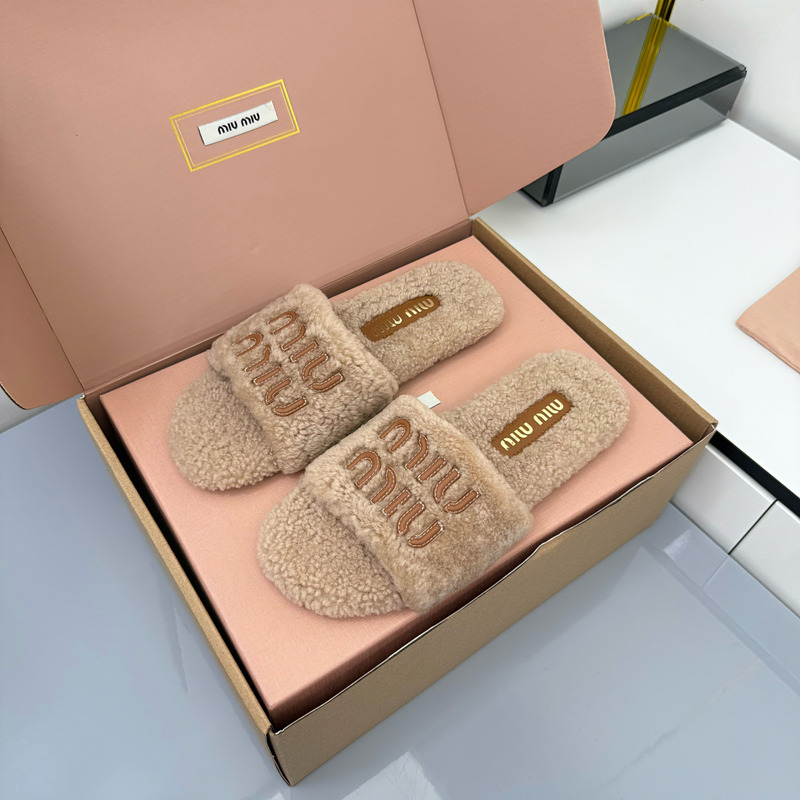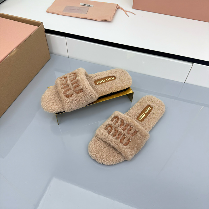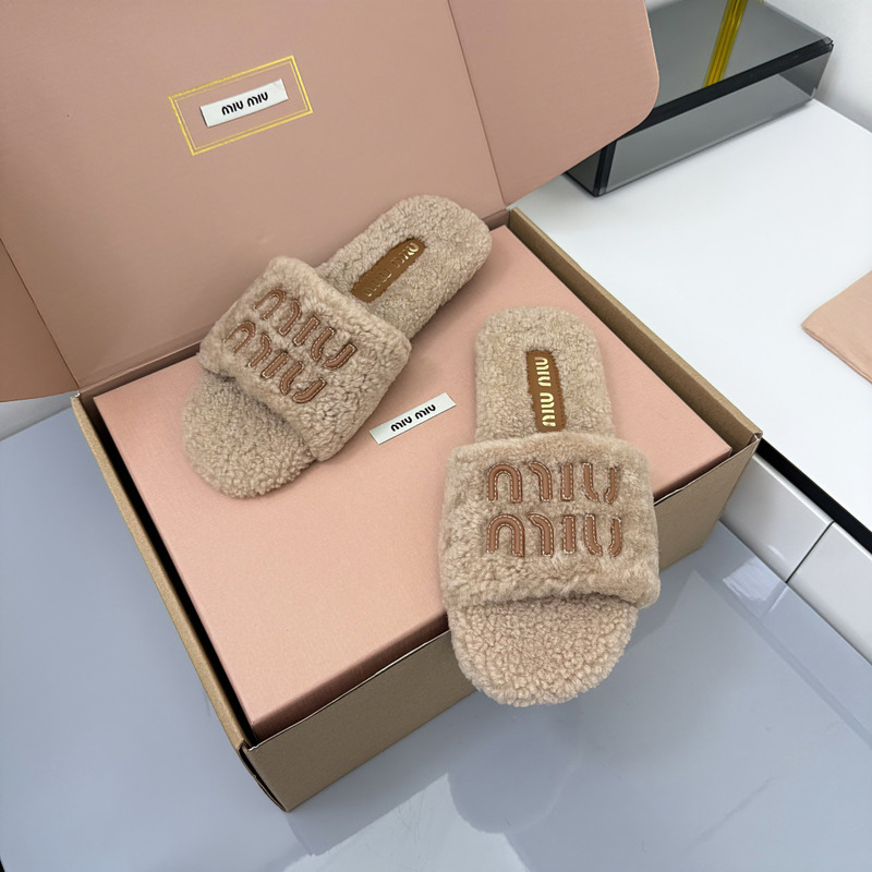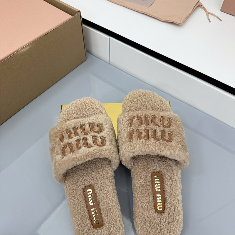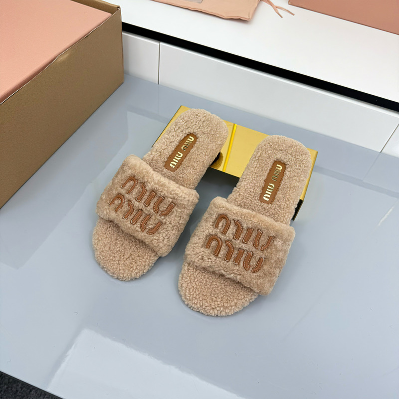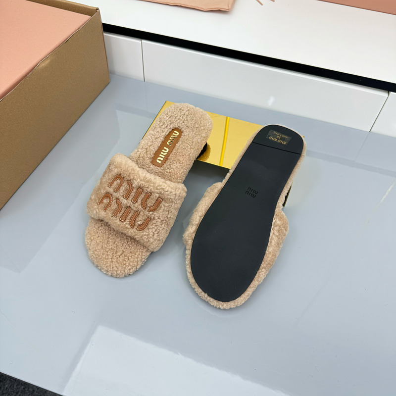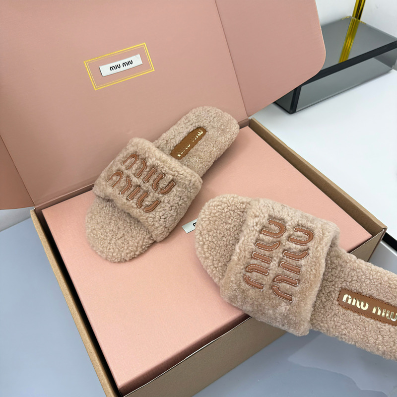 Miu Miu Shearling Slides In Beige With Leather Logo