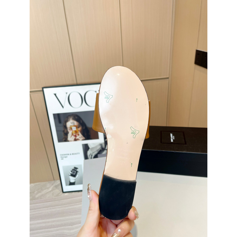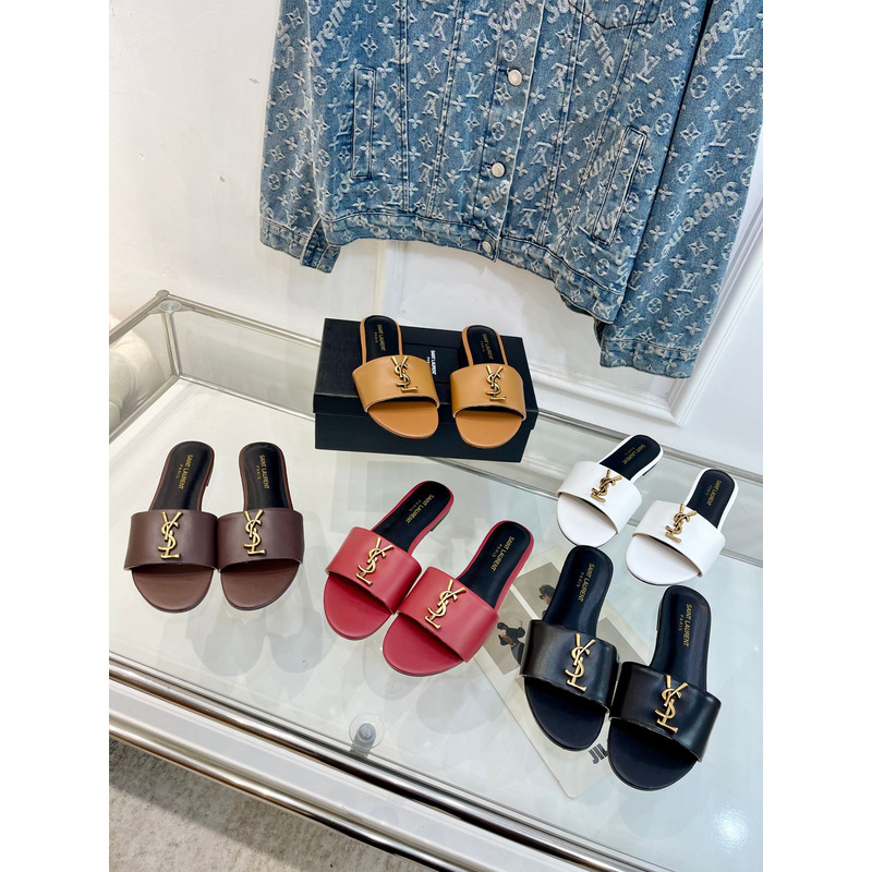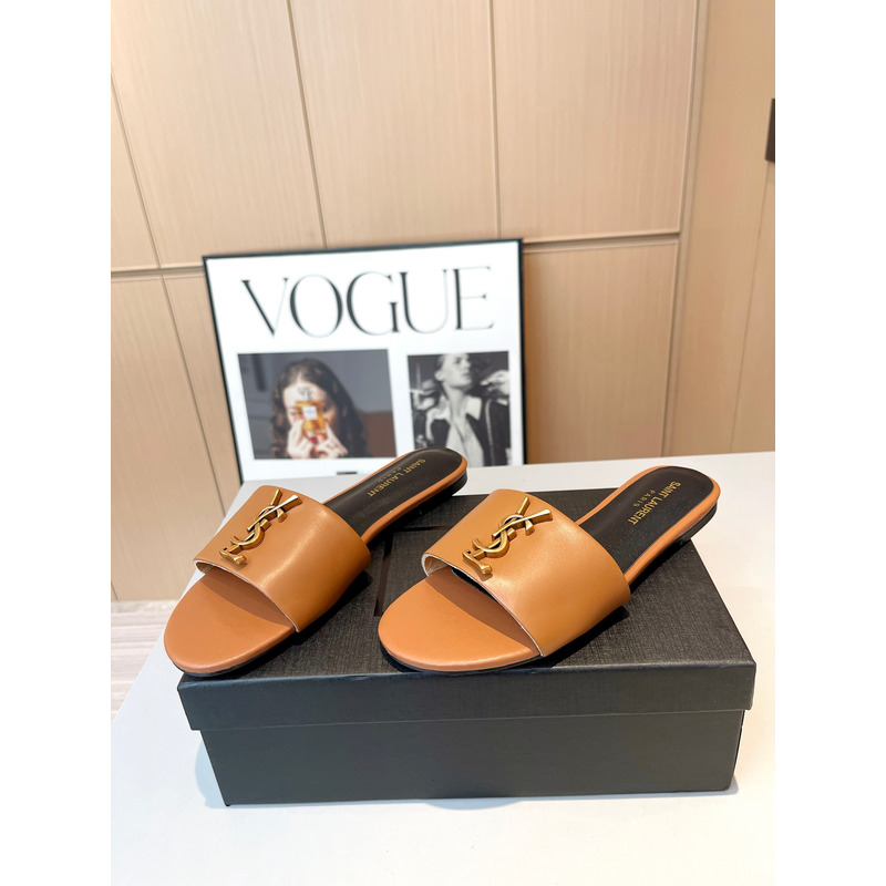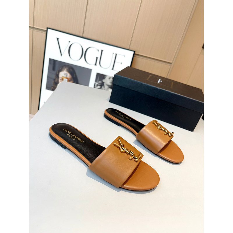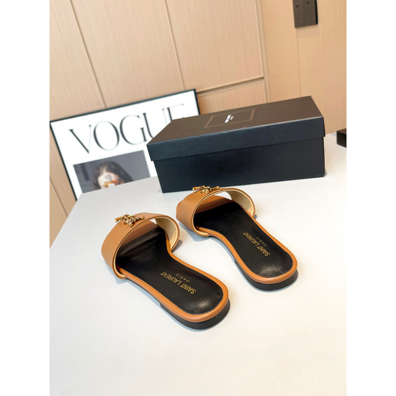 Saint Laurent Brown Leather Logo Flat Slide Sandals