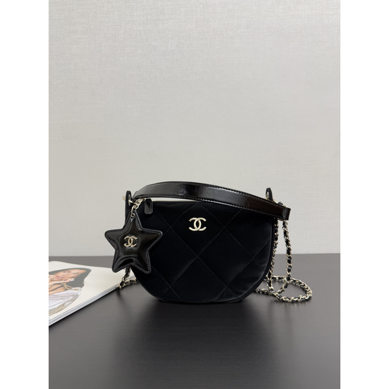 Chanel Chain Clutch Velvet Effect Nylon Shiny Finish Creased Calfskin With Gold Metal Black