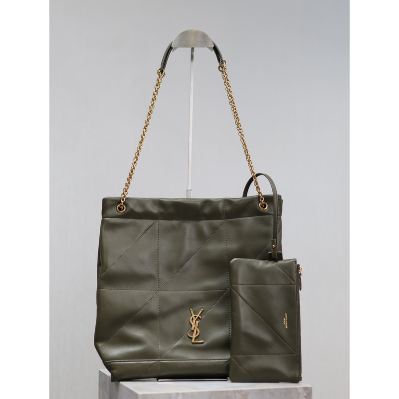 Saint Laurent Military Green Quilted Leather Tote Bag With Pouch And Gold Chain