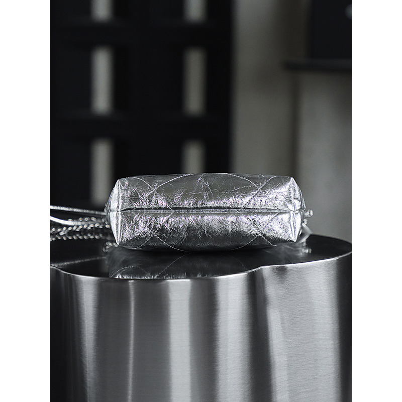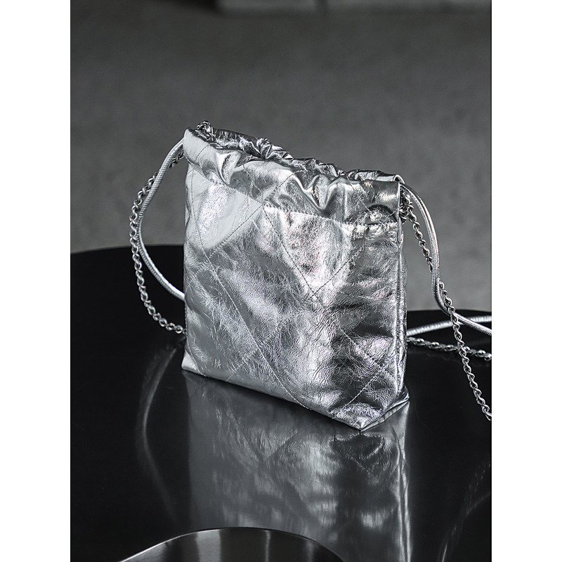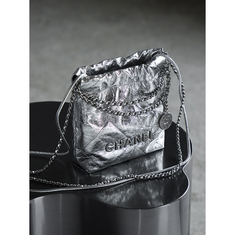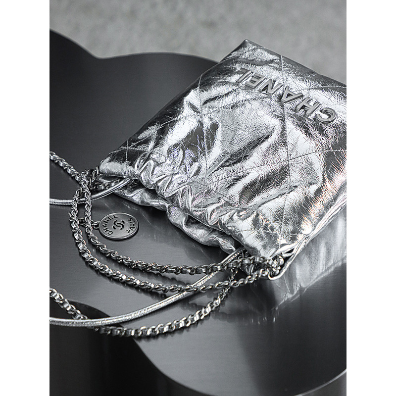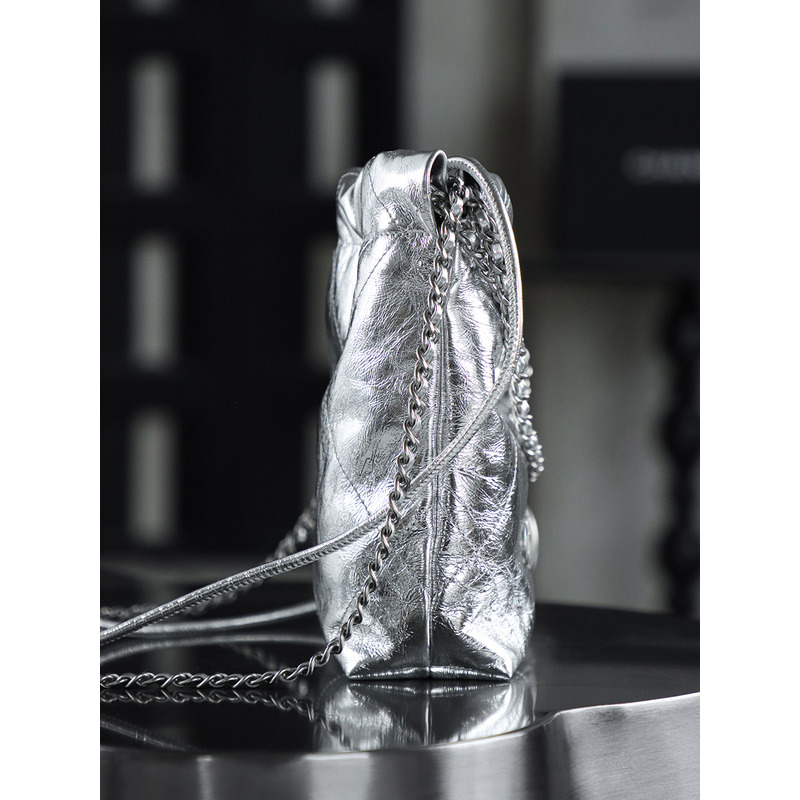 Chanel 22 Mini Handbag In Silver Shiny Calfskin 24K Silver-Tone Metal