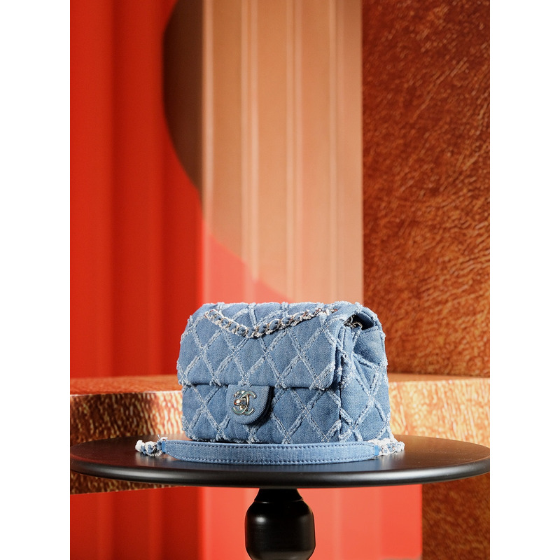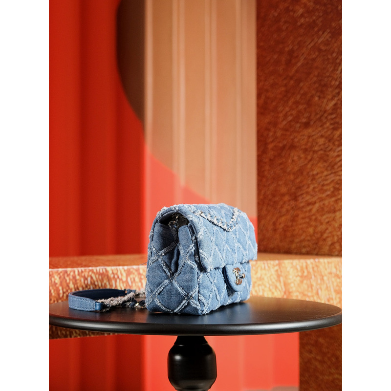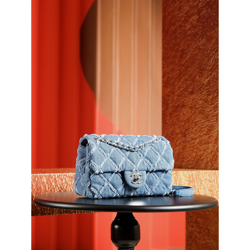 Chanel Small Light Blue Quilted Denim Chain Flap Bag with 24K Silver - Tone Hardware