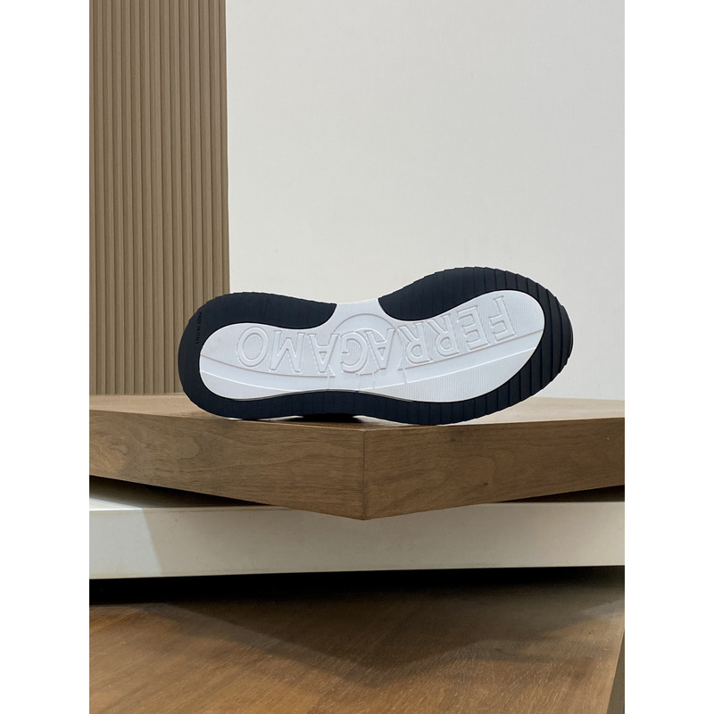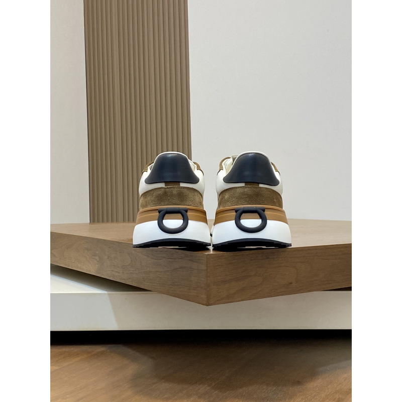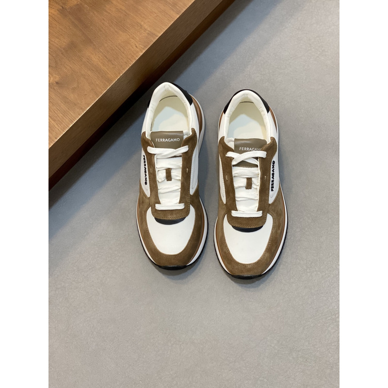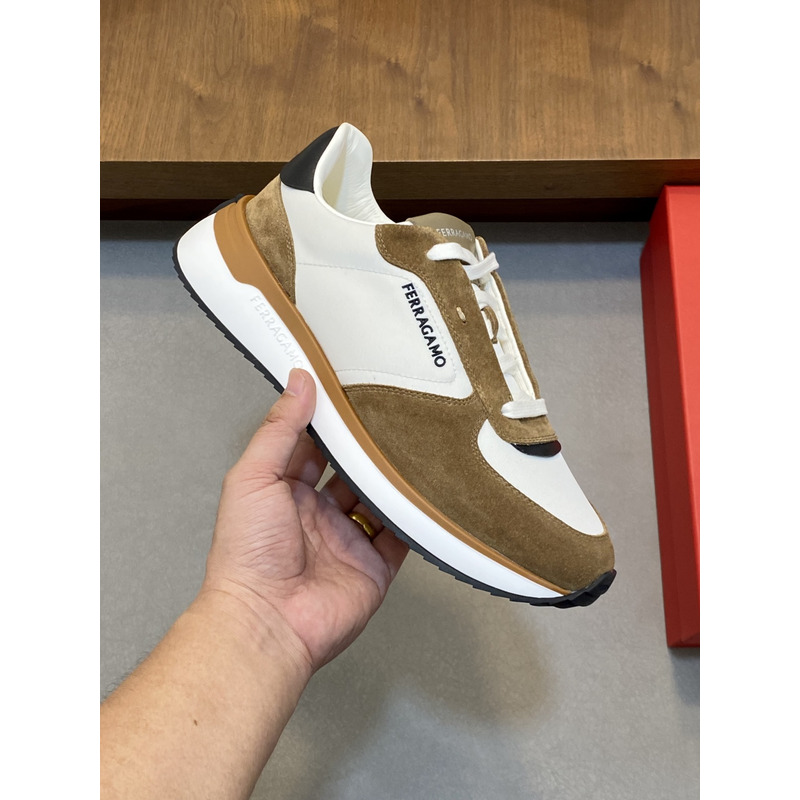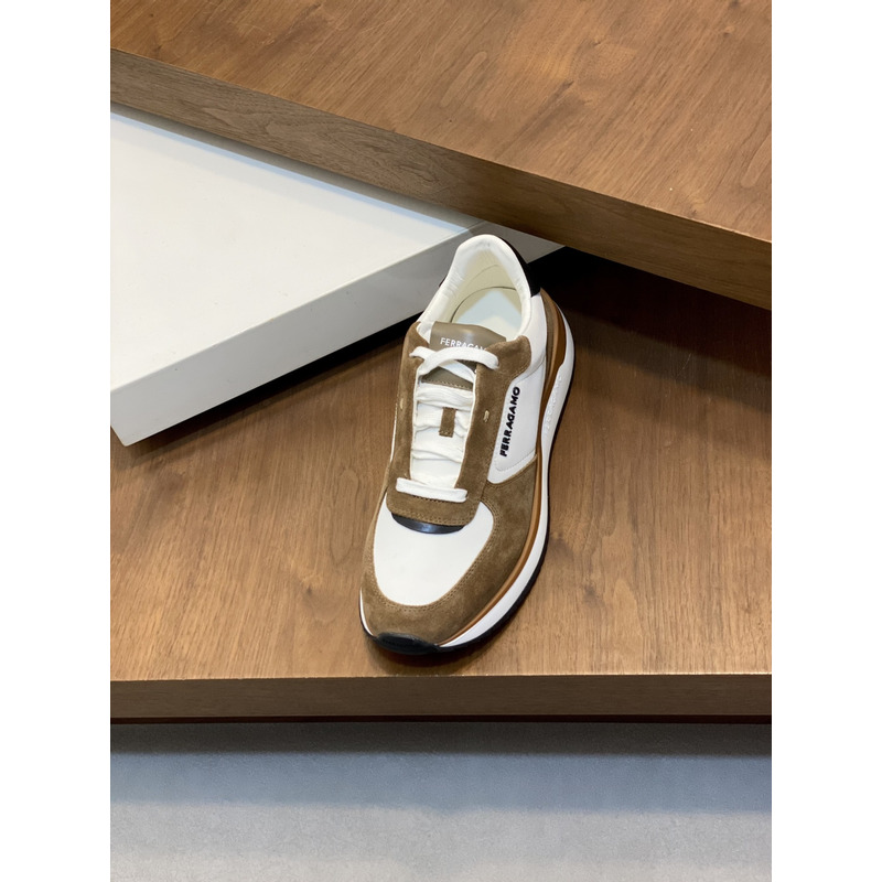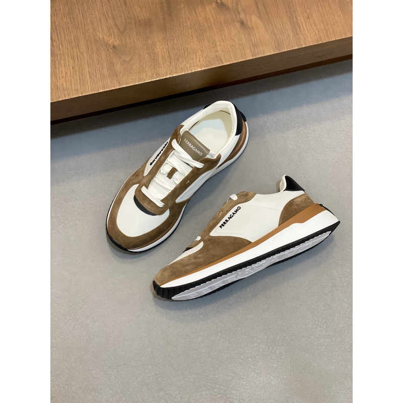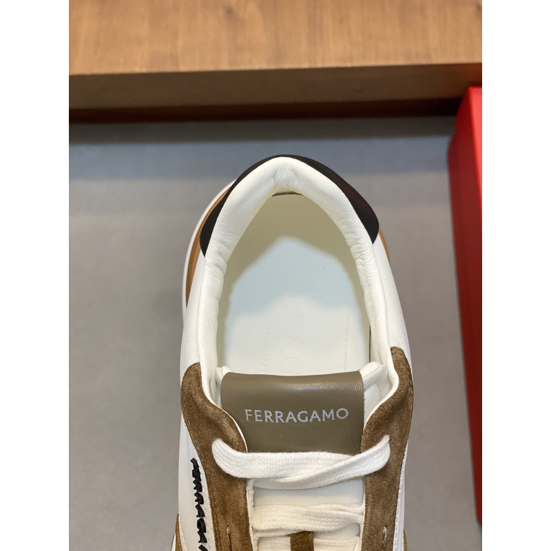 Ferragamo Low Cut Suede Sneaker Tan And White