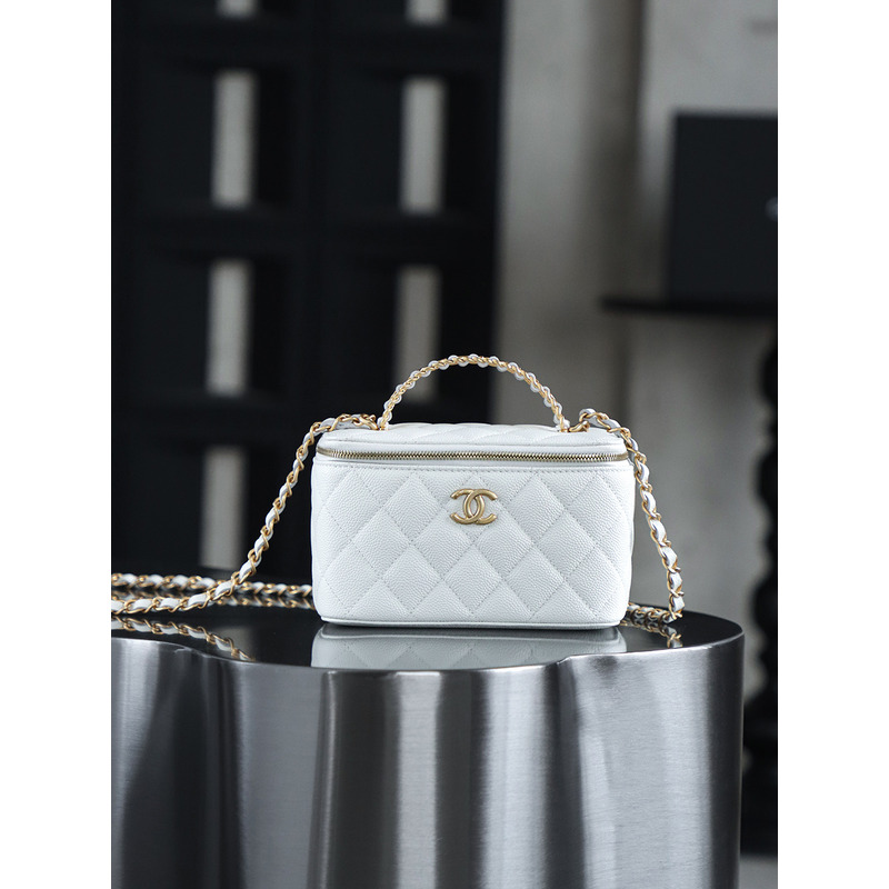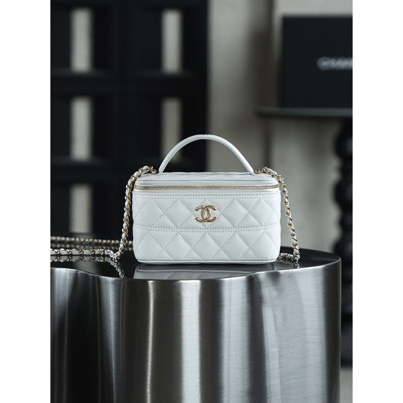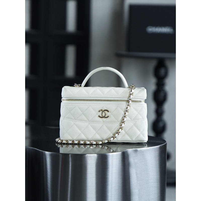 Chanel Quilted Lambskin Vanity Case with Top Handle In White 24K Gold