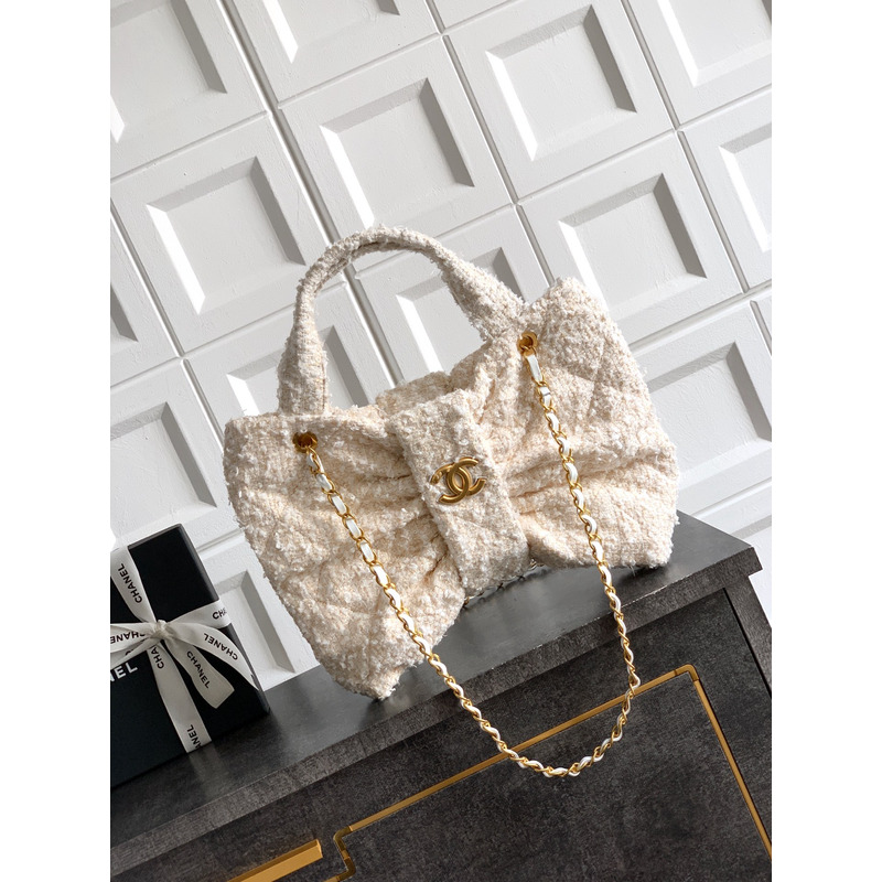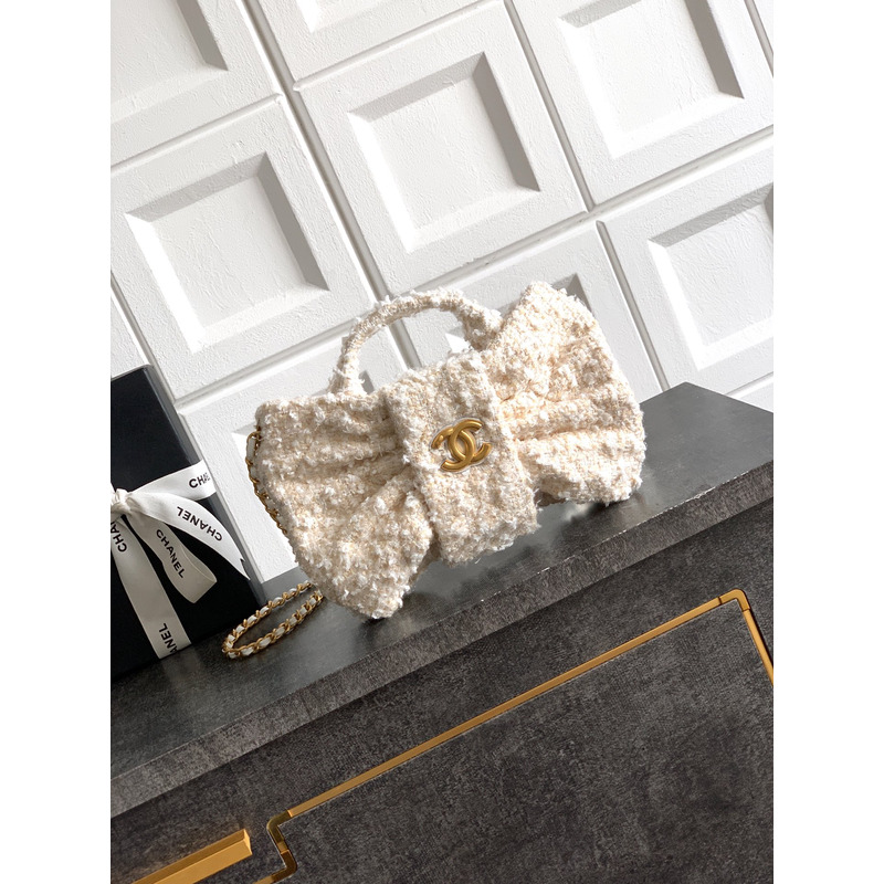 Chanel Large Tweed Bow Flap Bag With Chain Strap In Ivory White