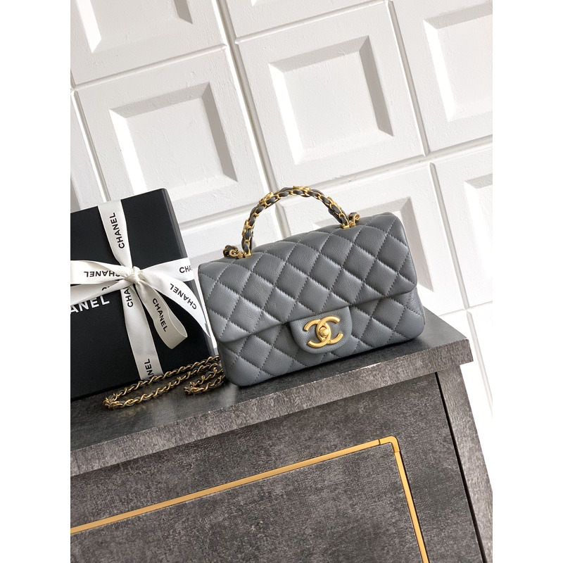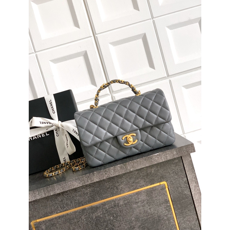 Chanel Small Classic Flap Bag With Top Handle Leather In Grey