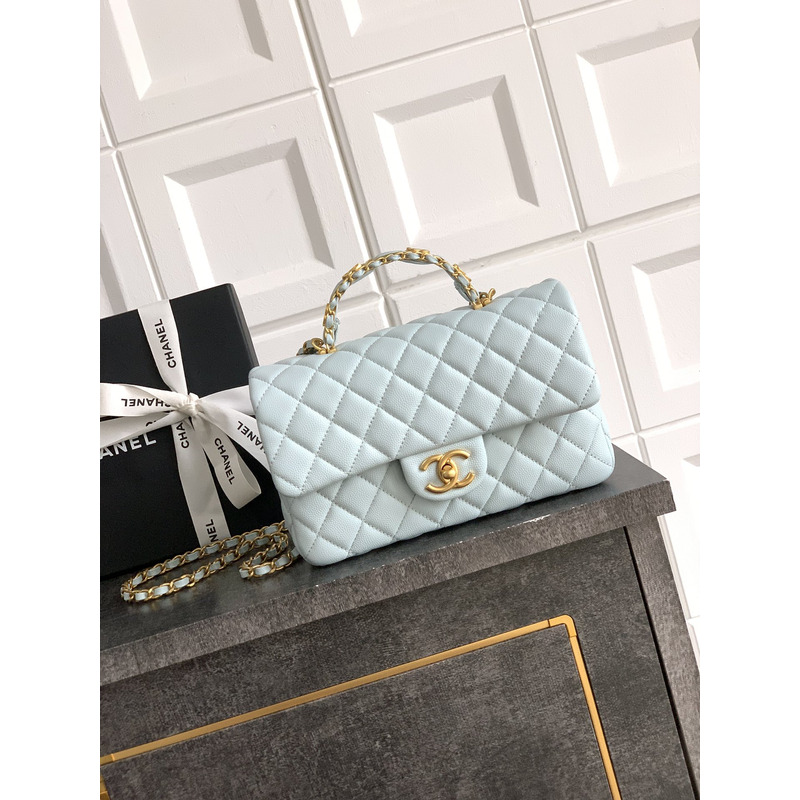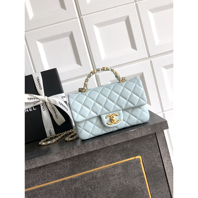 Chanel Small Classic Flap Bag With Top Handle Leather In Light Blue