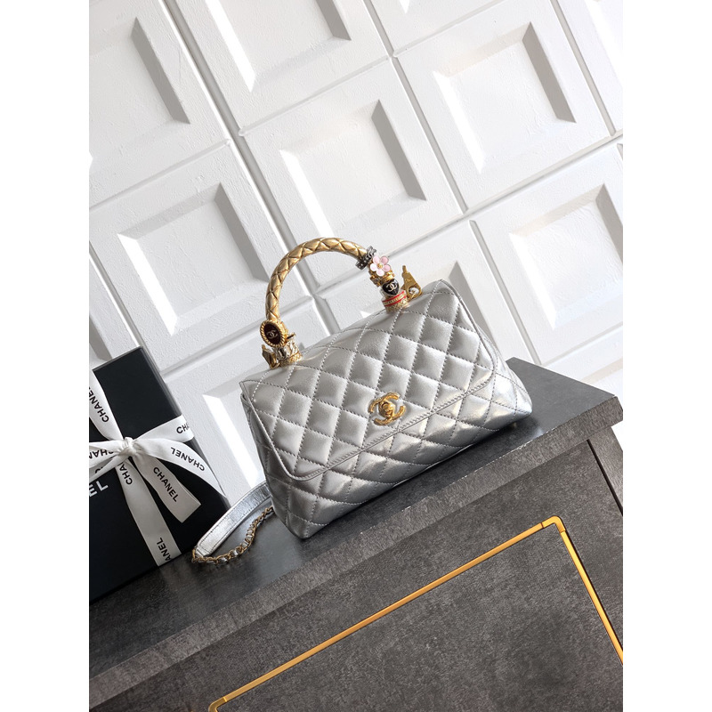 Chanel Medium Quilted Metallic Top Handle Flap Bag With Embellished Handle In Metallic Silver
